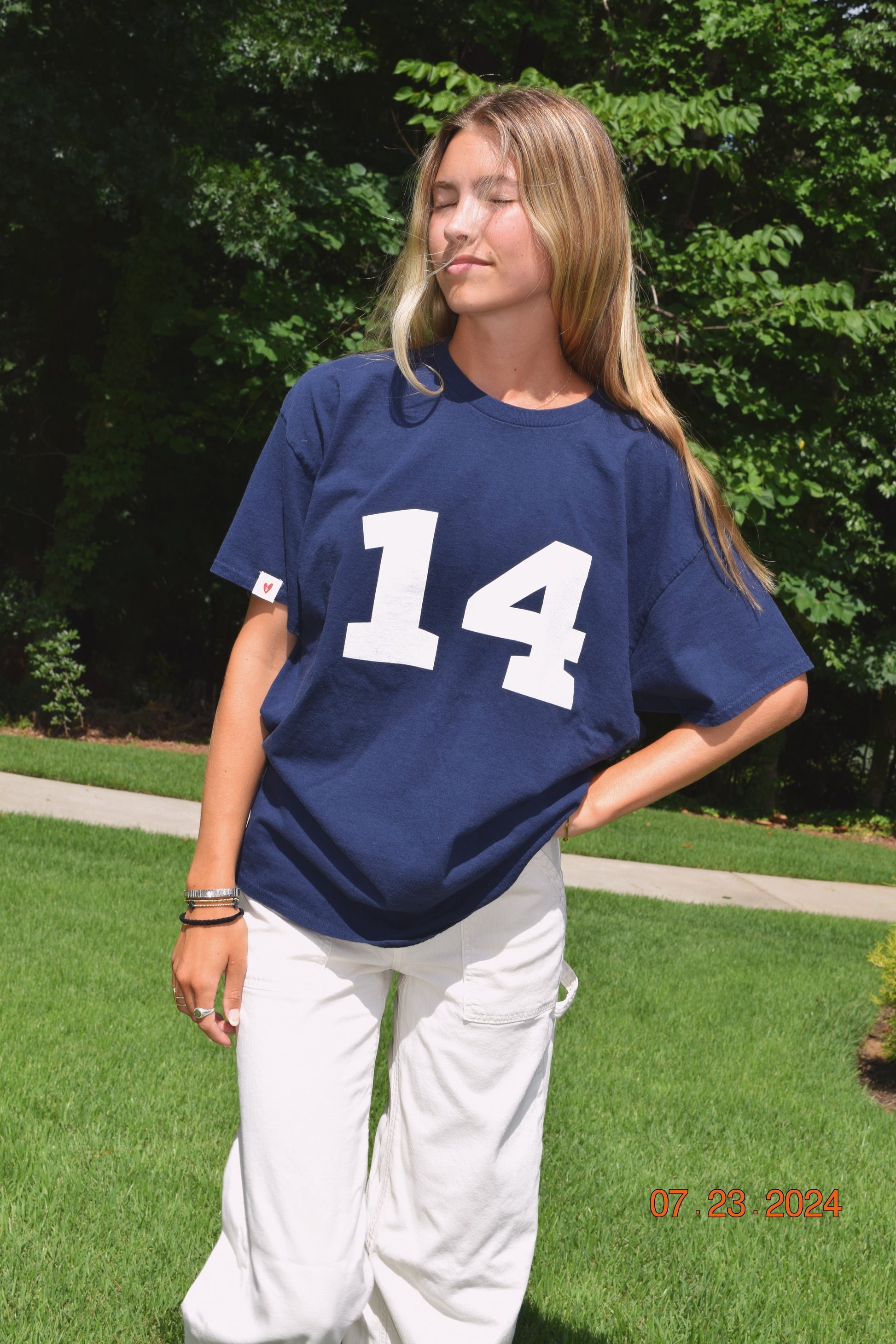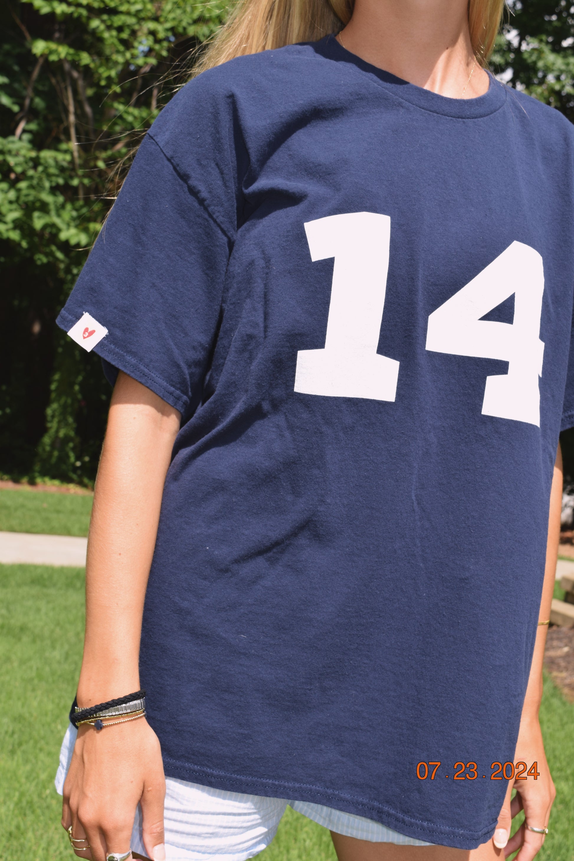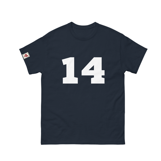 Featuring a bold, impactful design, this tee displays the number 14 in large, eye-catching lettering on the front. You'll notice a small, thoughtful detail: a discreet label stitched with the number "3". This subtle touch symbolizes our company's ethos, inspired by Colossians 3:14 which instructs us to "put on love" as it is the greatest garment we can wear.