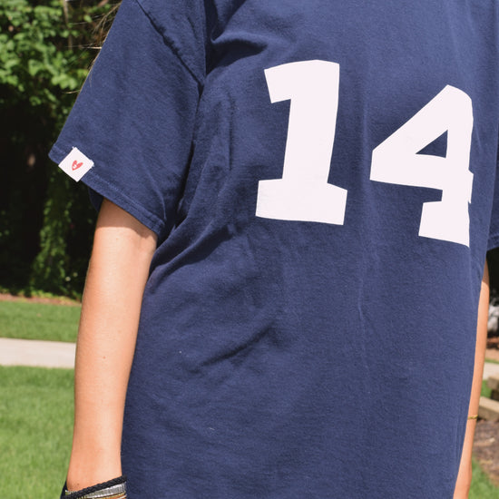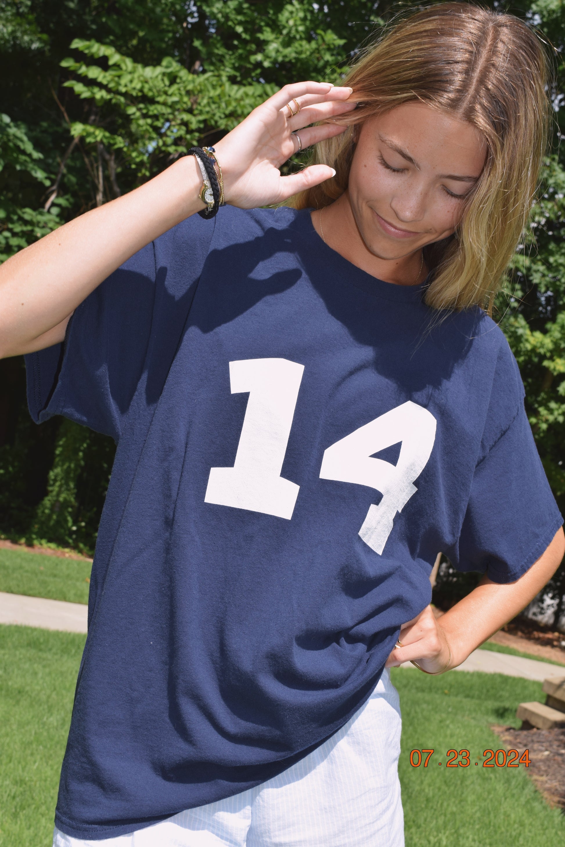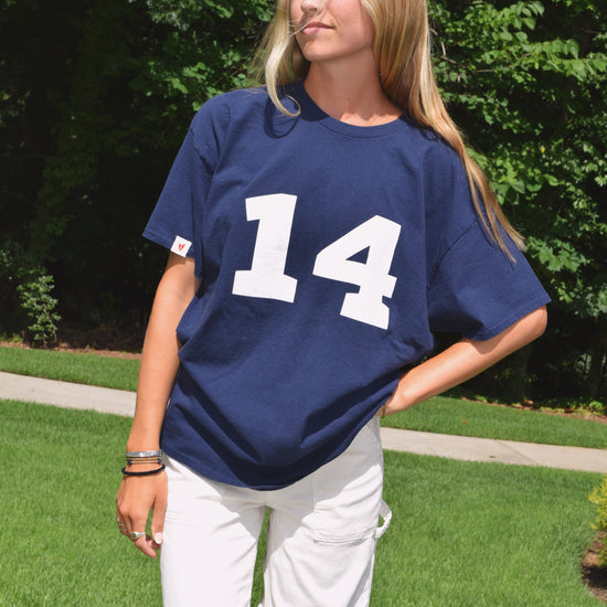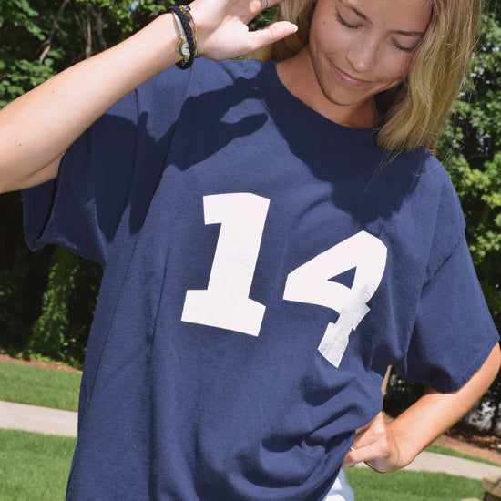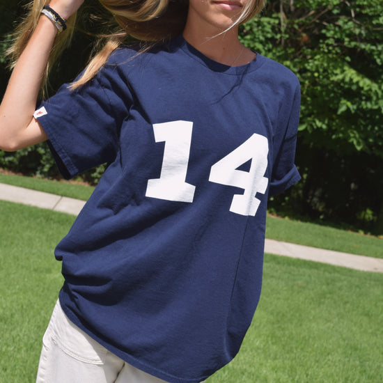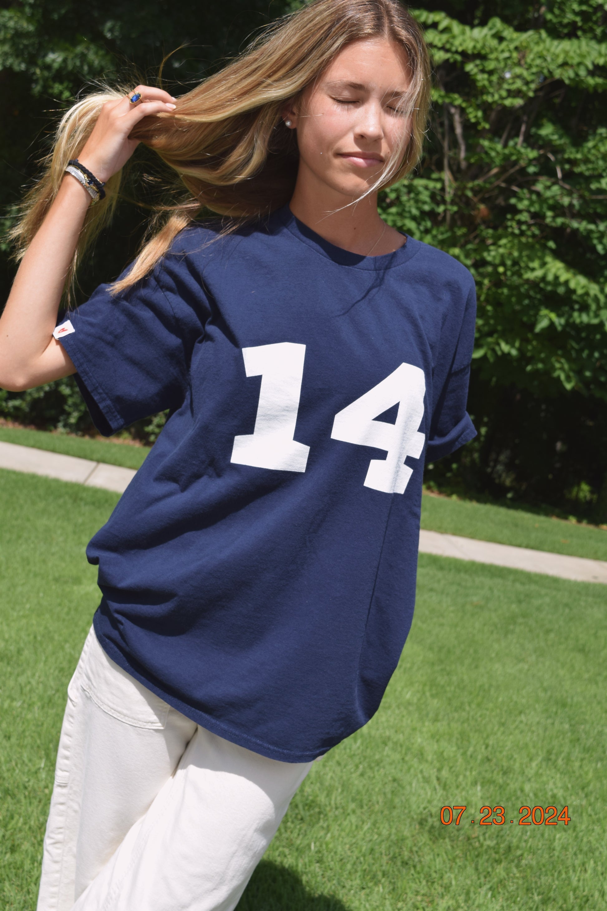Featuring a bold, impactful design, this tee displays the number 14 in large, eye-catching lettering on the front. You'll notice a small, thoughtful detail: a discreet label stitched with the number "3". This subtle touch symbolizes our company's ethos, inspired by Colossians 3:14 which instructs us to "put on love" as it is the greatest garment we can wear.