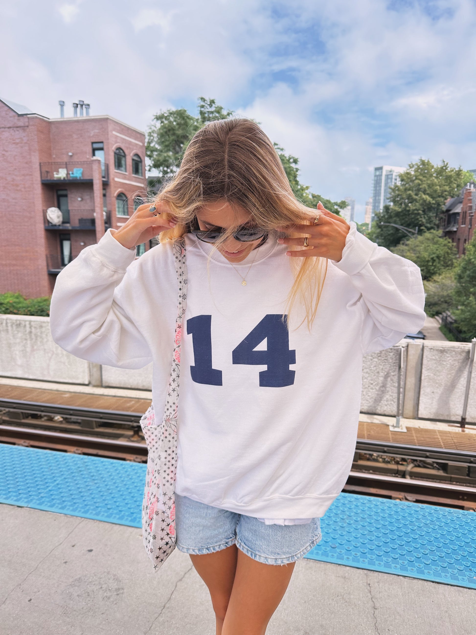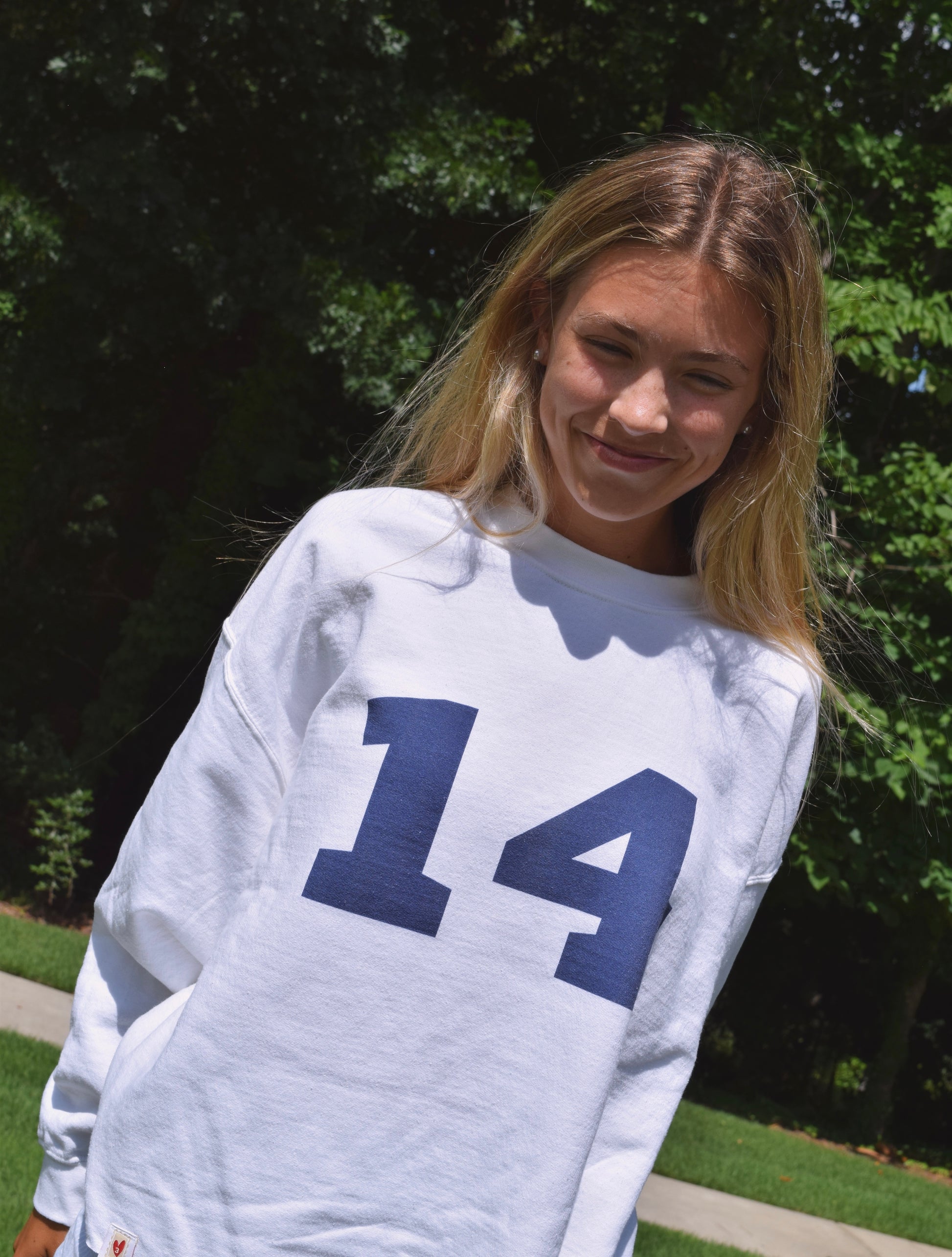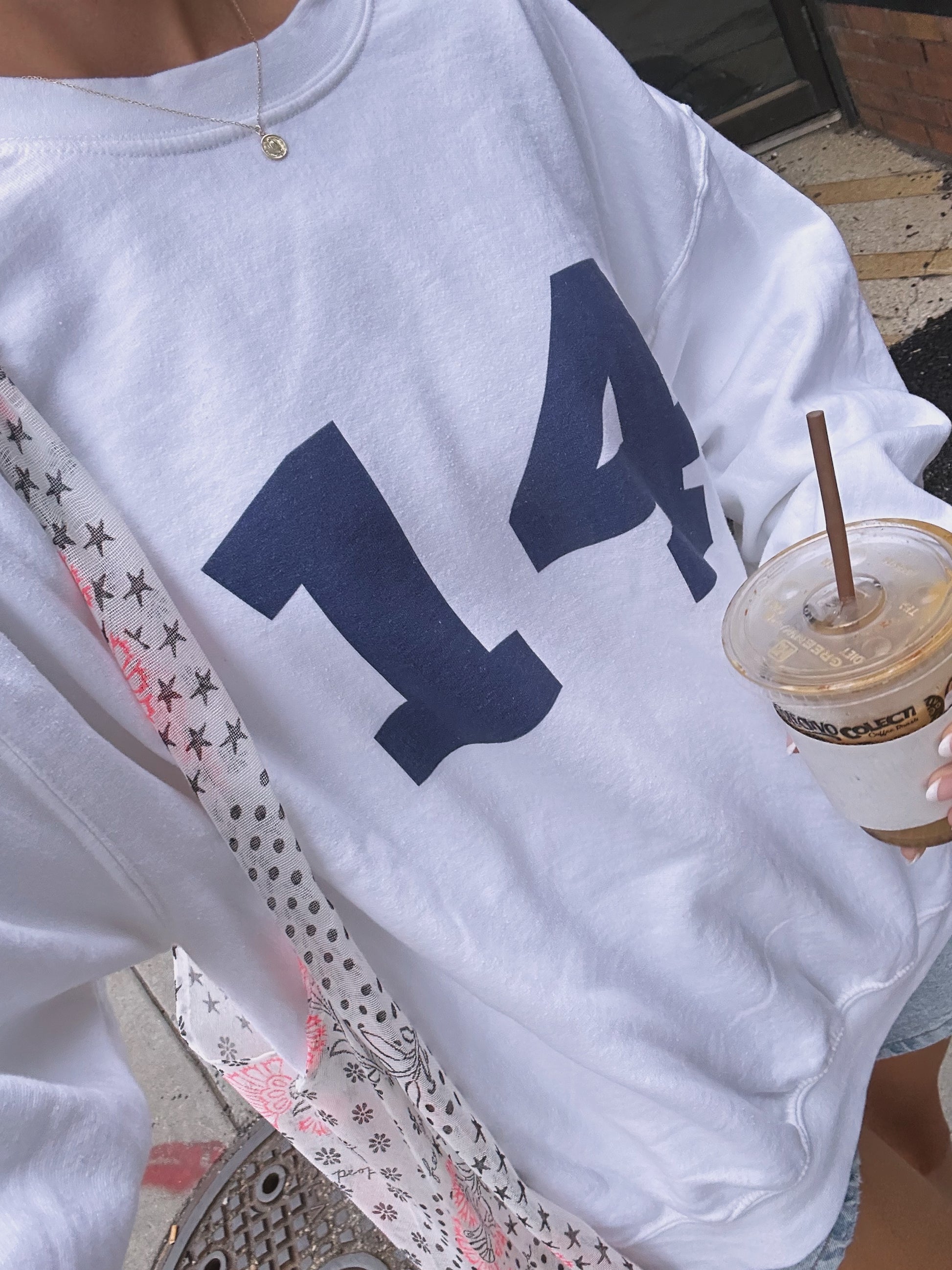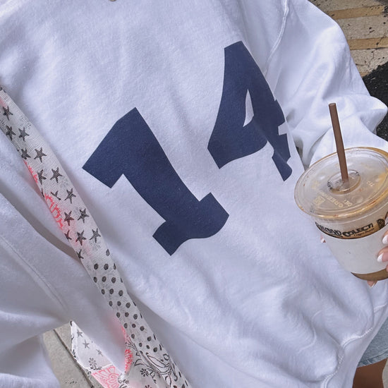 Featuring a bold, impactful design, this crewneck displays the number 14 in large, eye-catching lettering on the front. You'll notice a small, thoughtful detail: a discreet label stitched with the number "3". This subtle touch symbolizes our company's ethos, inspired by Colossians 3:14 which instructs us to "put on love" as it is the greatest garment we can wear.