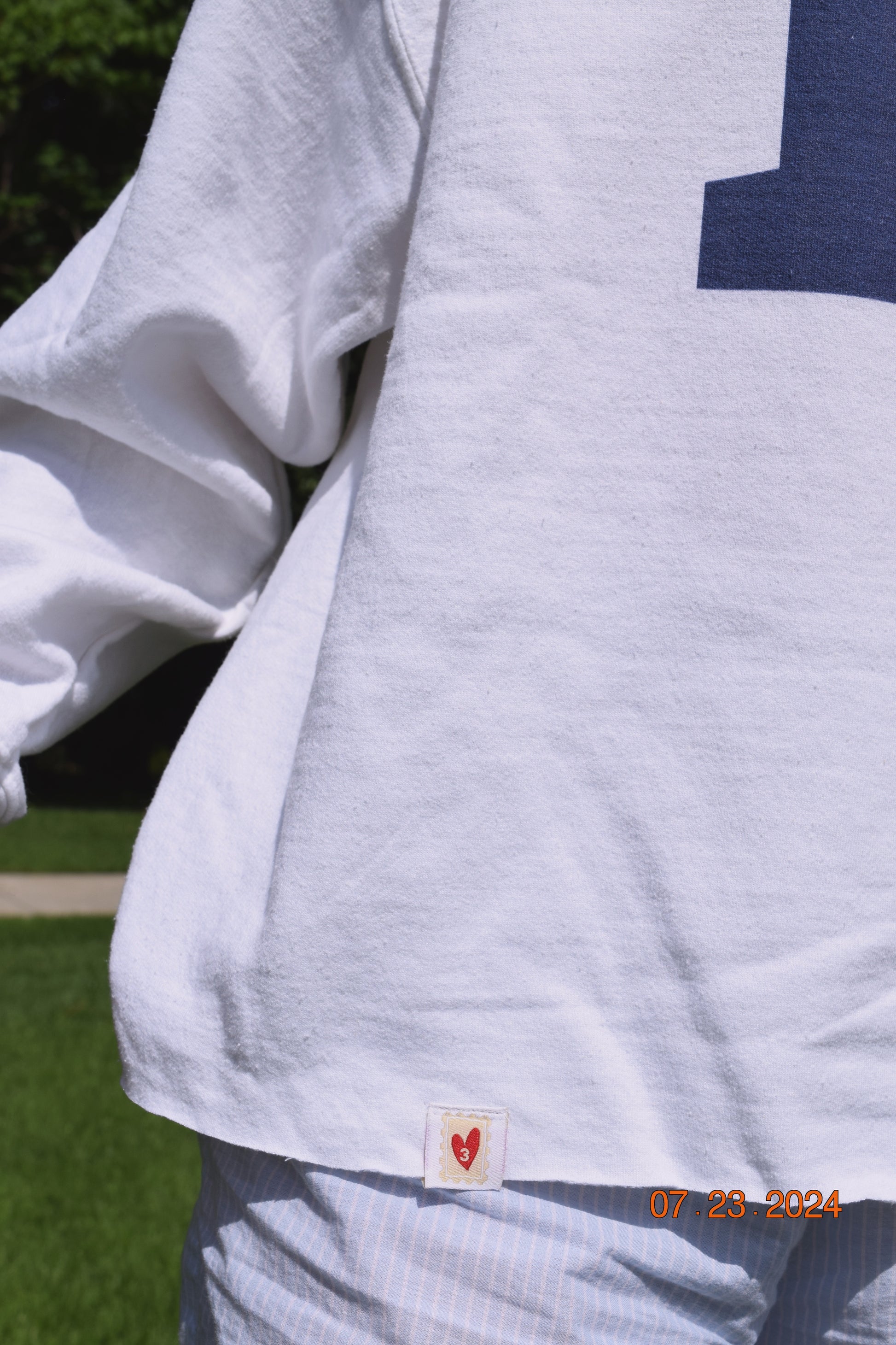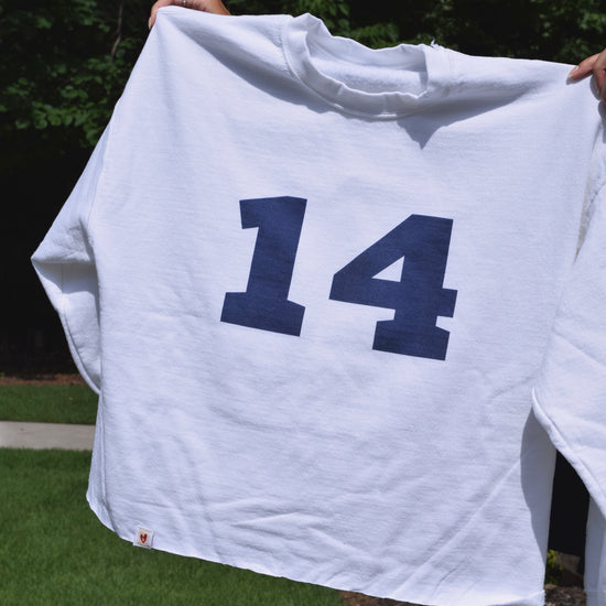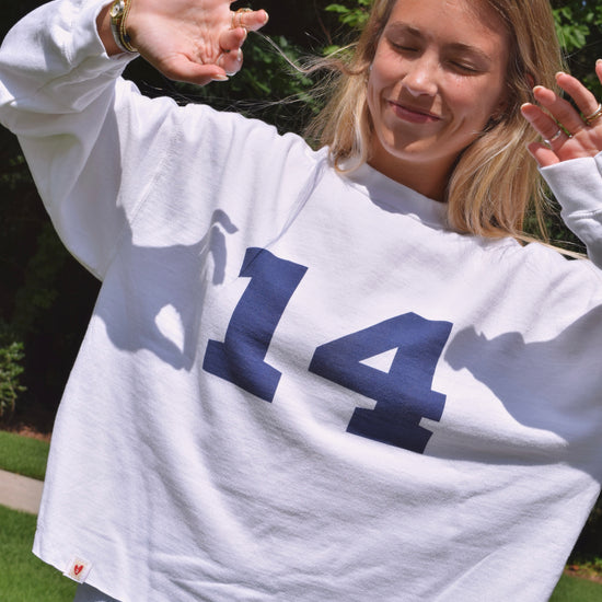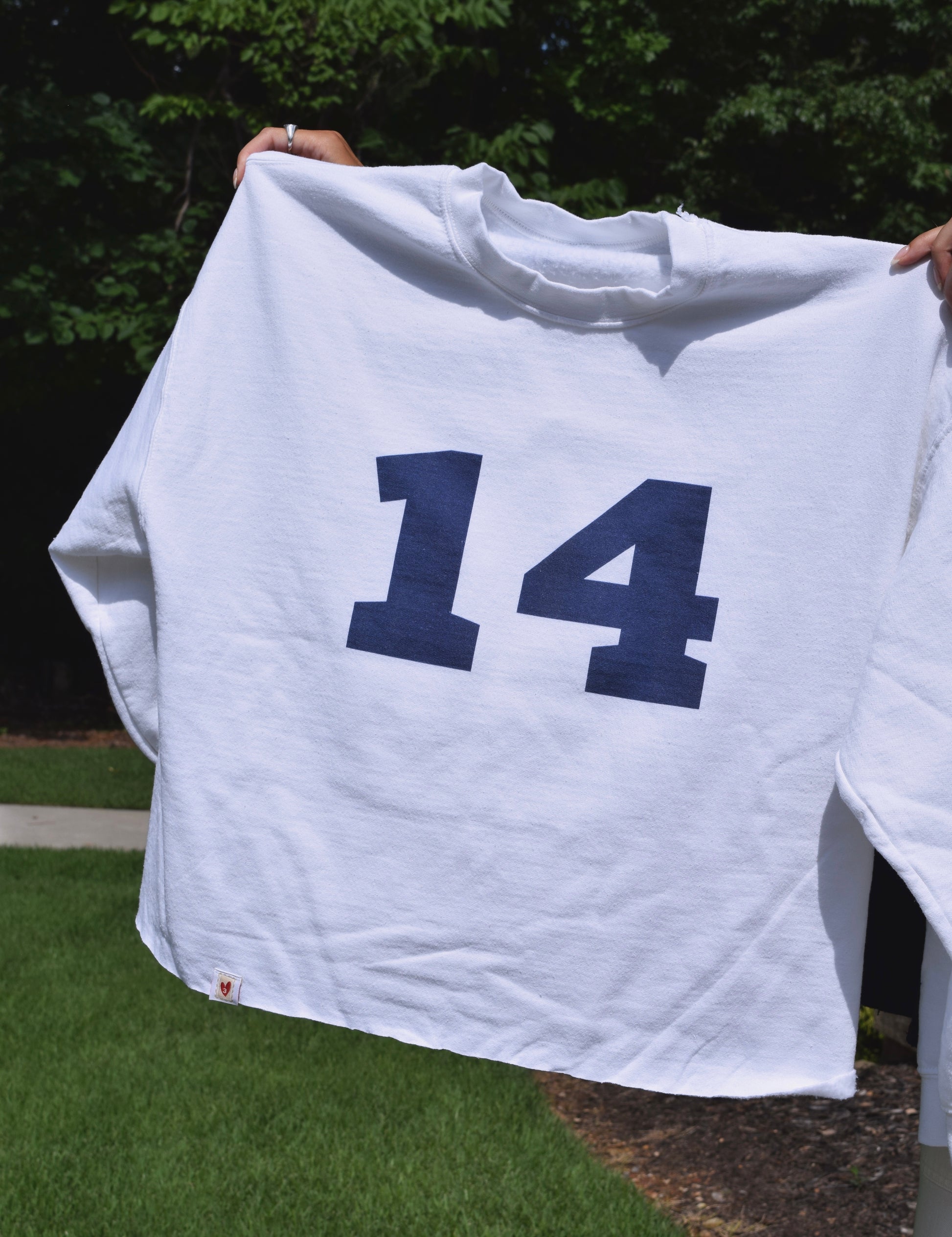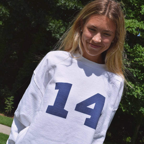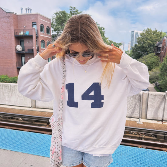 Featuring a bold, impactful design, this crewneck displays the number 14 in large, eye-catching lettering on the front. You'll notice a small, thoughtful detail: a discreet label stitched with the number "3". This subtle touch symbolizes our company's ethos, inspired by Colossians 3:14 which instructs us to "put on love" as it is the greatest garment we can wear.