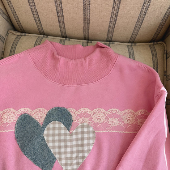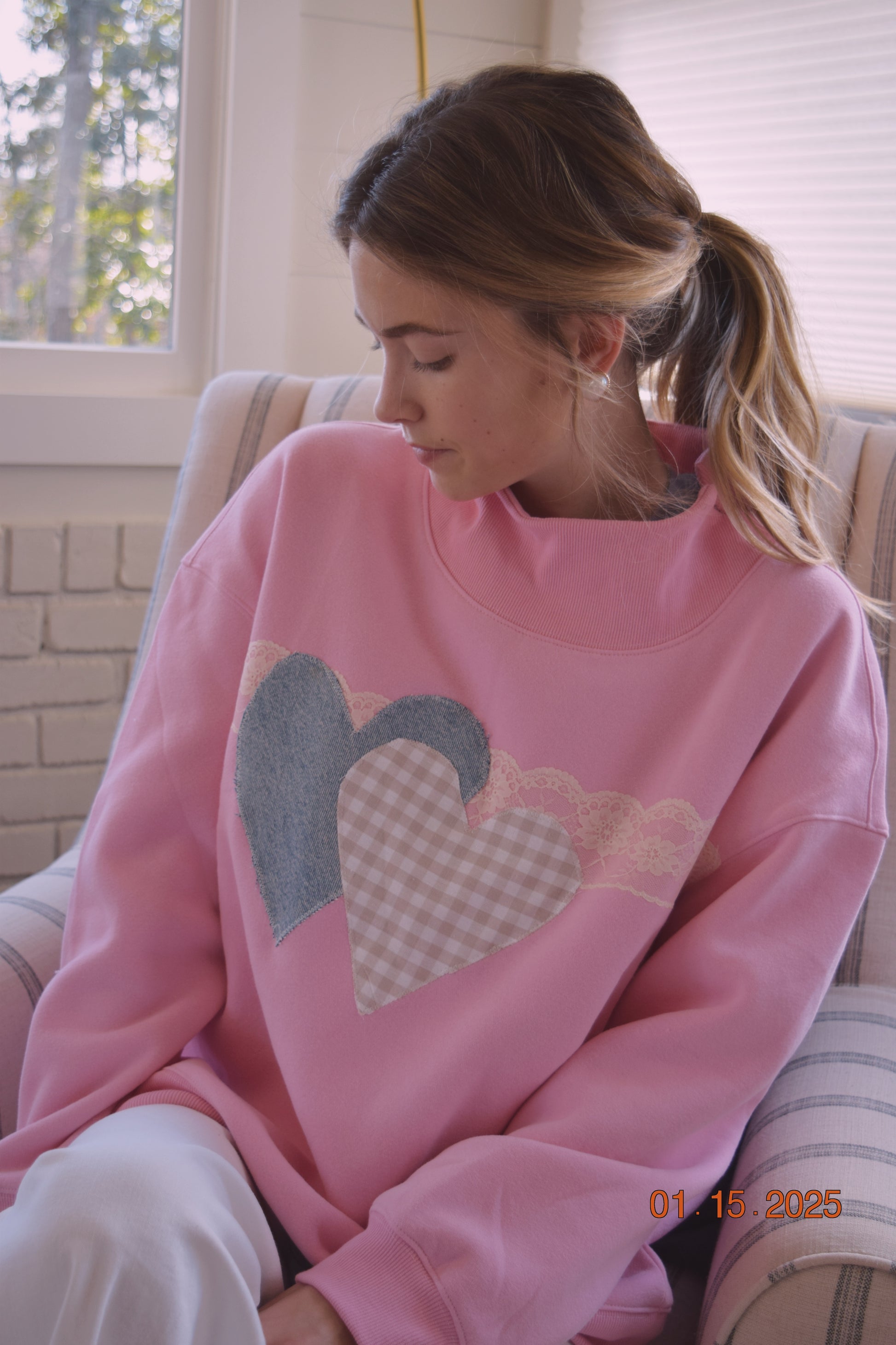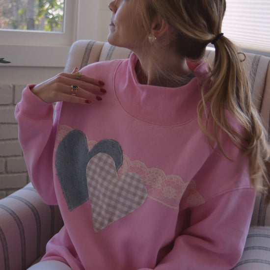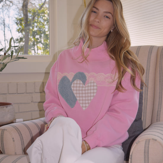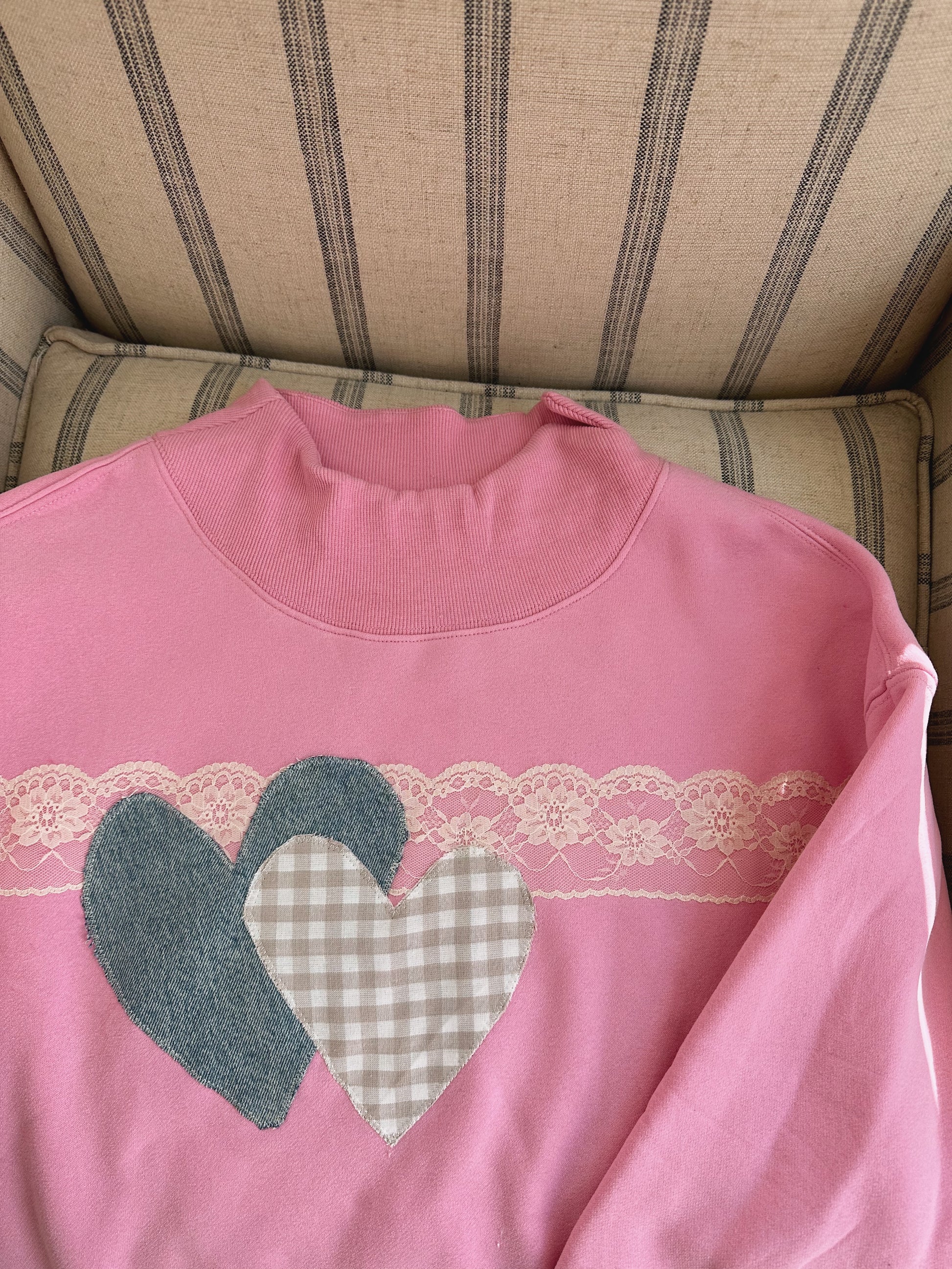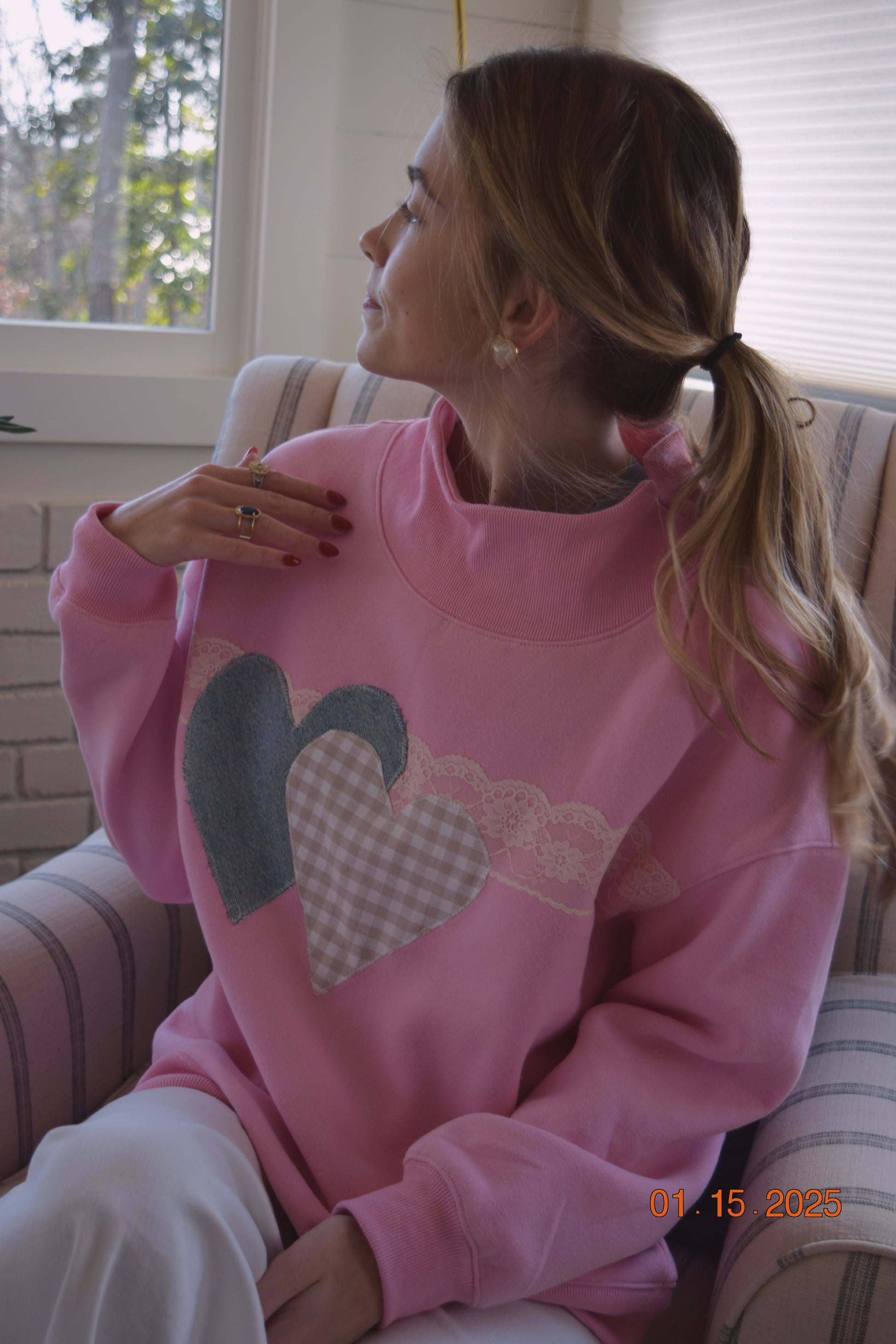 Cozy up in this baby pink mock neck for Valentine’s Season! Featuring hearts and lace, this piece is sure to be the statement of the season.