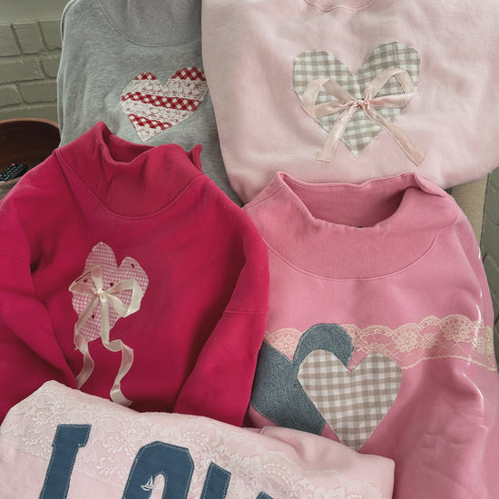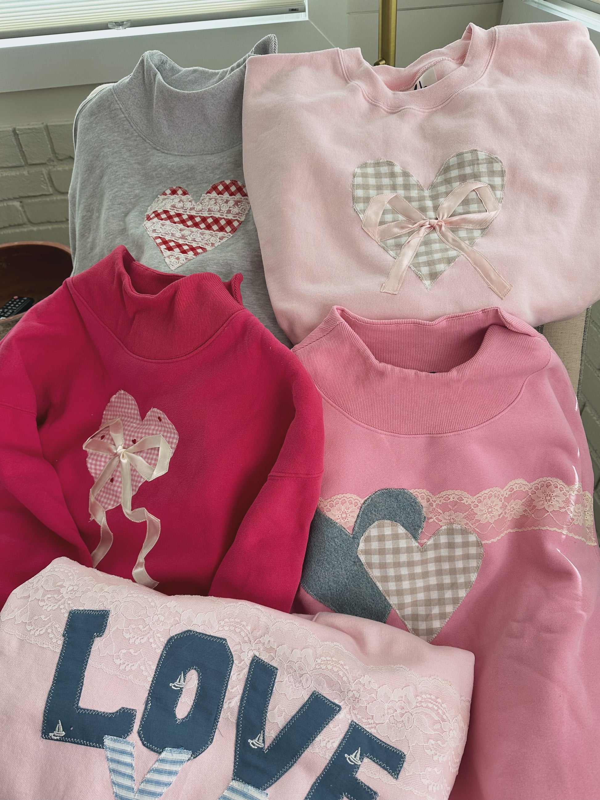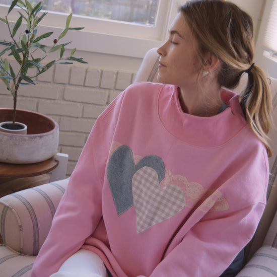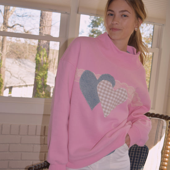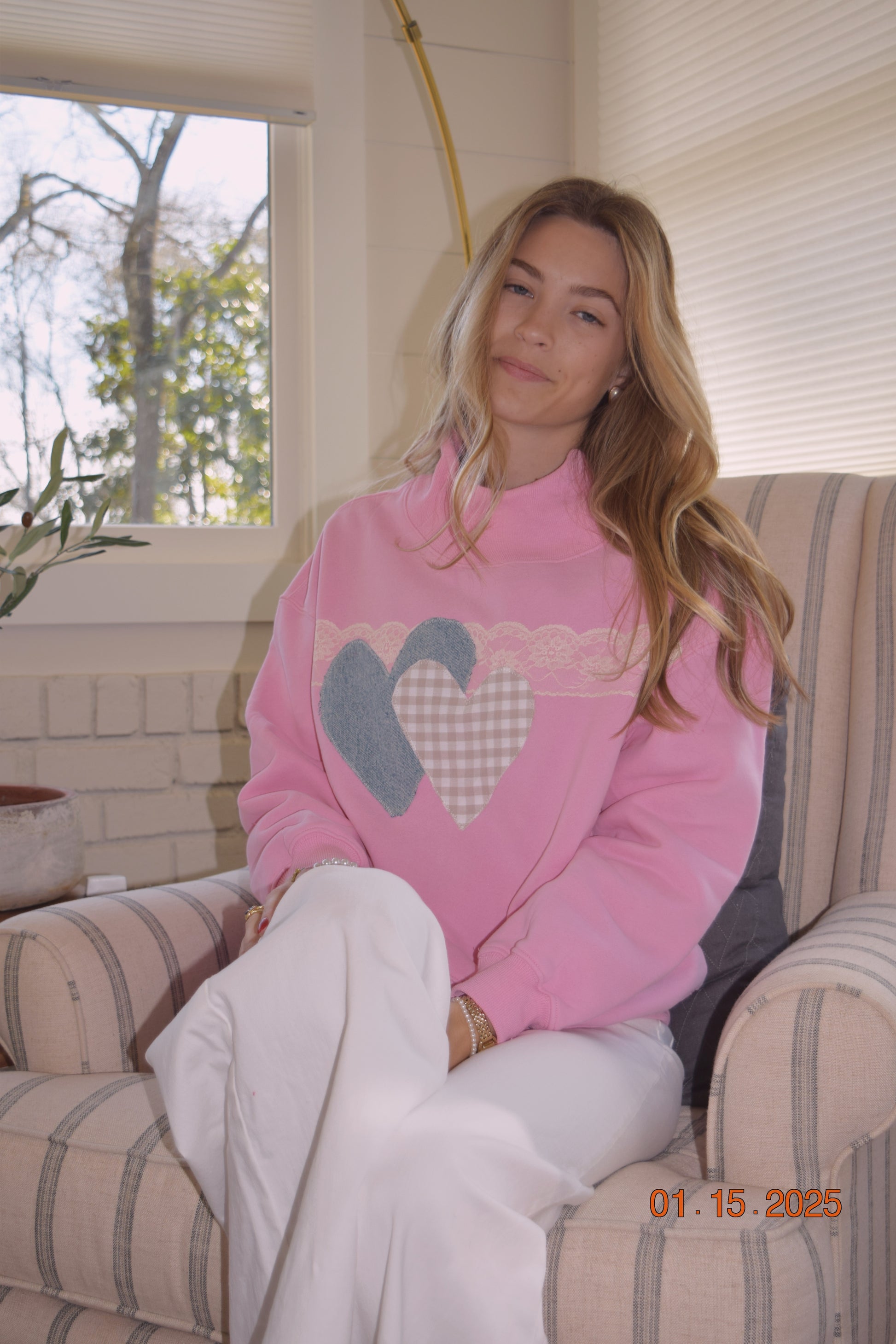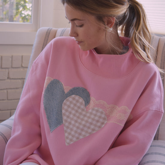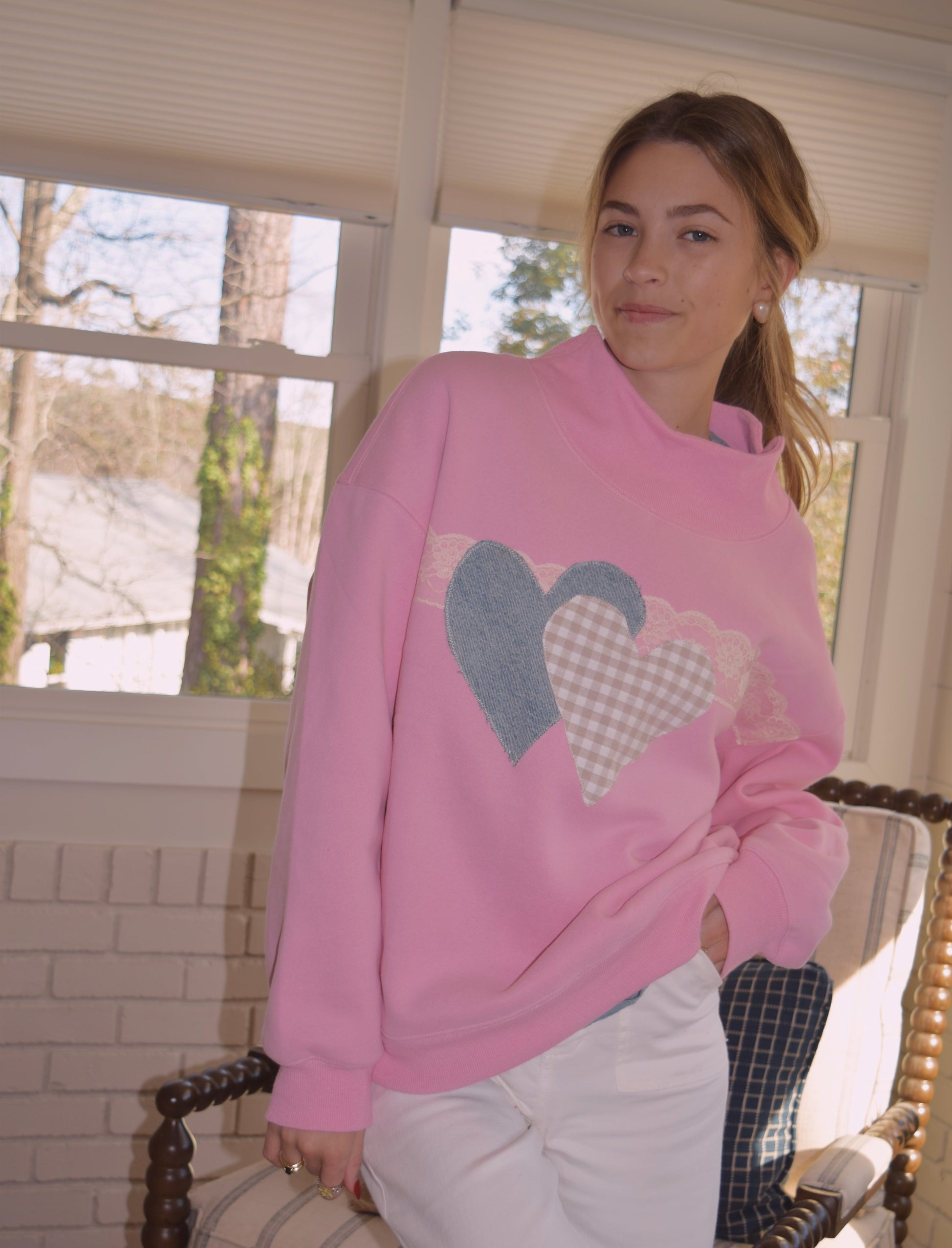 Cozy up in this baby pink mock neck for Valentine’s Season! Featuring hearts and lace, this piece is sure to be the statement of the season.