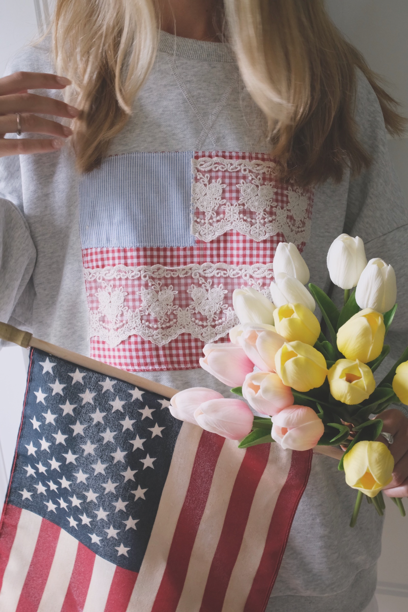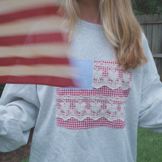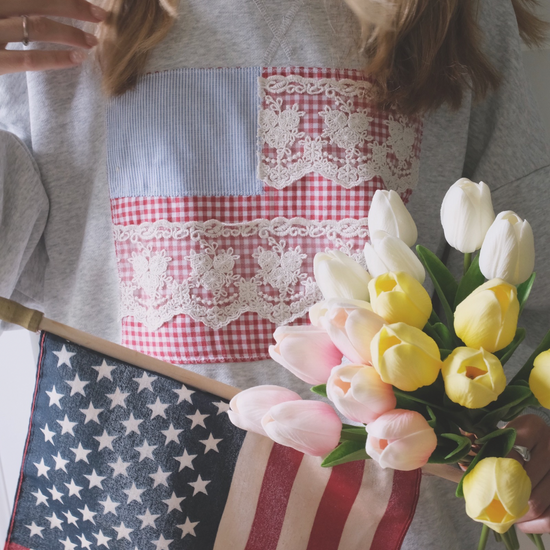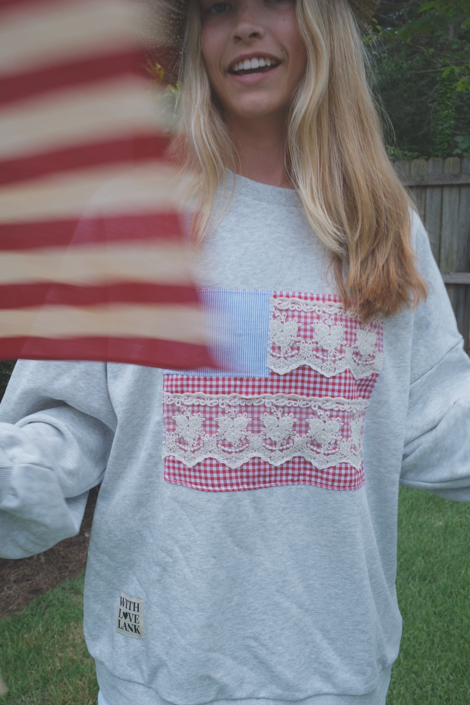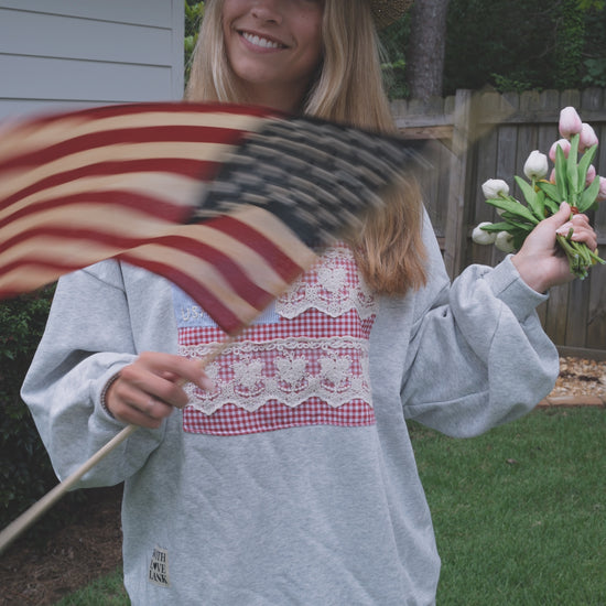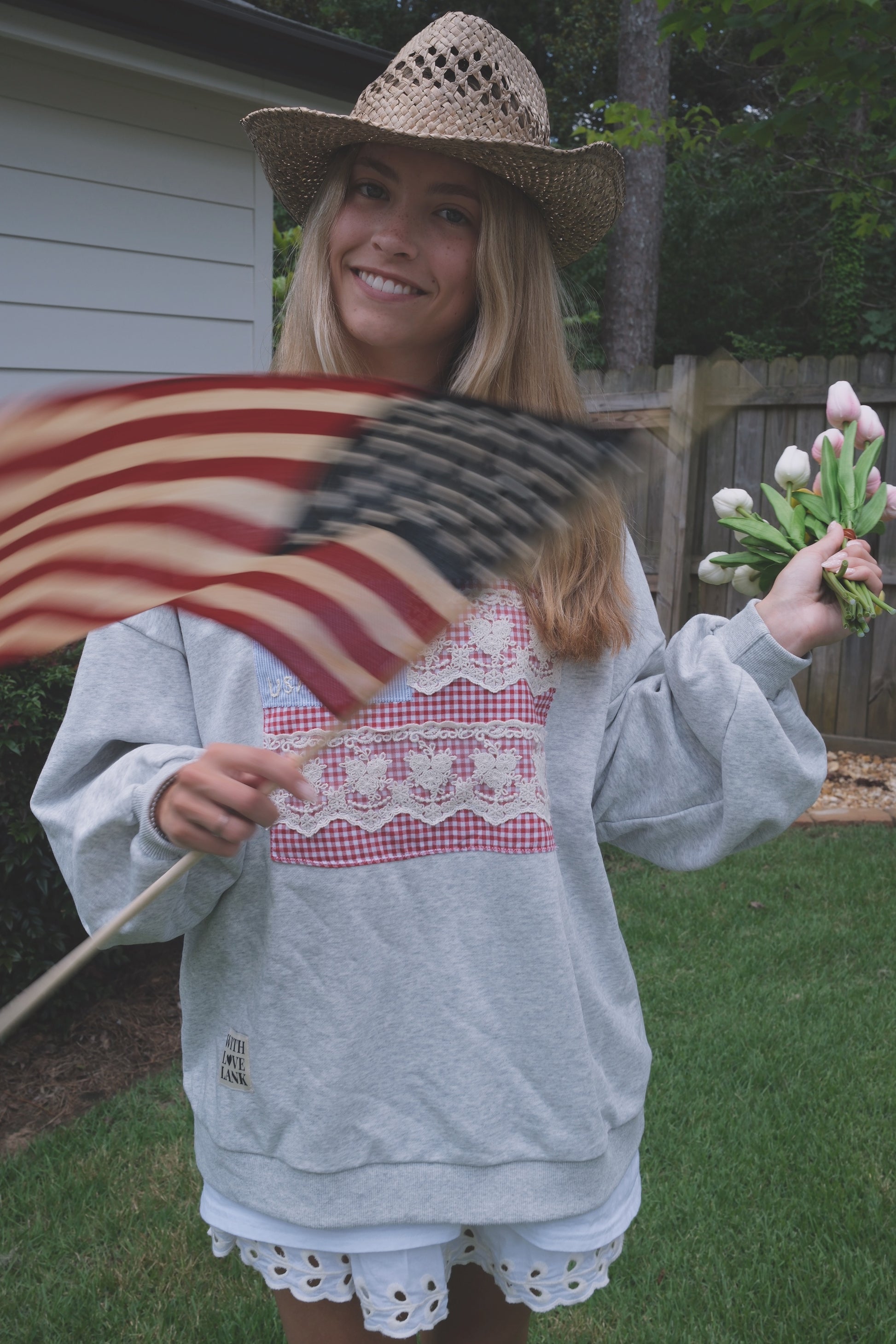 This cozy crewneck is all about comfort and pride! Each one is one of a kind and features a handmade American flag. Perfect to throw on over any summer outfit! Tag us @withlovelank to show off your stylings.