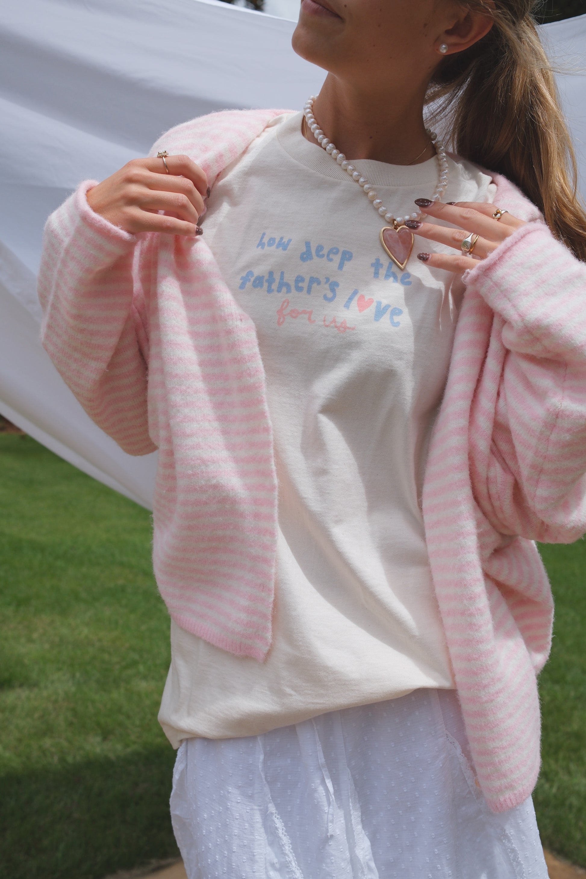 A timeless hymn, hand-sketched with love. This tee carries the words of “How Deep the Father’s Love for Us” in a whimsical script! Printed on our soft, lived-in cotton. Designed to be a wearable reminder of God’s unshakable love. Pairs effortlessly with denim, skirts, or layered under your favorite W🤍L crewneck.