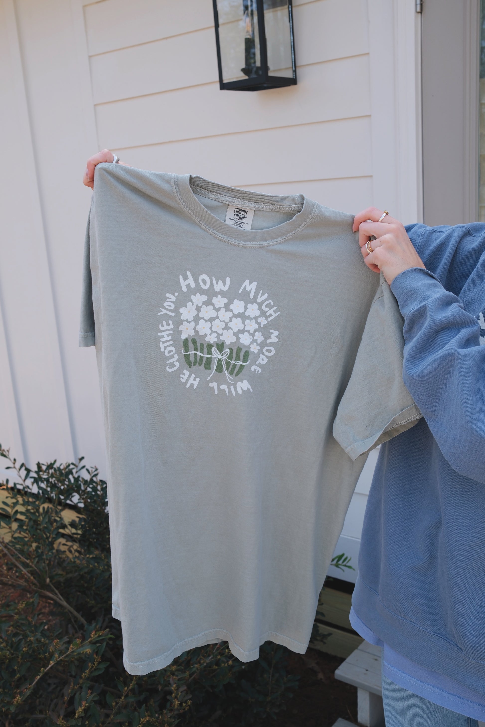 Carry a message of faith and comfort wherever you go with our "How Much More Will He Clothe You?" t-shirt, inspired by Matthew 6:30. This classic, unisex tee in a soft bay green is designed for ultimate comfort with a soft, breathable fabric that feels as good as it looks. The simple yet powerful scripture printed across the front is a beautiful reminder to trust in God's provision. Whether you're lounging at home or out and about, this shirt offers the perfect blend of style, coziness, and inspiration. Pairs well with jeans, shorts, or your favorite leggings!