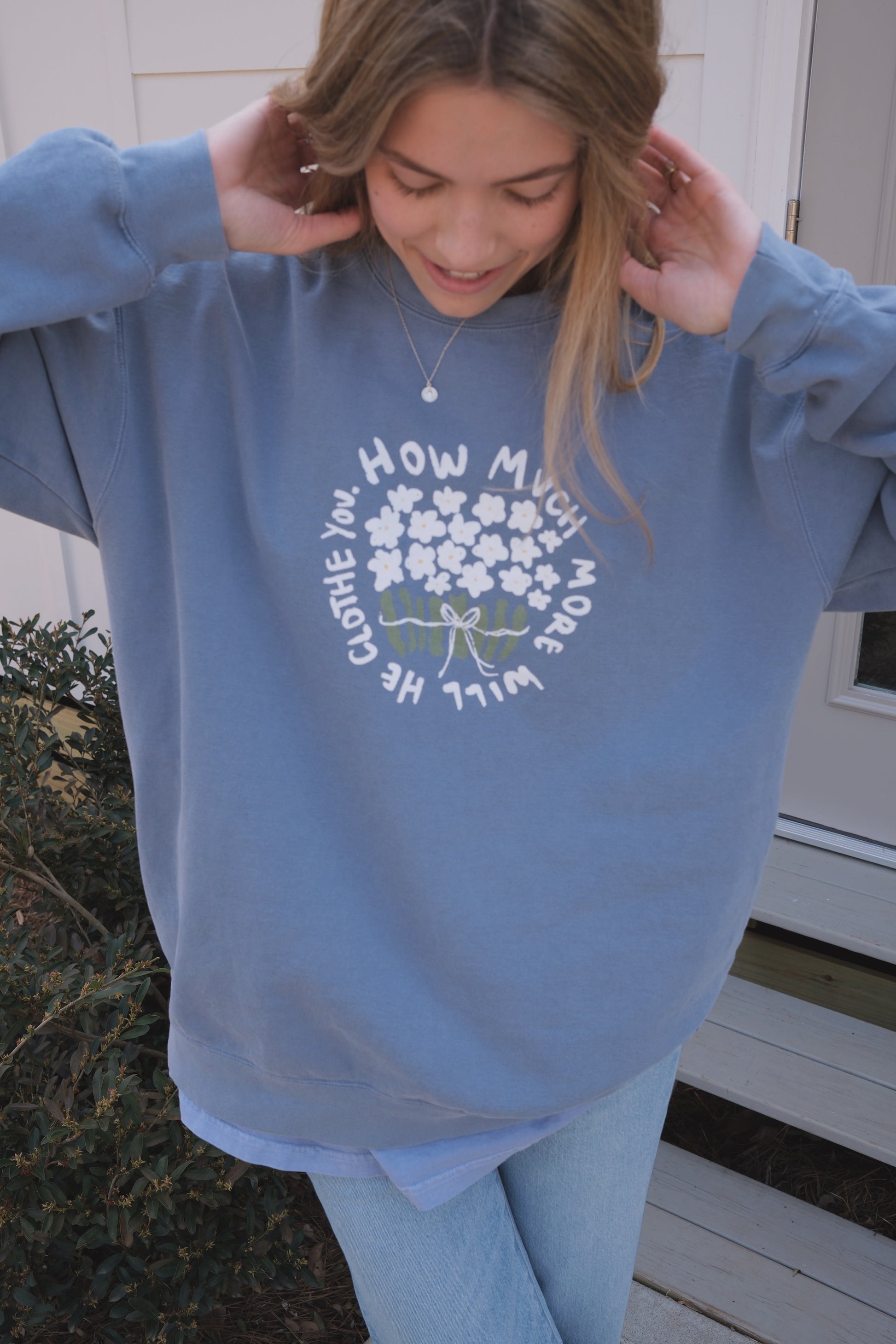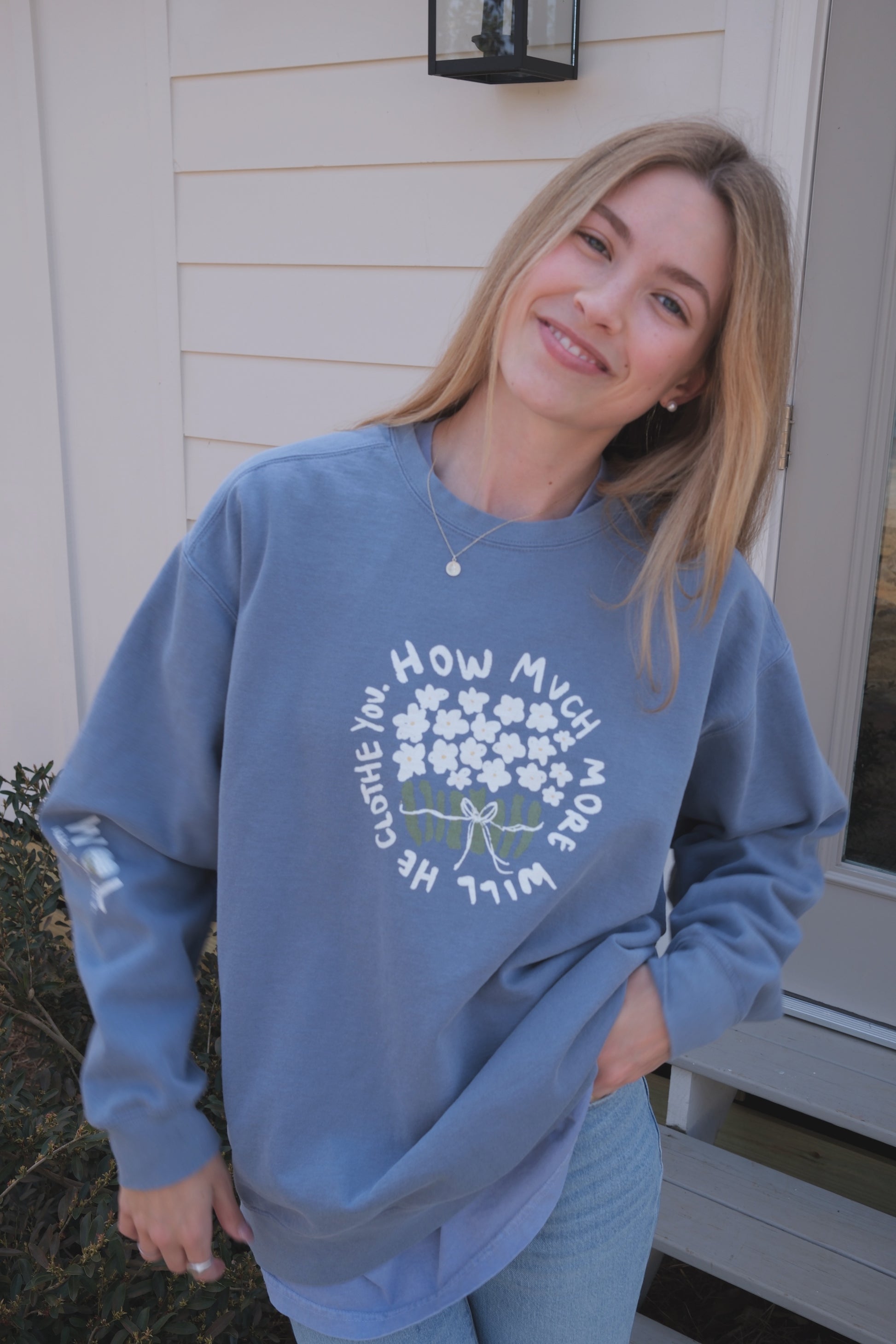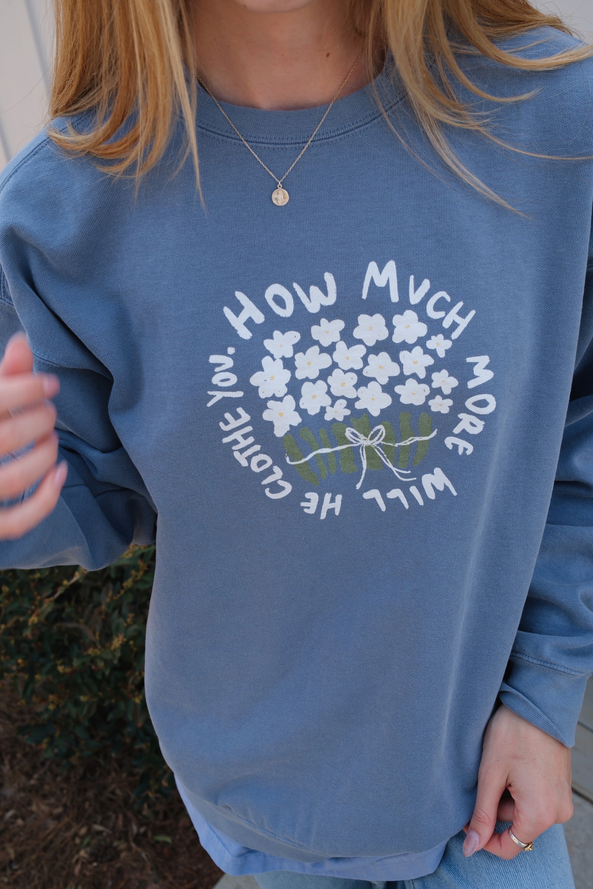 Embrace both comfort and inspiration with our "How Much More Will He Clothe You?" sweatshirt, featuring a powerful reminder from Matthew 6:30. This cozy, stylish crewneck in a soft blue jean blue hue is crafted with the softest fabric for a laid-back yet elevated look. The comforting fit is perfect for everyday wear, while the meaningful scripture serves as a gentle reminder of faith and trust. Whether you’re relaxing at home or out on a casual outing, this sweatshirt brings warmth to both your body and spirit. A perfect blend of style, comfort, and devotion – your go-to for cozy days ahead.