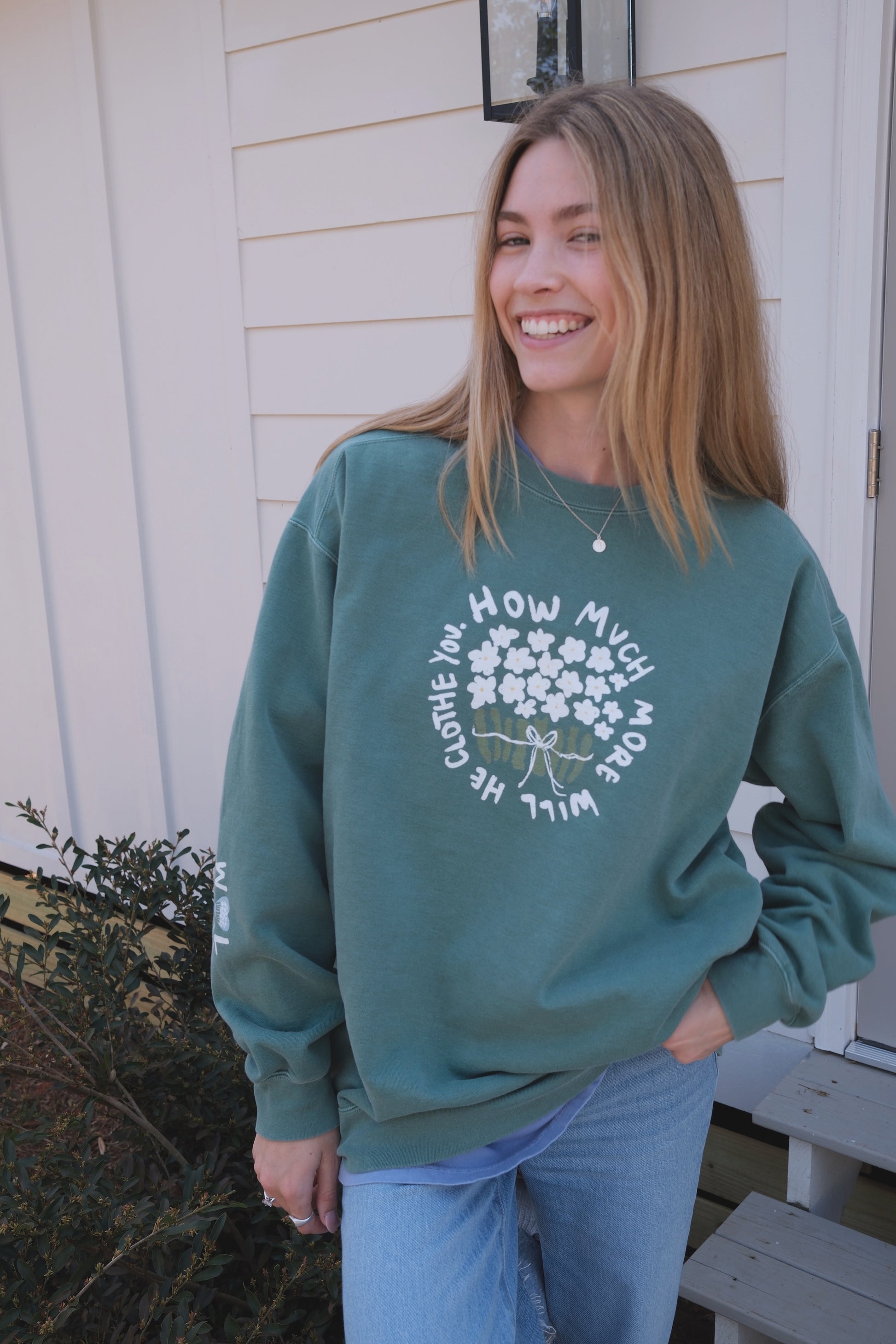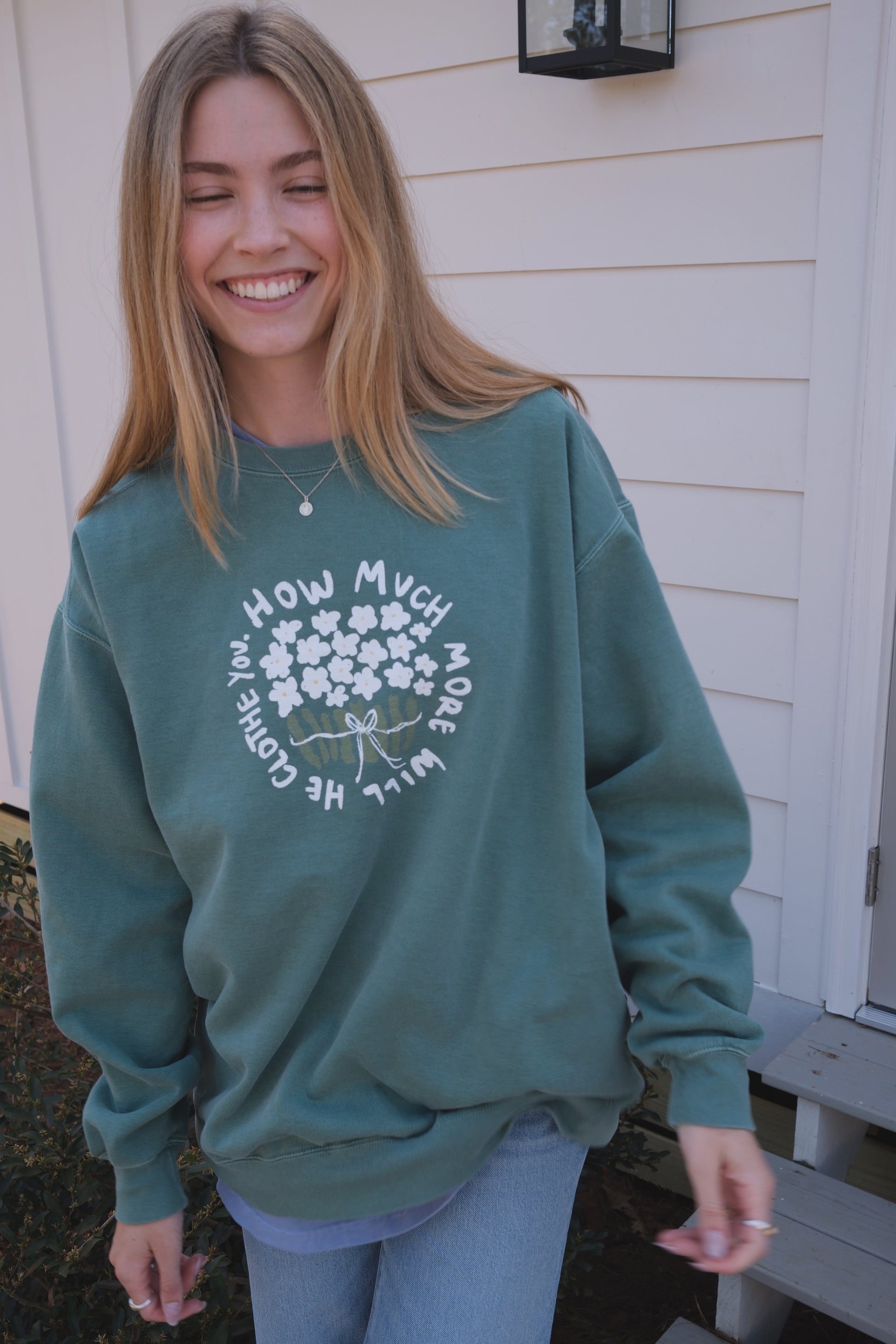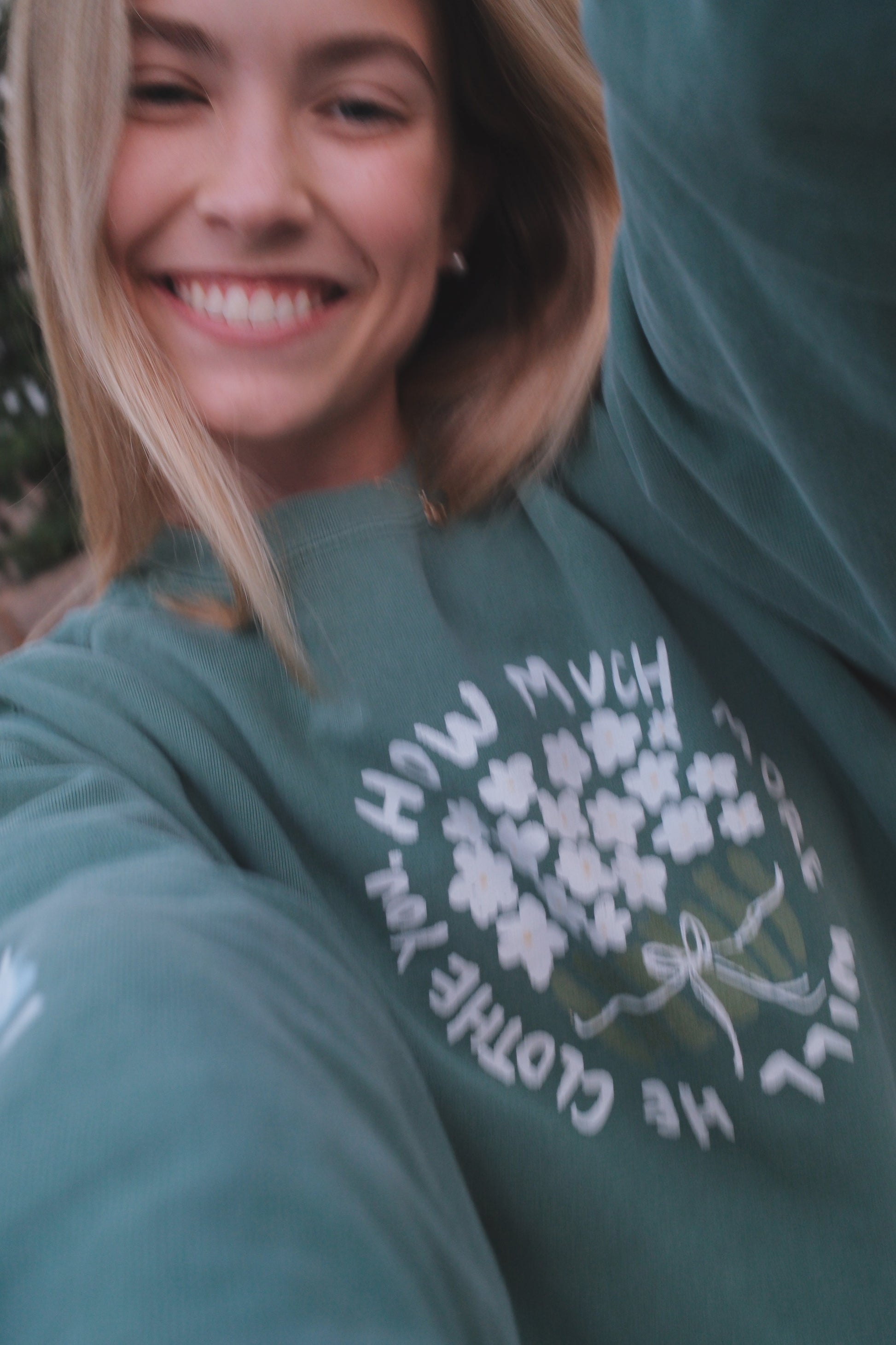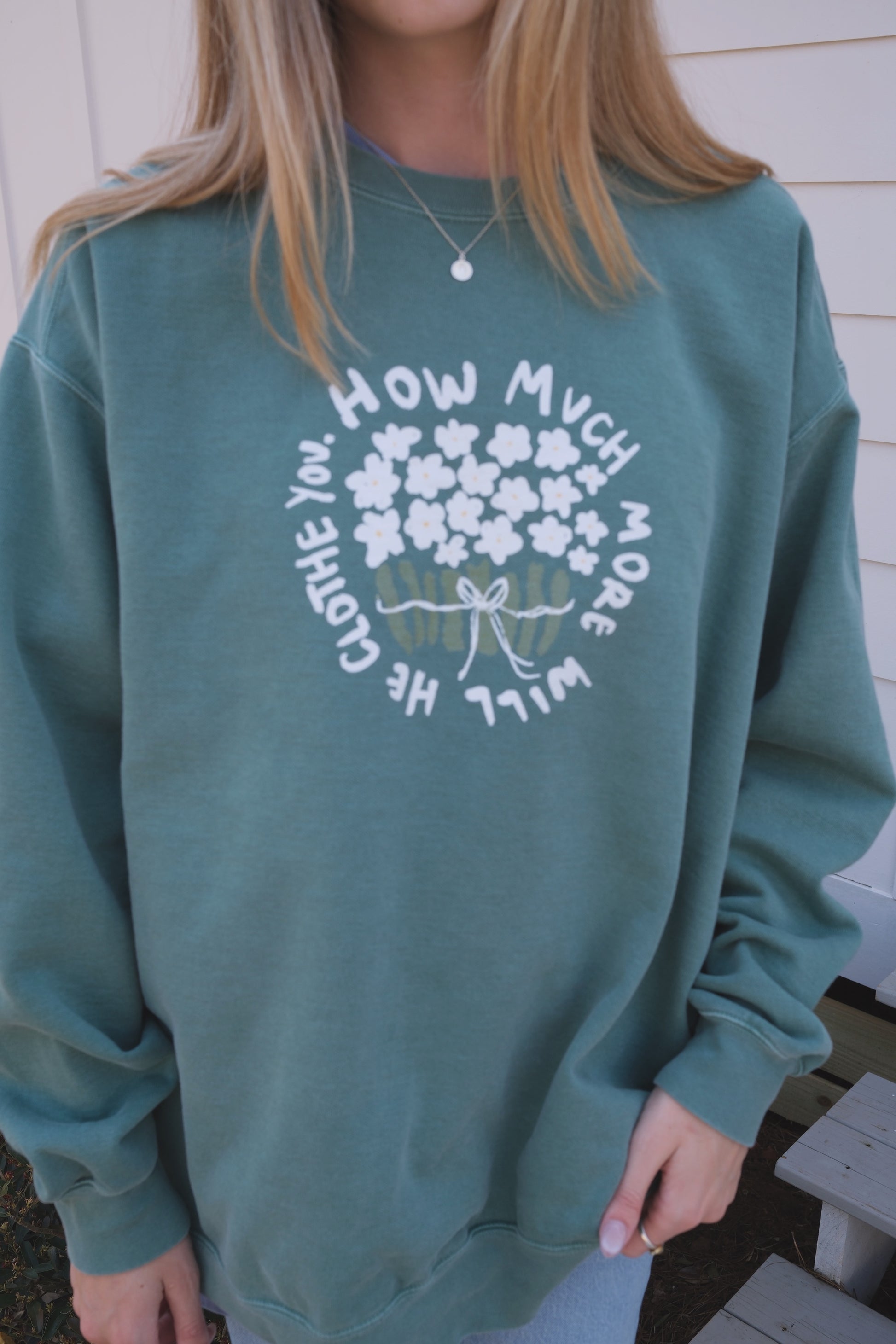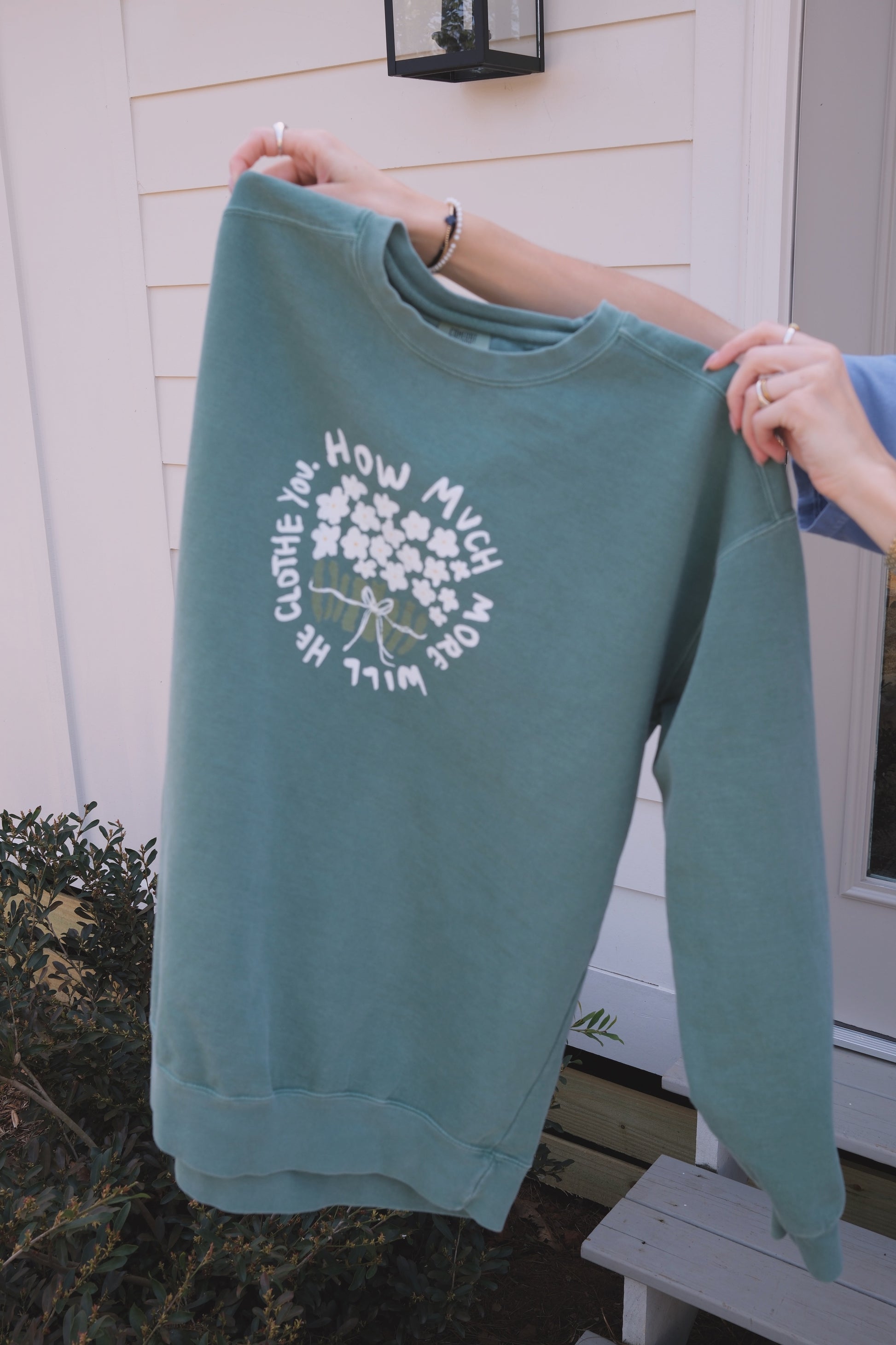 Embrace both comfort and inspiration with the hand-drawn "How Much More Will He Clothe You?" sweatshirt, featuring a powerful reminder from Matthew 6:30. This cozy crewneck in a beautiful juniper green hue is crafted with the softest fabric for a laid-back yet elevated look. The fit is perfect for everyday wear, while the meaningful scripture serves as a gentle reminder of faith and trust. Whether you’re relaxing at home or out on a casual outing, this sweatshirt brings warmth to both your body and spirit. A perfect blend of style, comfort, and devotion – your go-to for cozy days ahead.