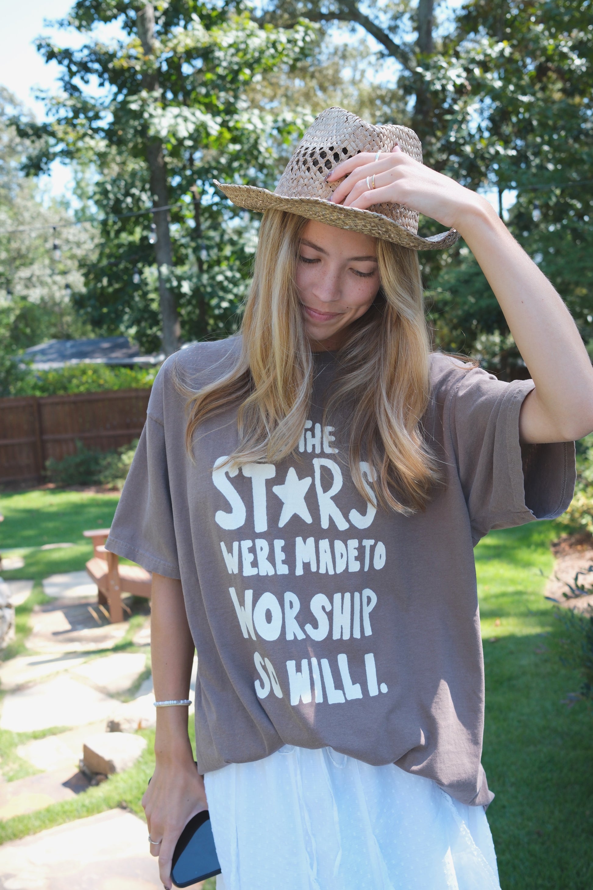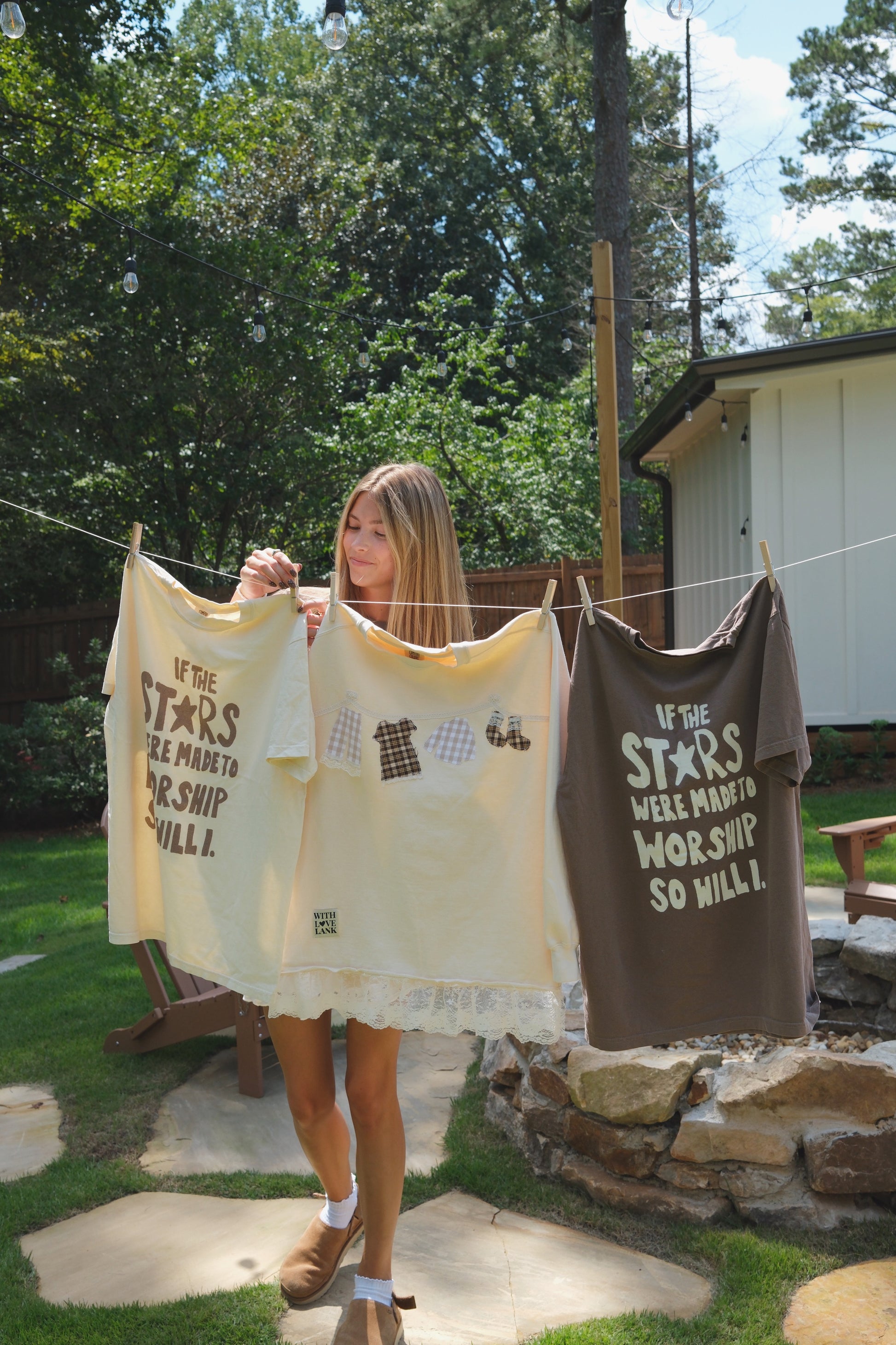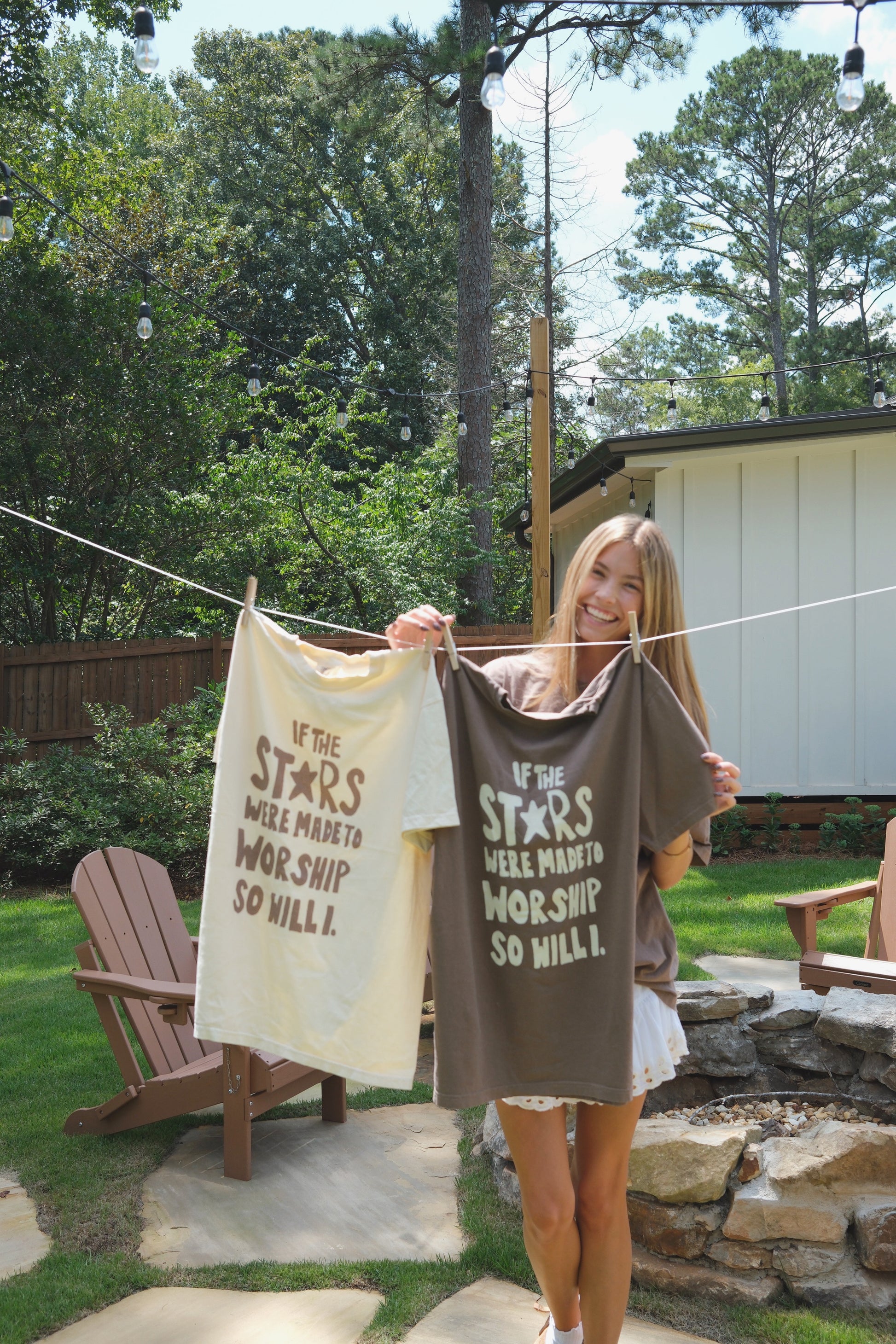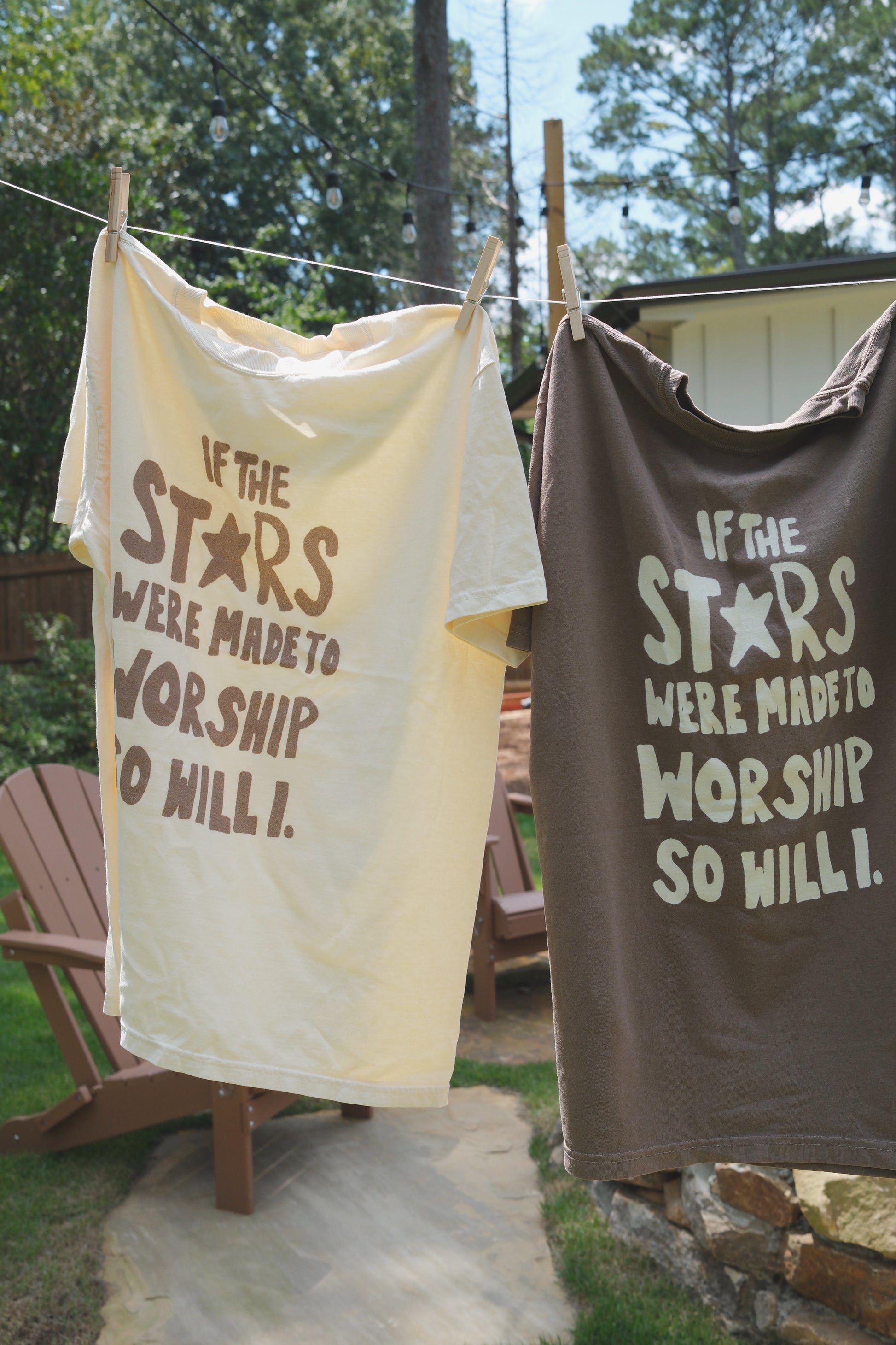 This hand-drawn piece is rooted in Psalm 19:1 — “The heavens declare the glory of God; the skies proclaim the work of His hands.” Inspired by the Hillsong song “So Will I (100 Billion X),” the design reflects the truth that all of creation exists to glorify its Maker. Just as the stars reflect His glory, we are invited to as well!
