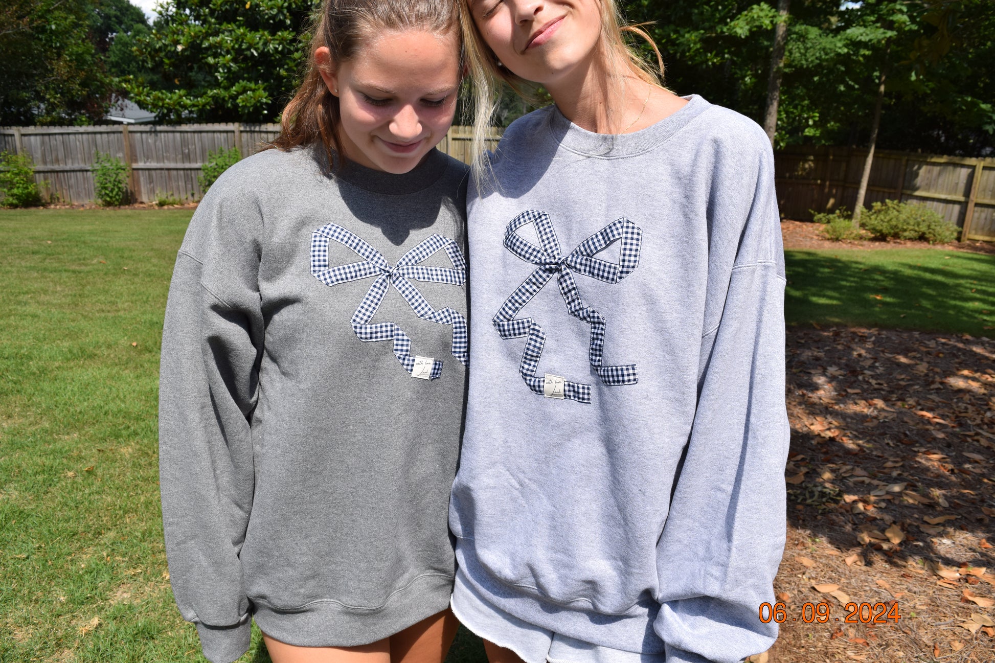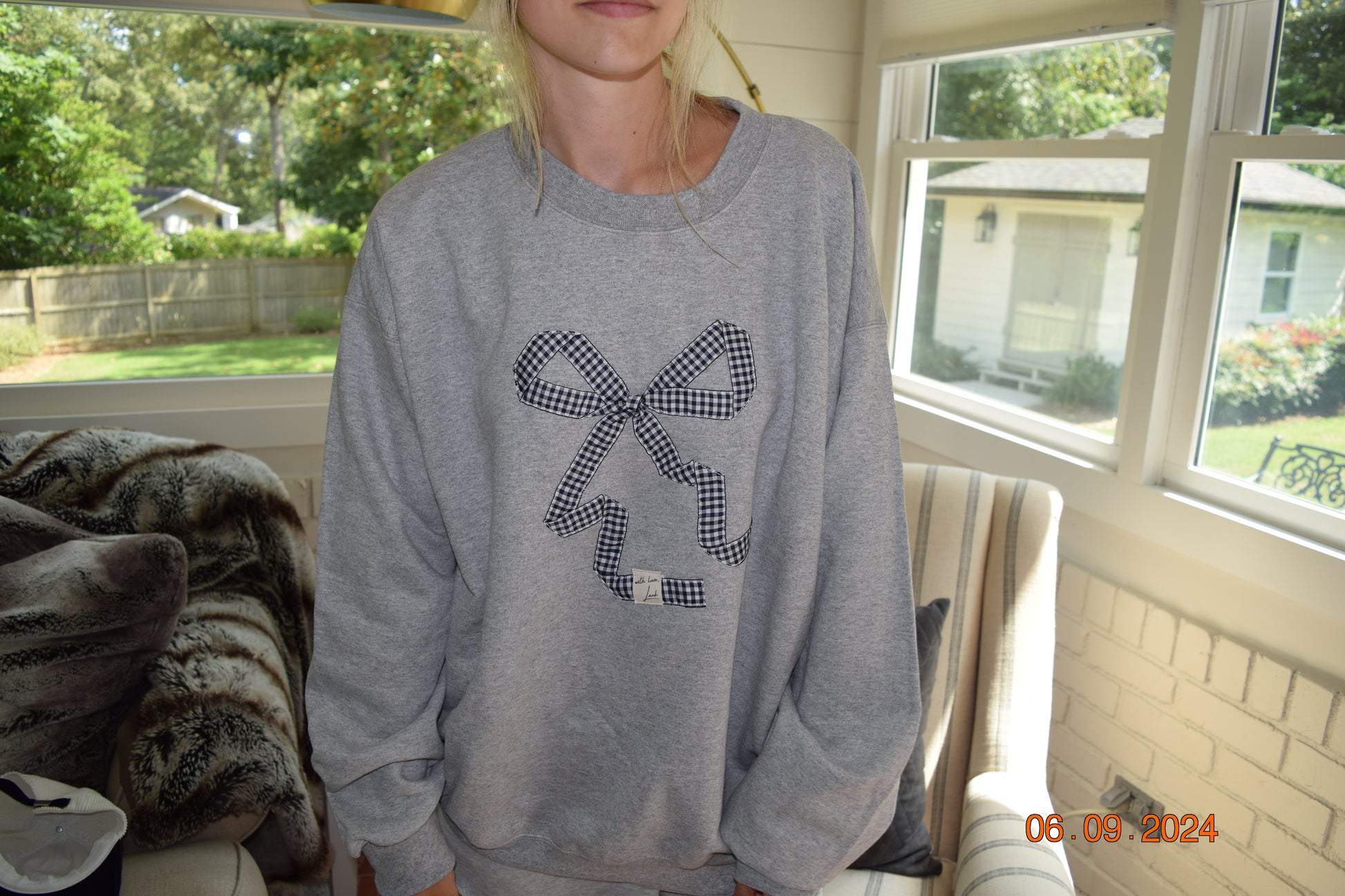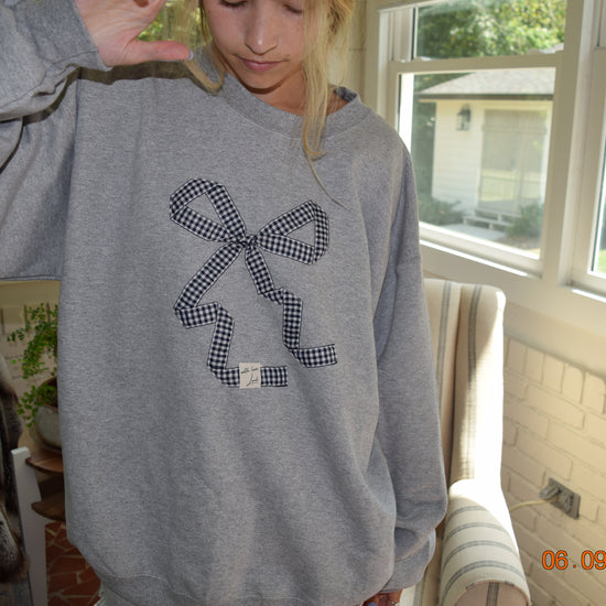 Brought the bows back!! This is the iconic and classic With love, Lank navy gingham bow crewneck. Handmade and stitched with love, just for you!