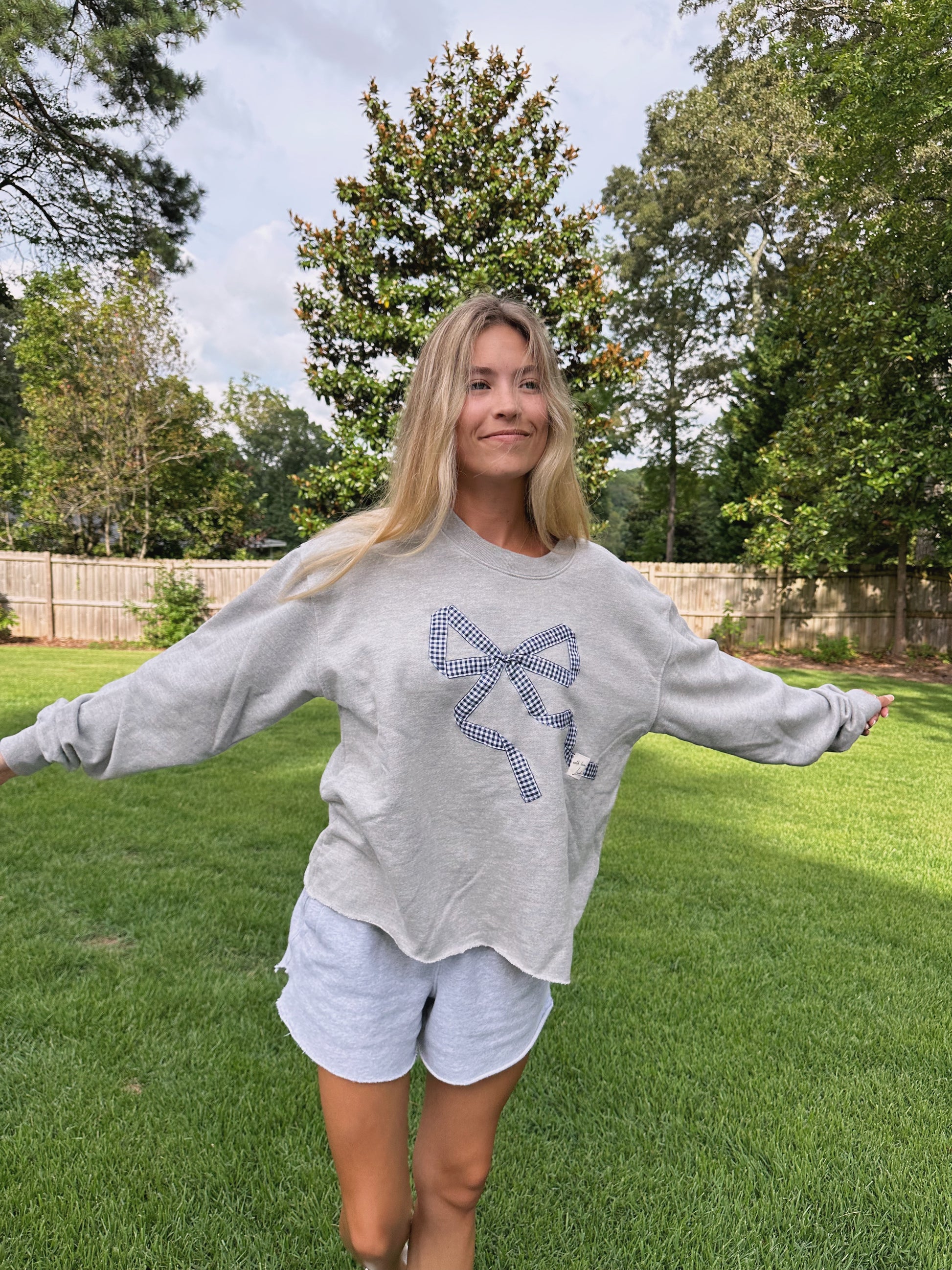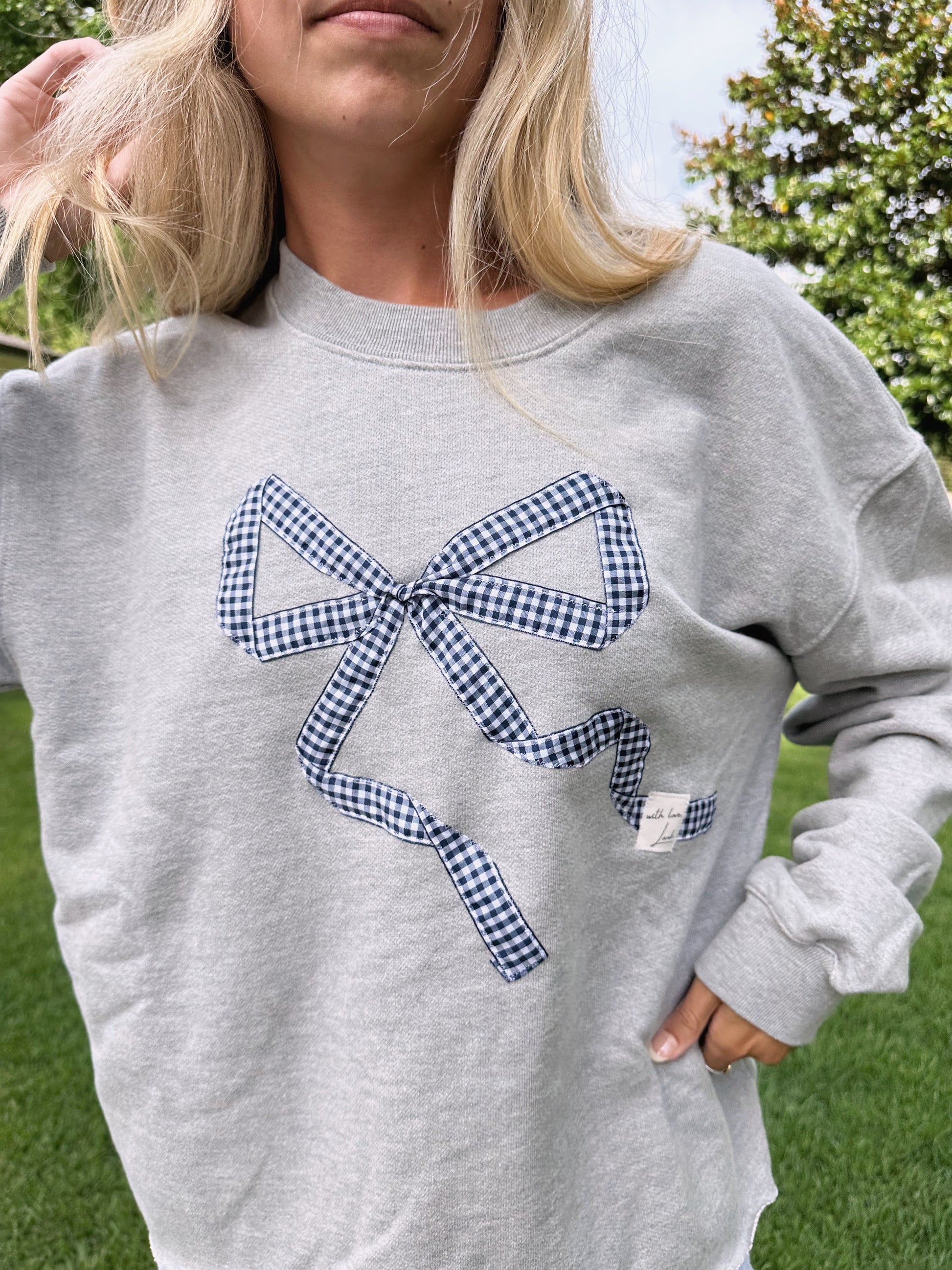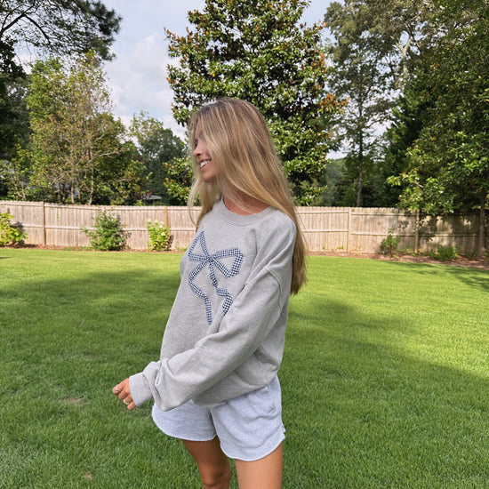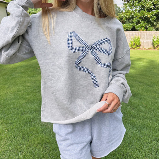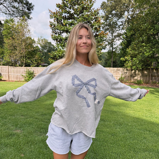 The signature front bow crewneck is the perfect addition to your wardrobe!! My favorite layering piece. An added bonus — this crewneck is made in the usa! And the terry cloth material gives this piece extra character and style.