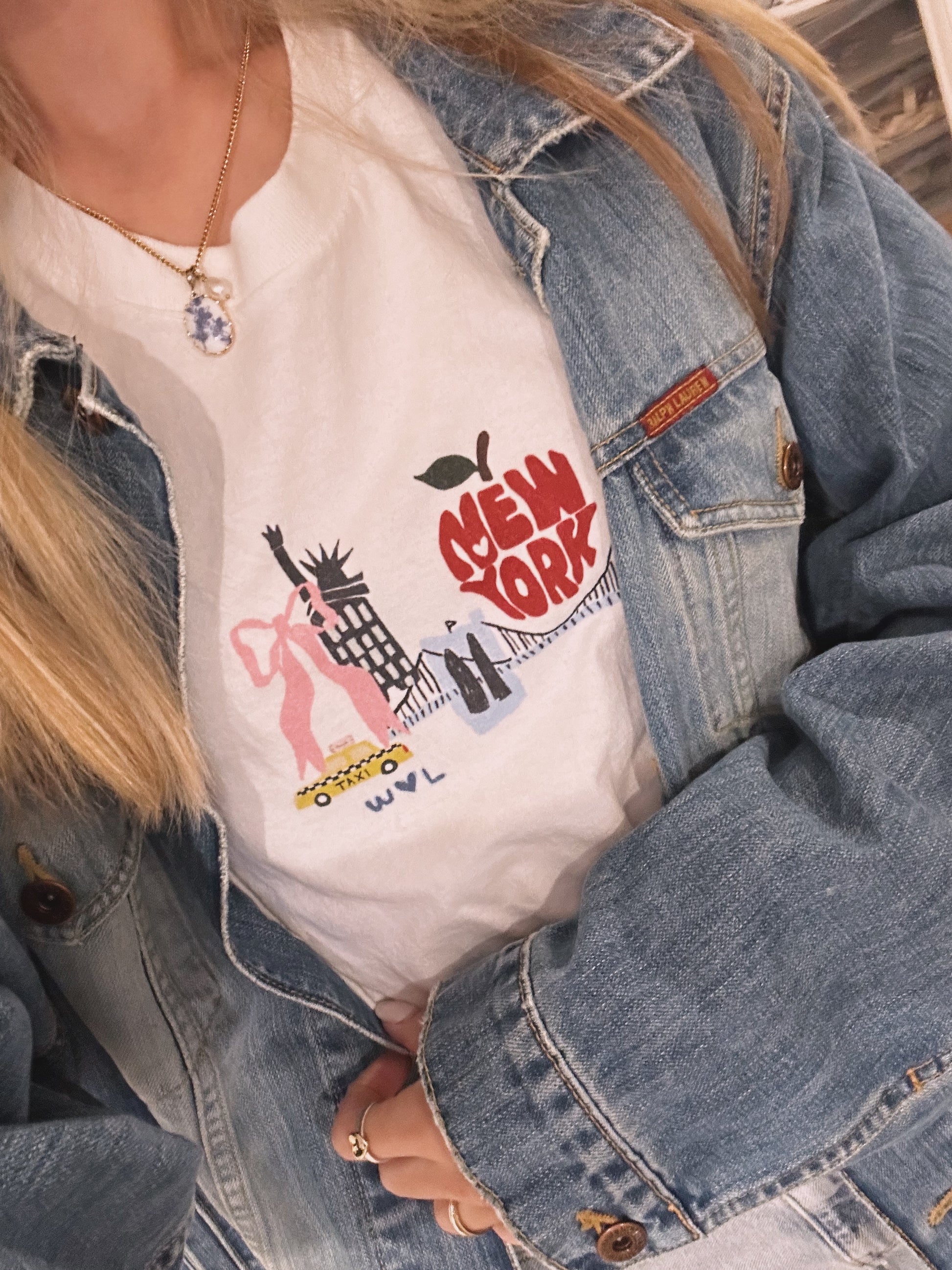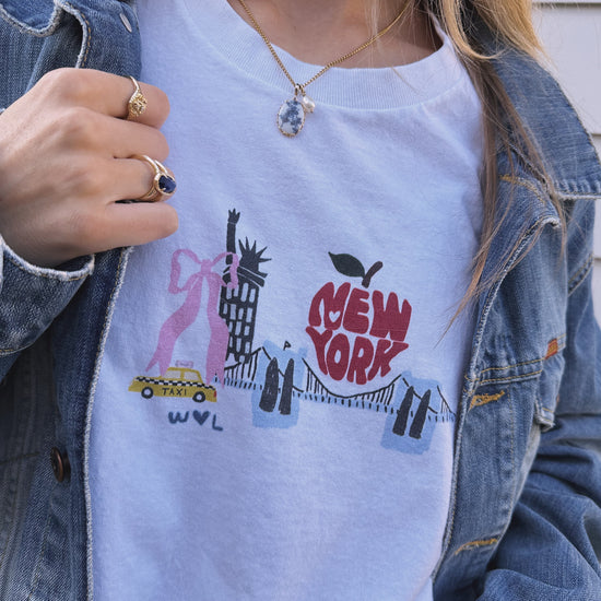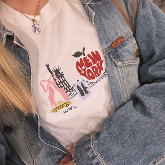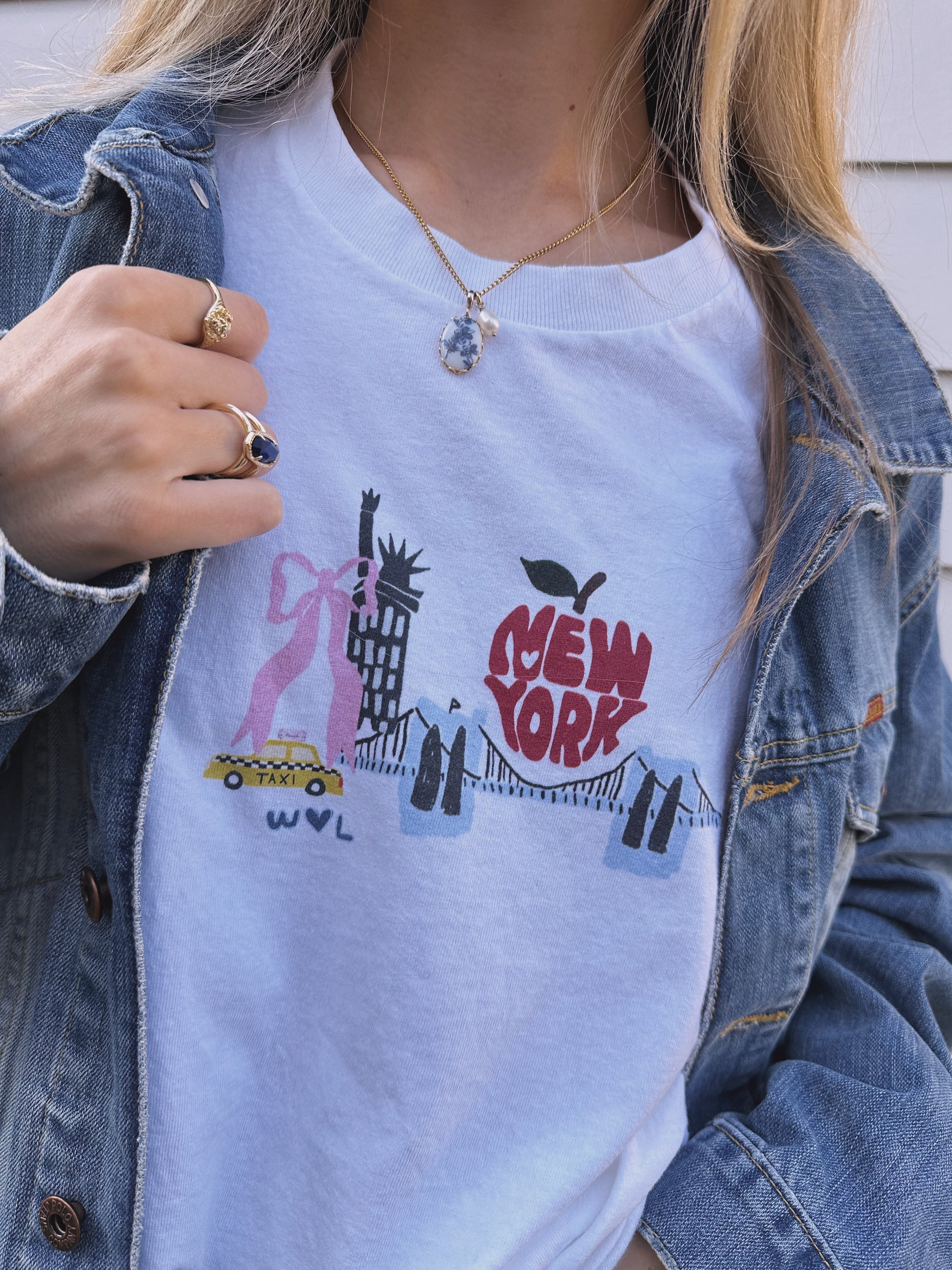 Introducing the New York Hand-Drawn City Scene Standard Tee, where creativity meets comfort! This comfy tee features a playful skyline design that captures simplistic icons of New York City -- plus a sweet little bow!