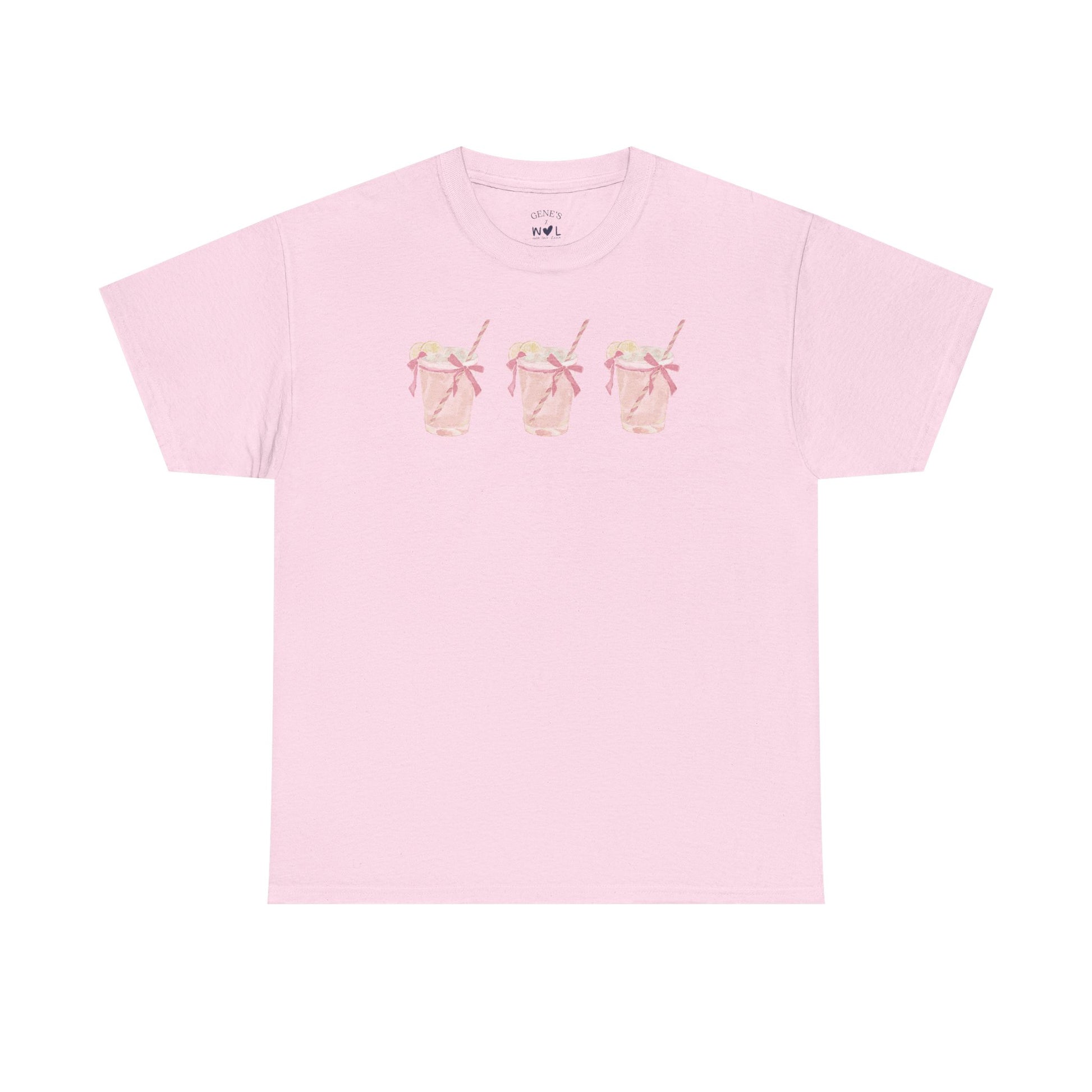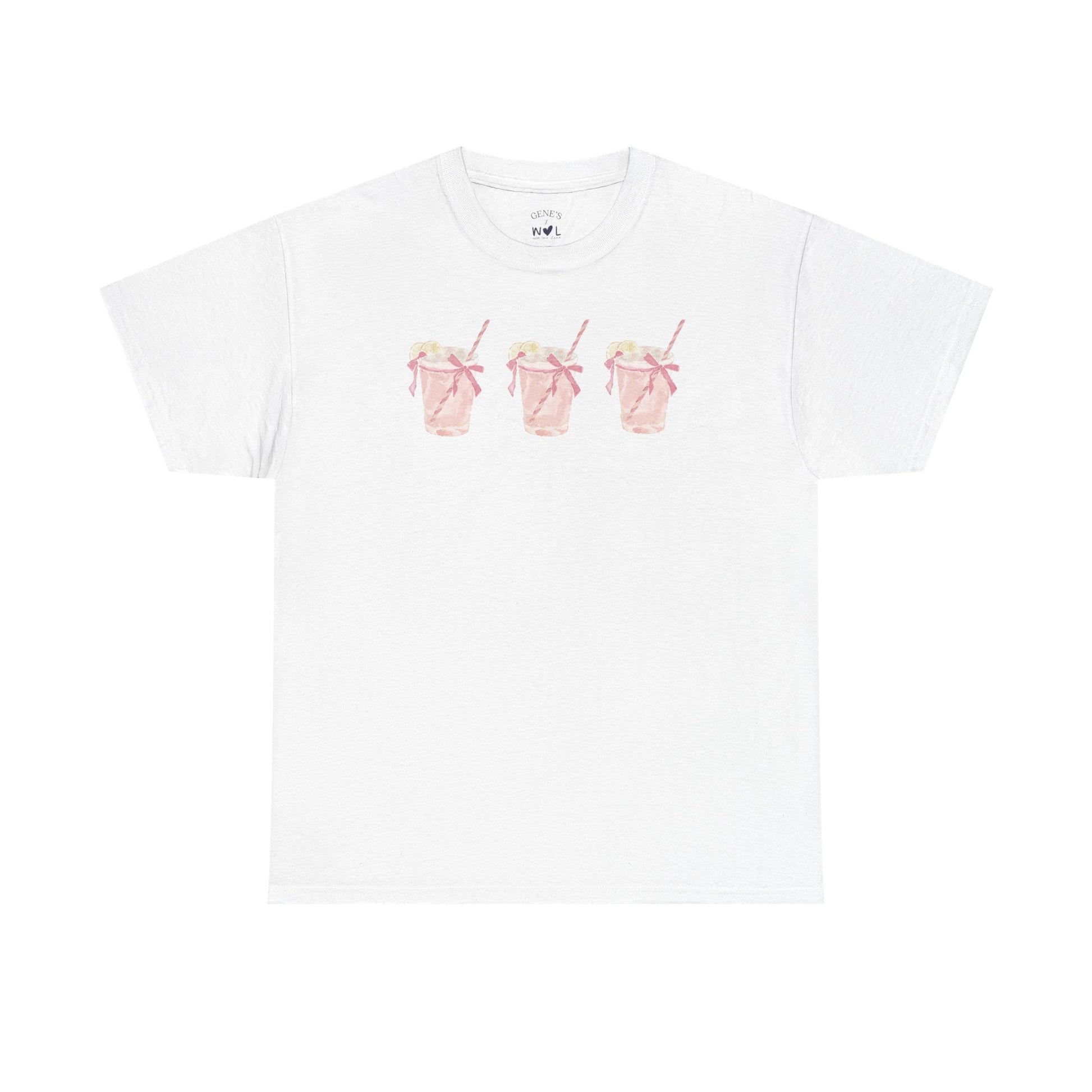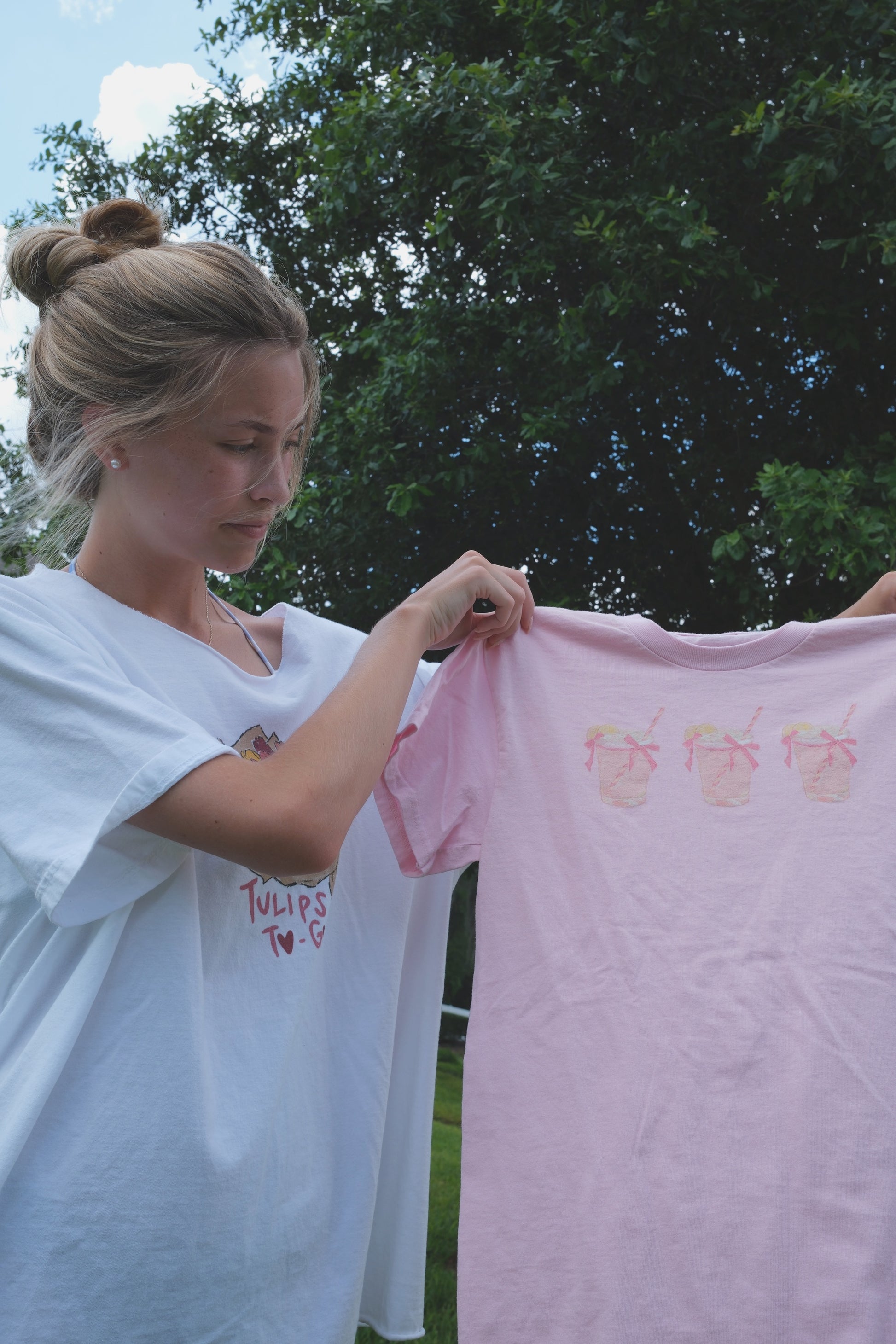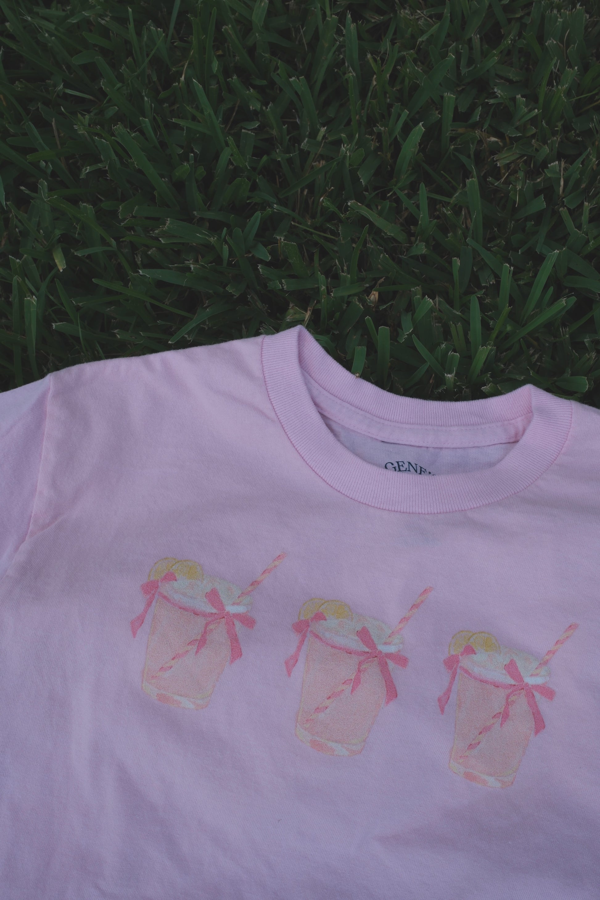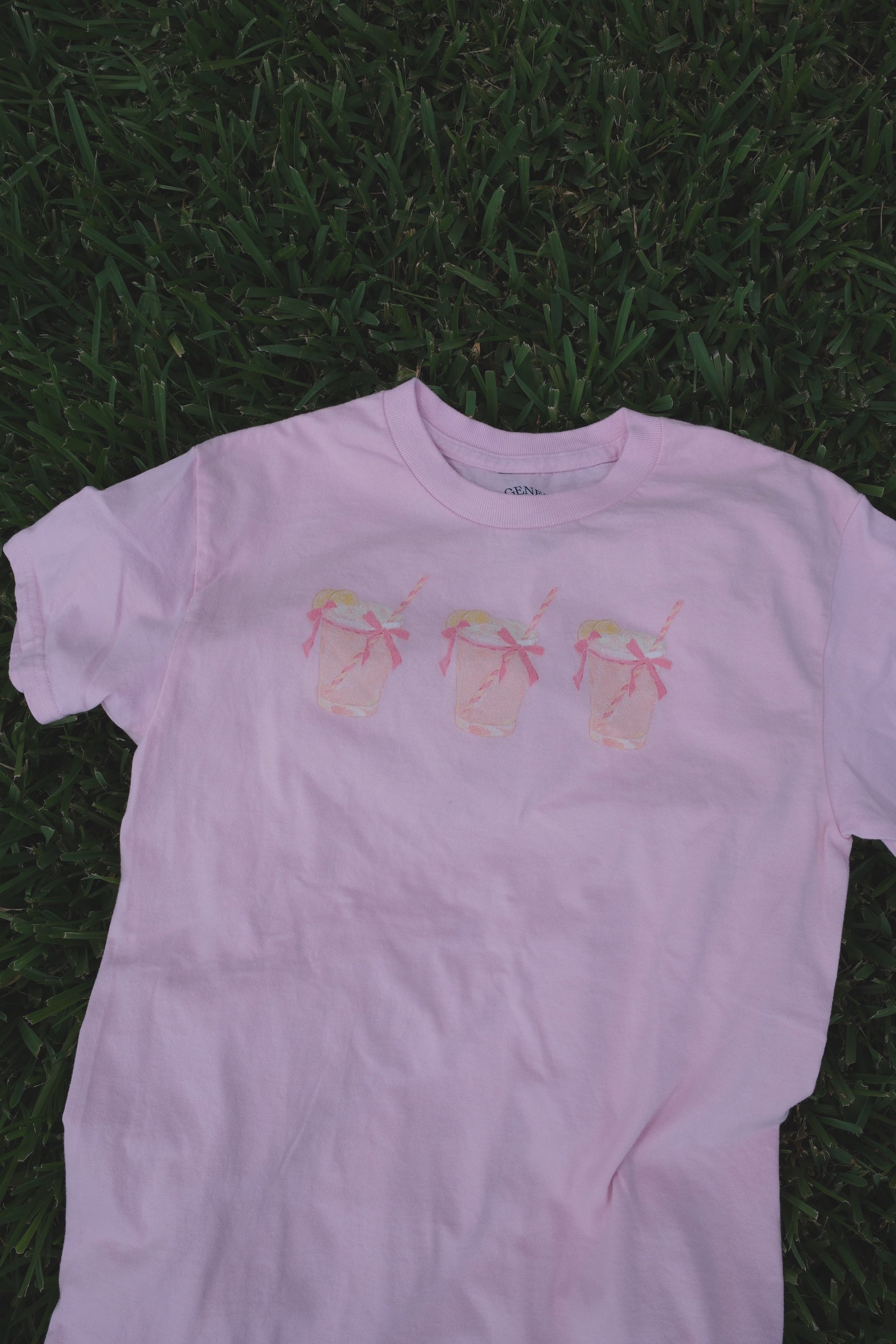 Featuring a hand-drawn trio of pastel pink lemonades and dainty bows, this shirt is the perfect addition to any summer fit. Pairs perfectly with denim and a coastal breeze!