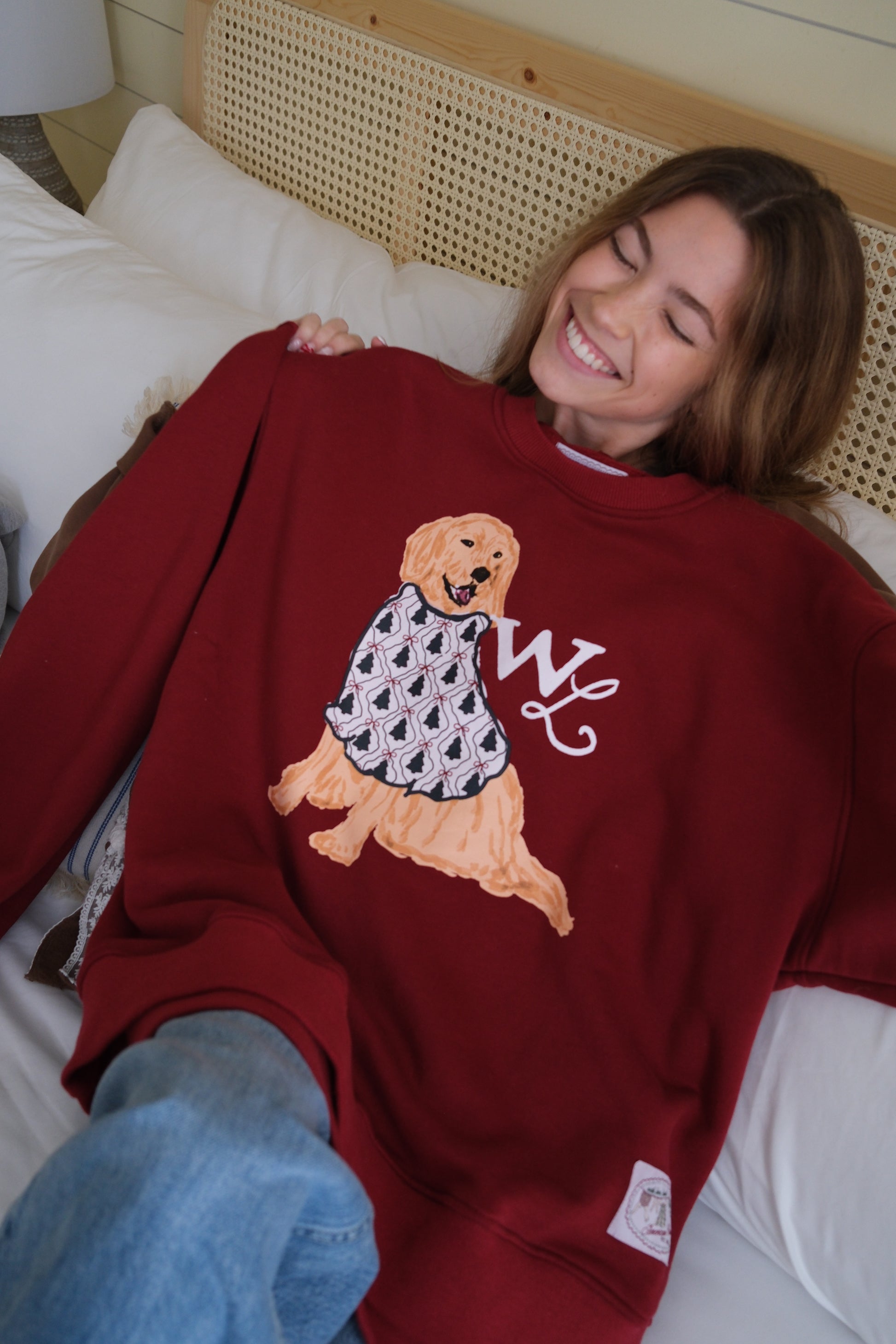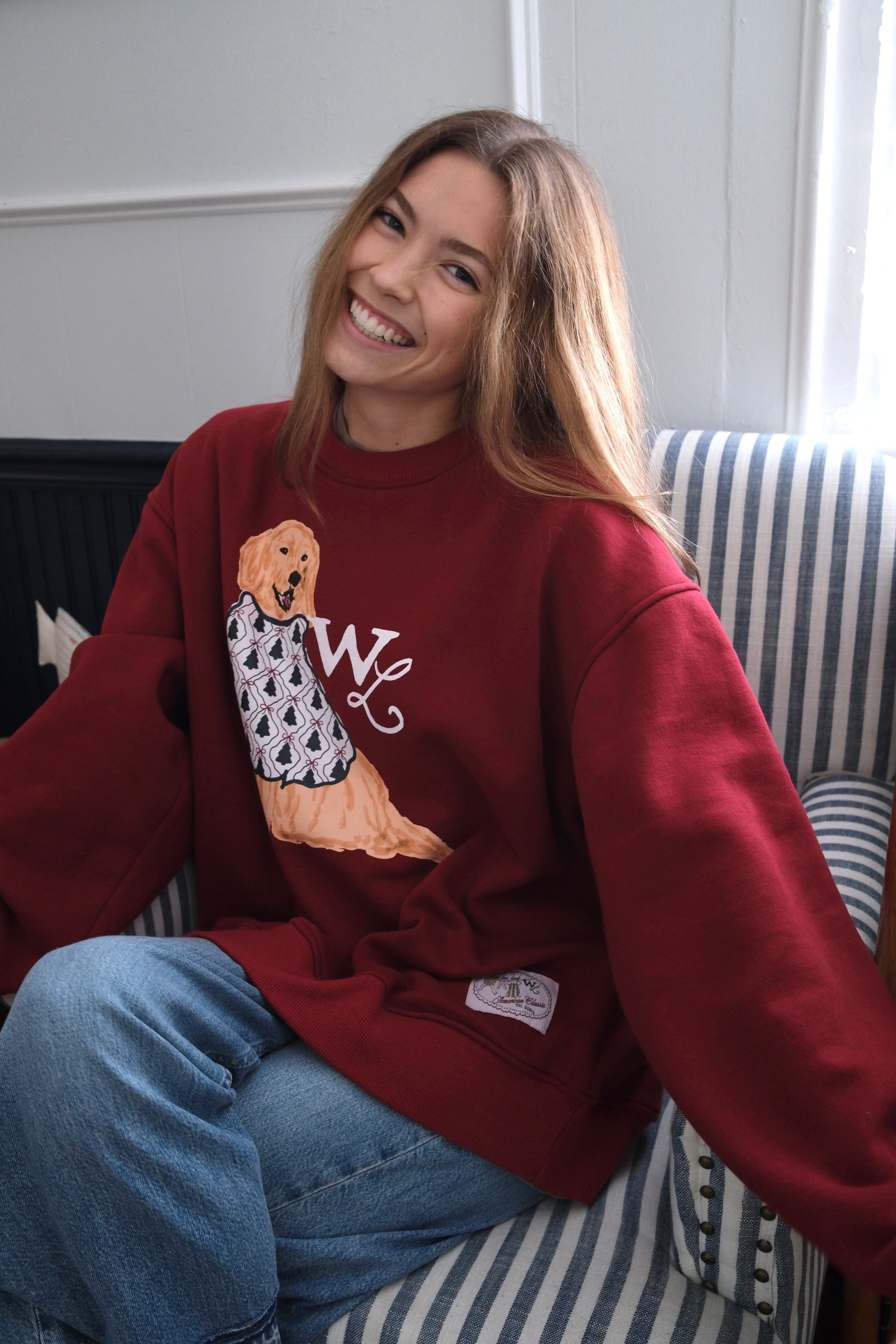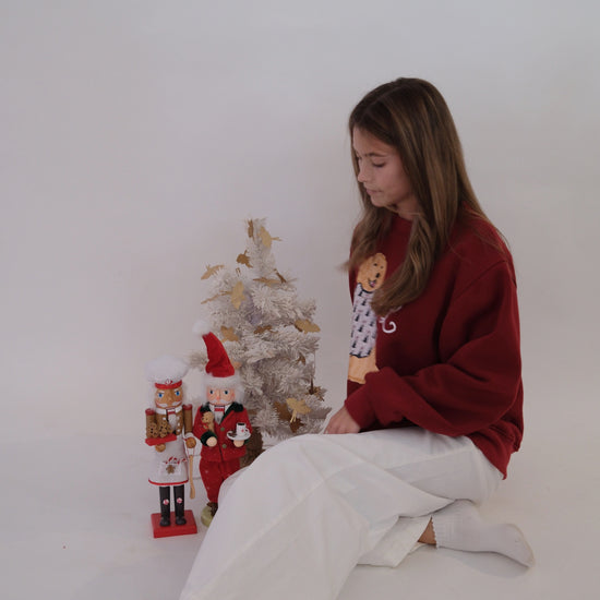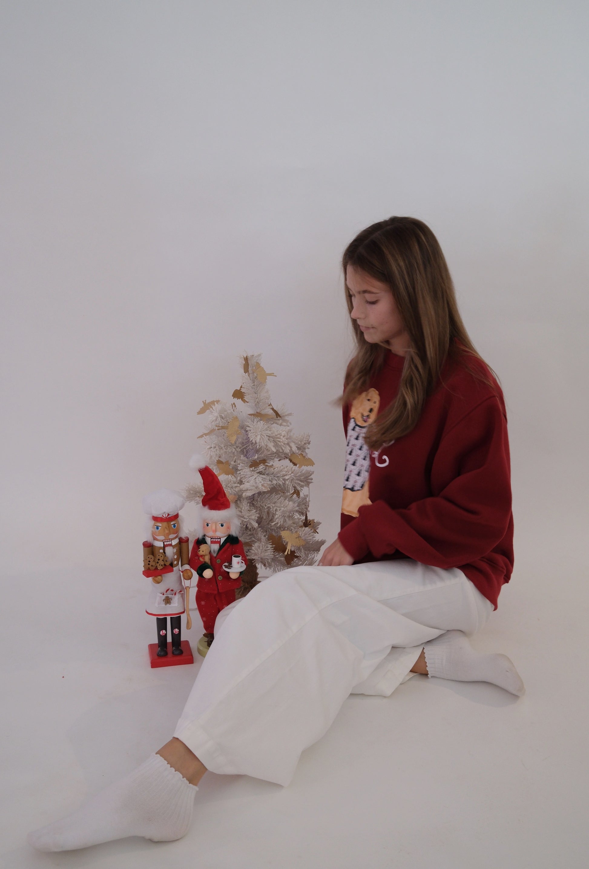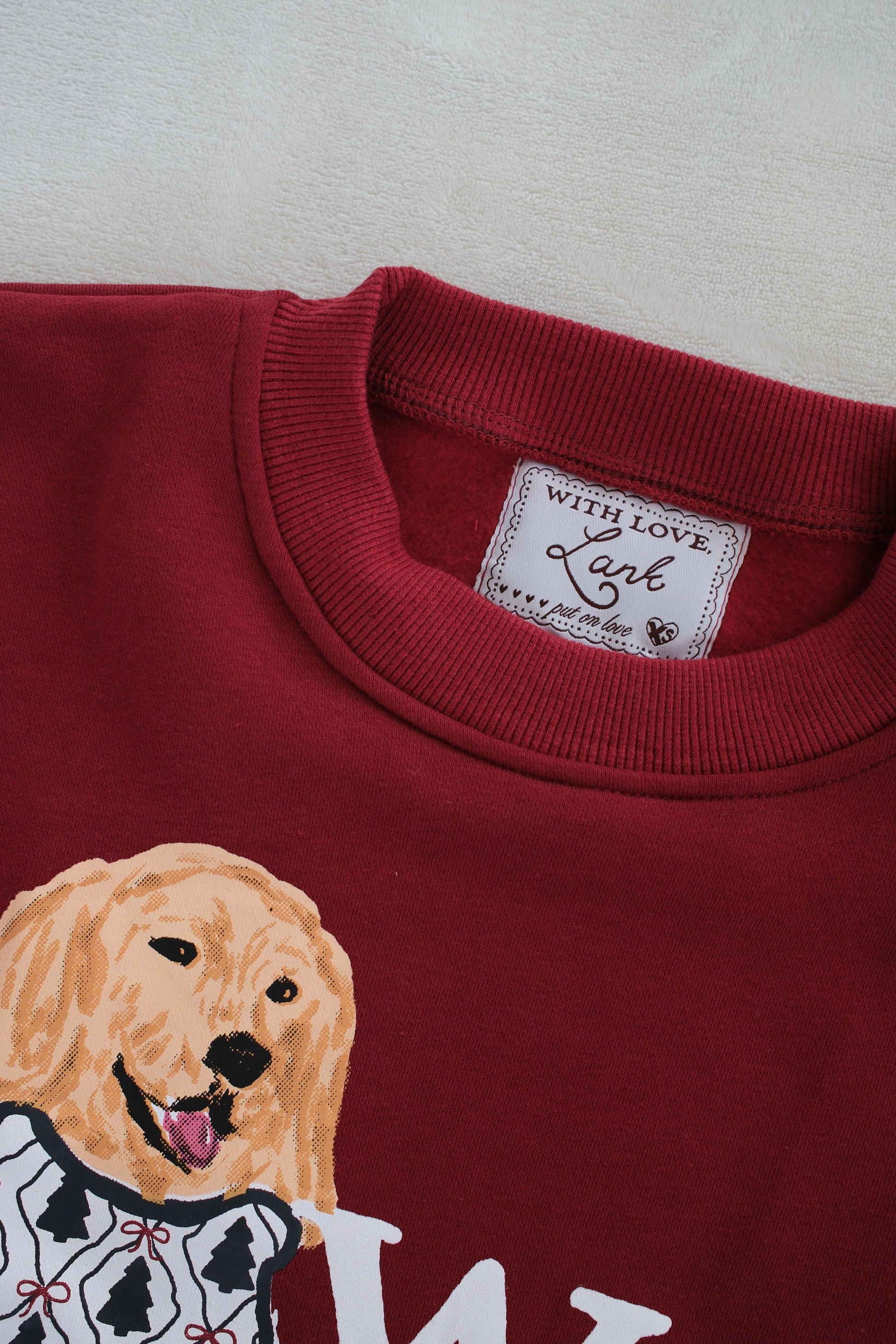 This deep holiday red crew features Charlie in a hand-drawn green-and-cream winter pattern, printed and patch-applied for that signature With Love, Lank handmade touch. It’s merry, cozy, and celebrates the little joys of winter.