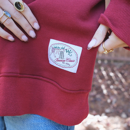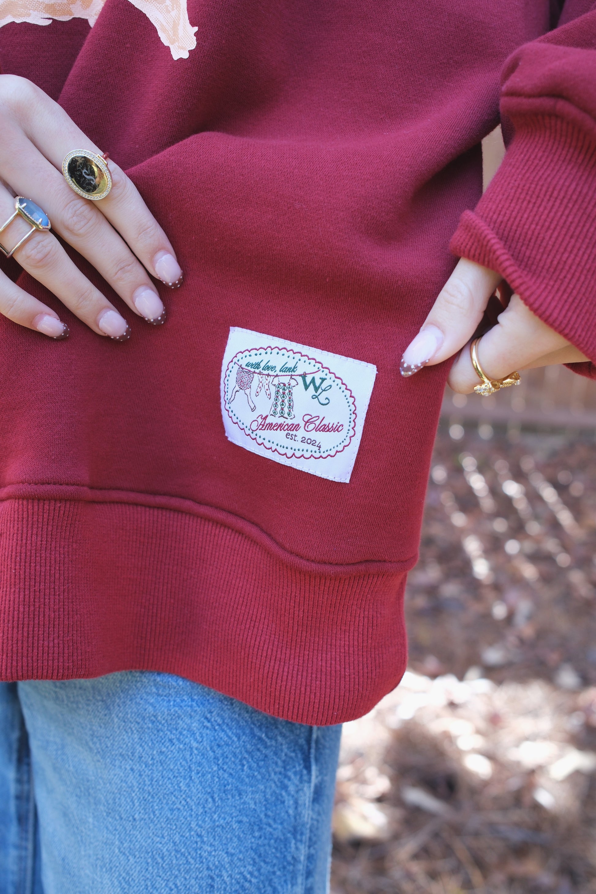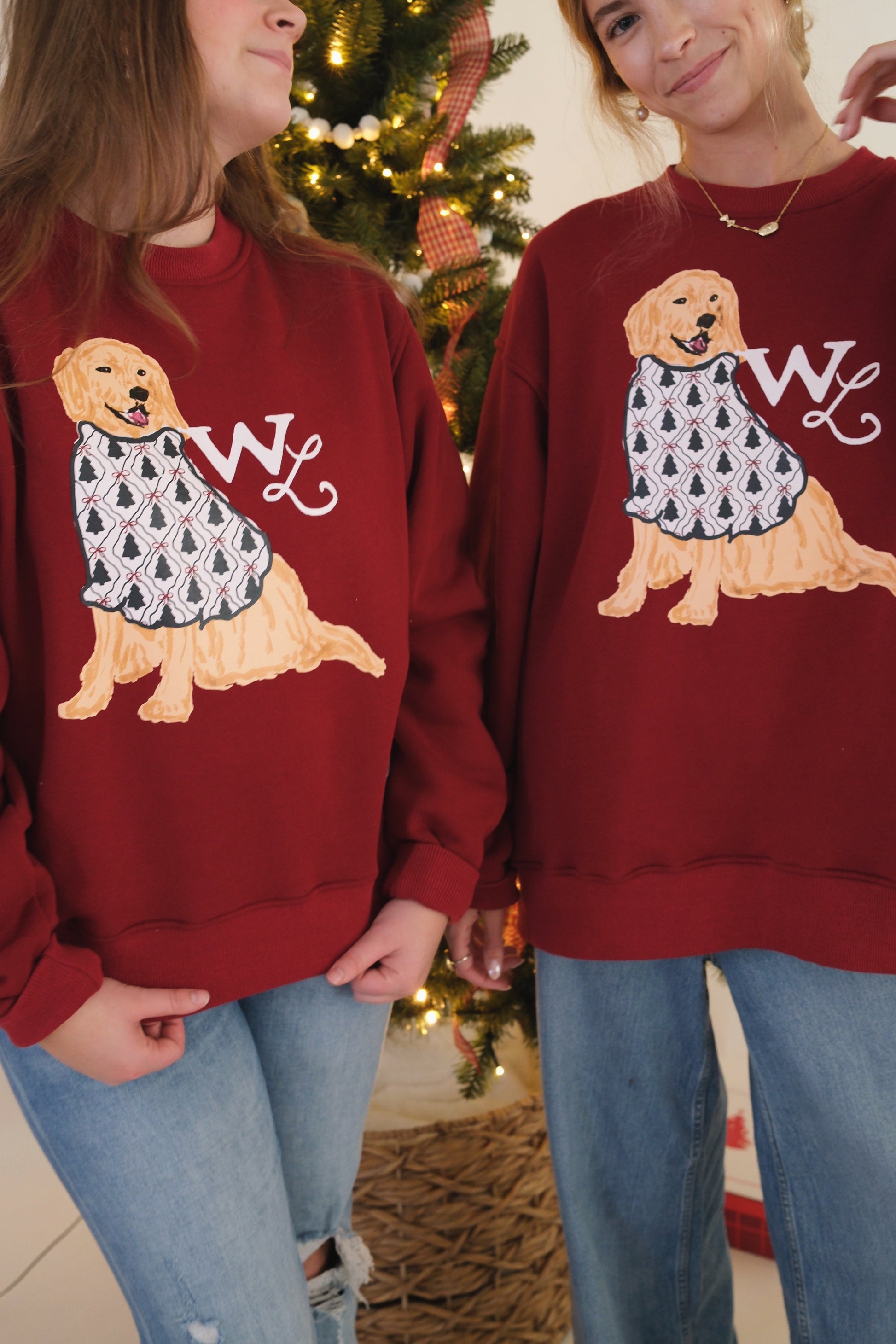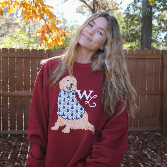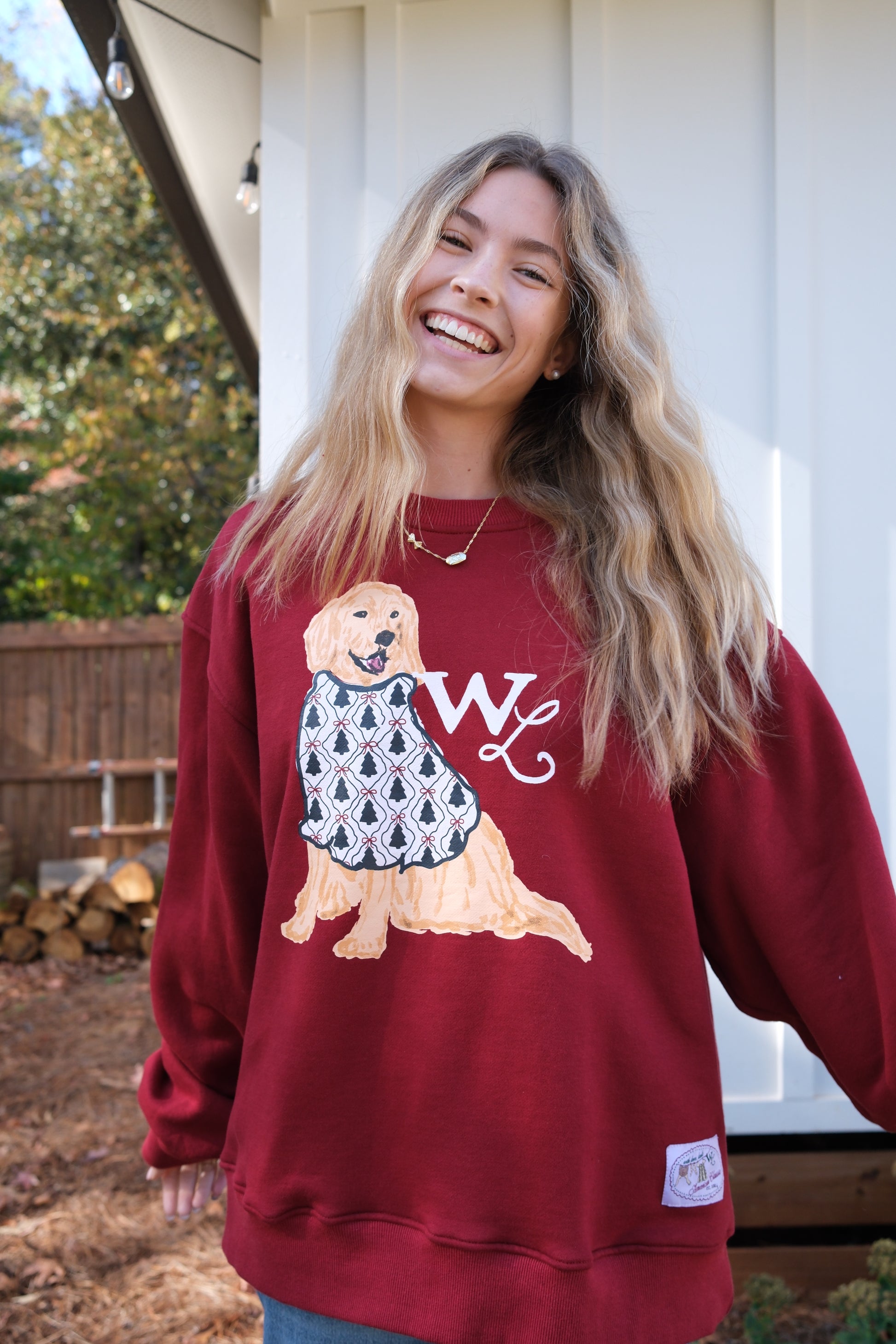 This deep holiday red crew features Charlie in a hand-drawn green-and-cream winter pattern, printed and patch-applied for that signature With Love, Lank handmade touch. It’s merry, cozy, and celebrates the little joys of winter.