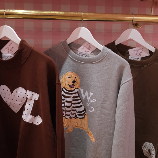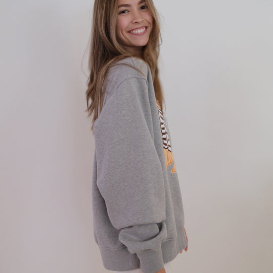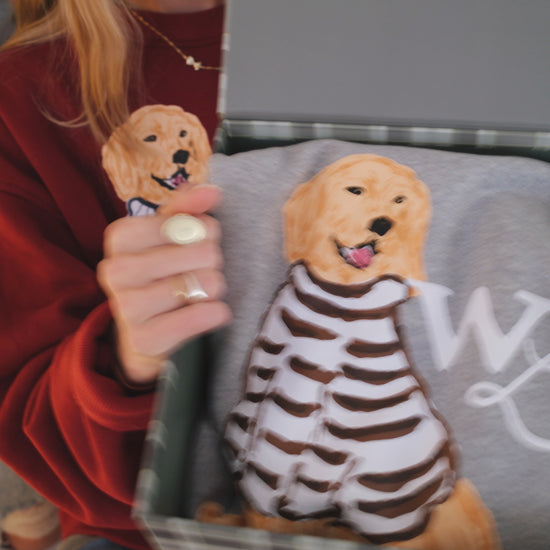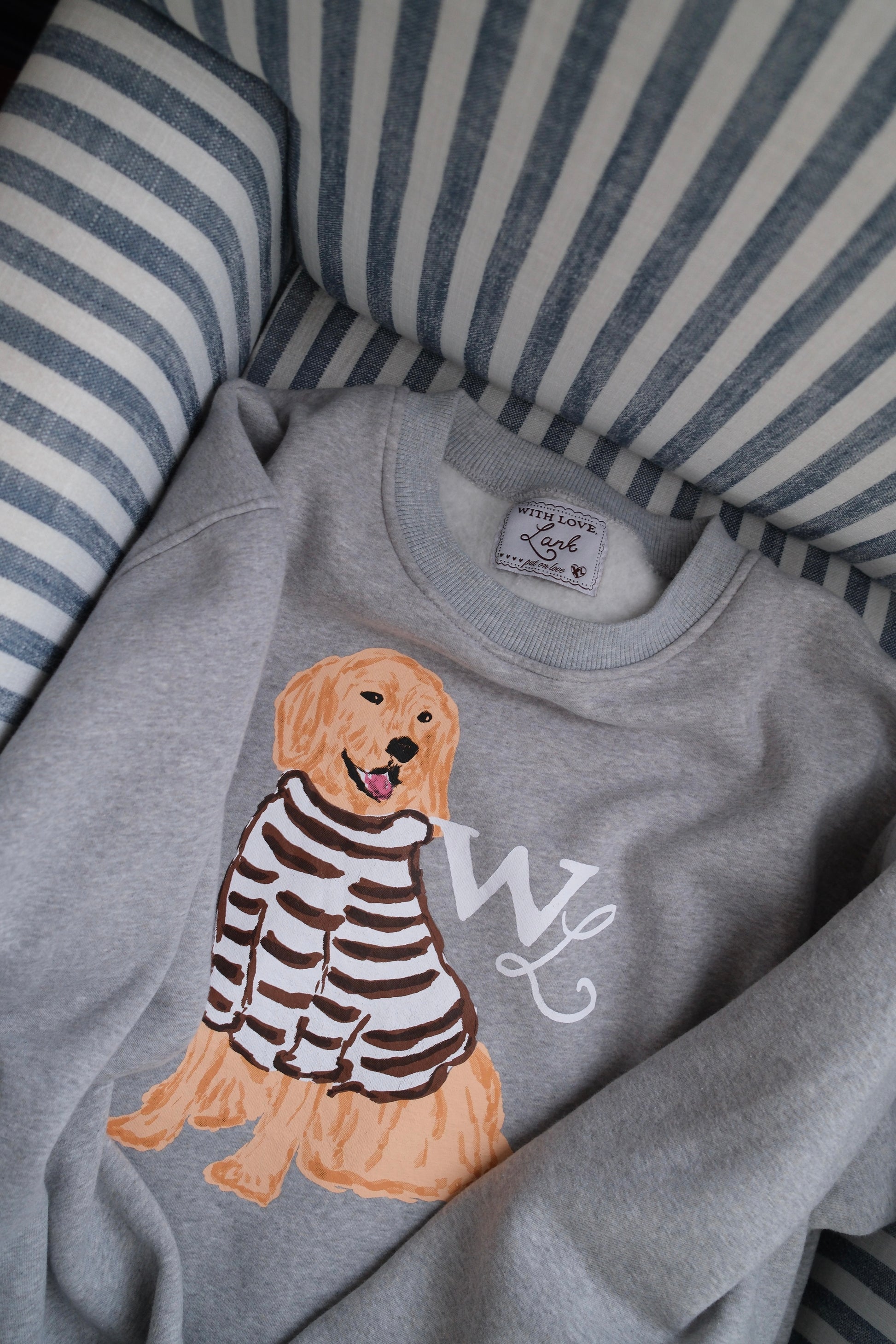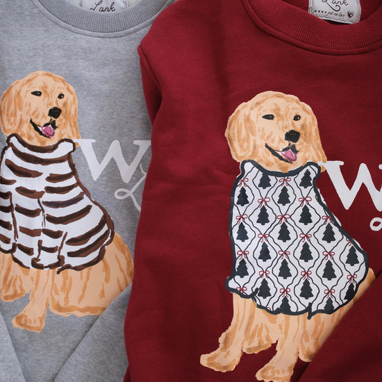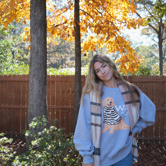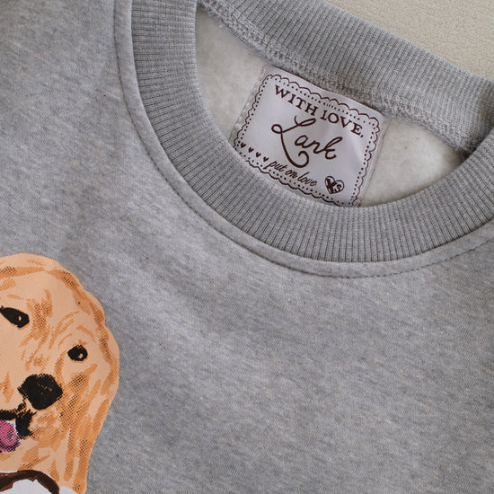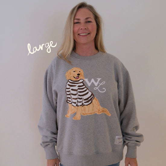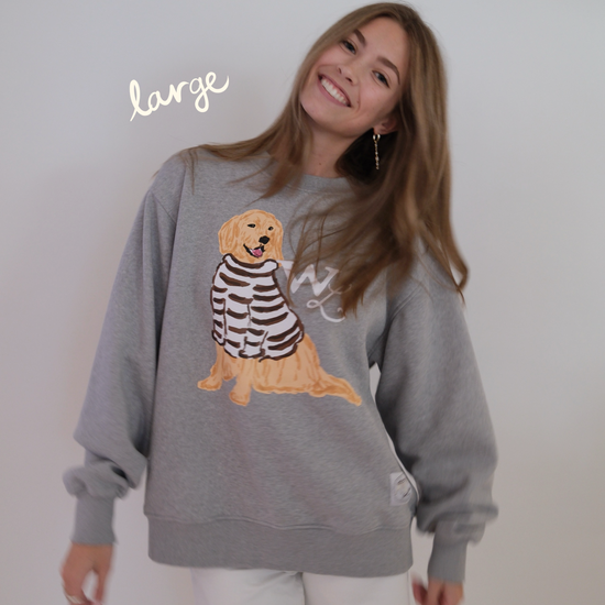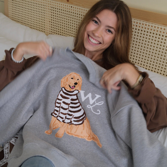 Set on a soft heathered grey base, Charlie the Golden sits front and center in his hand-drawn cocoa-striped sweater. The look is warm and nostalgic —a sweatshirt that feels like a favorite from the very first wear.