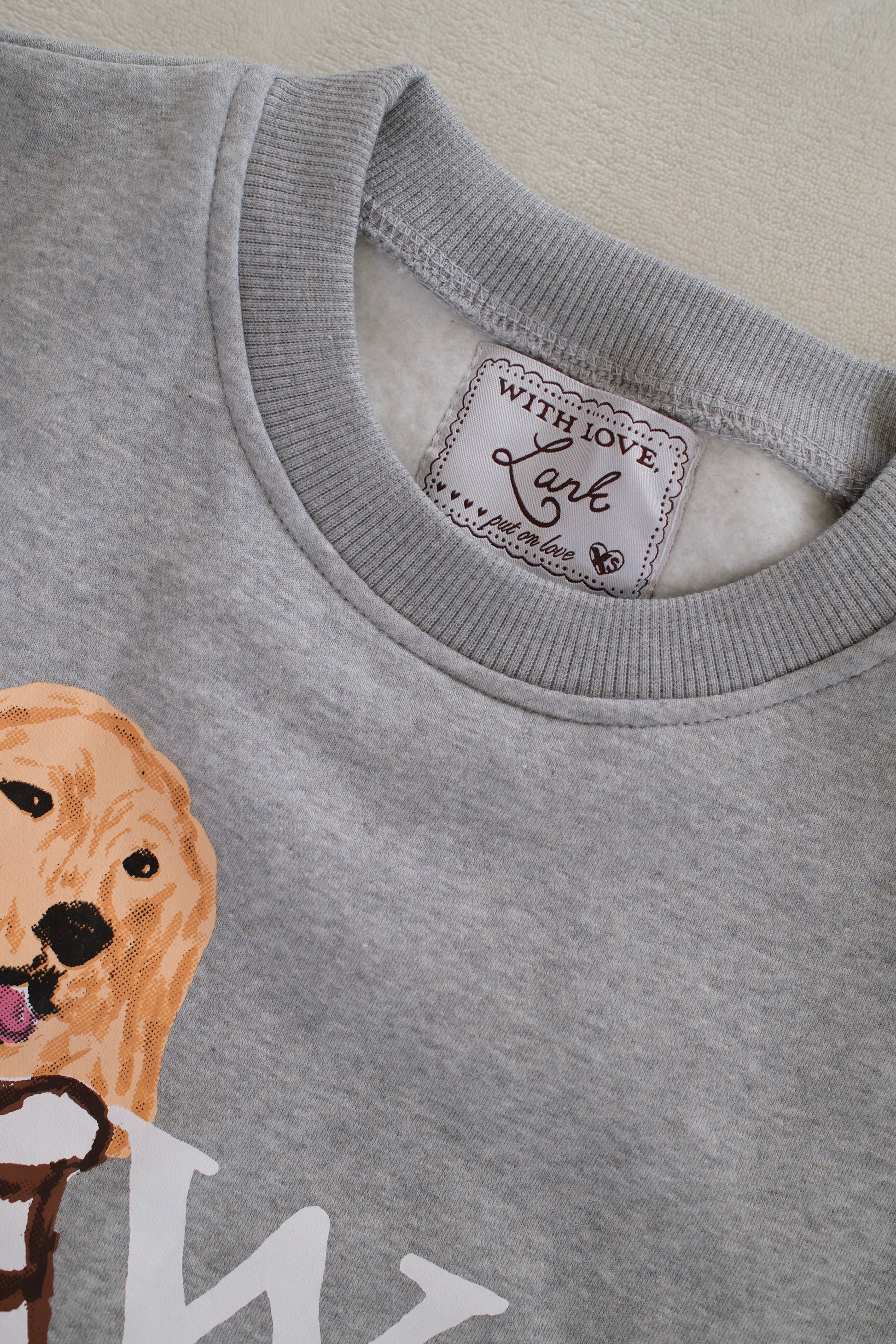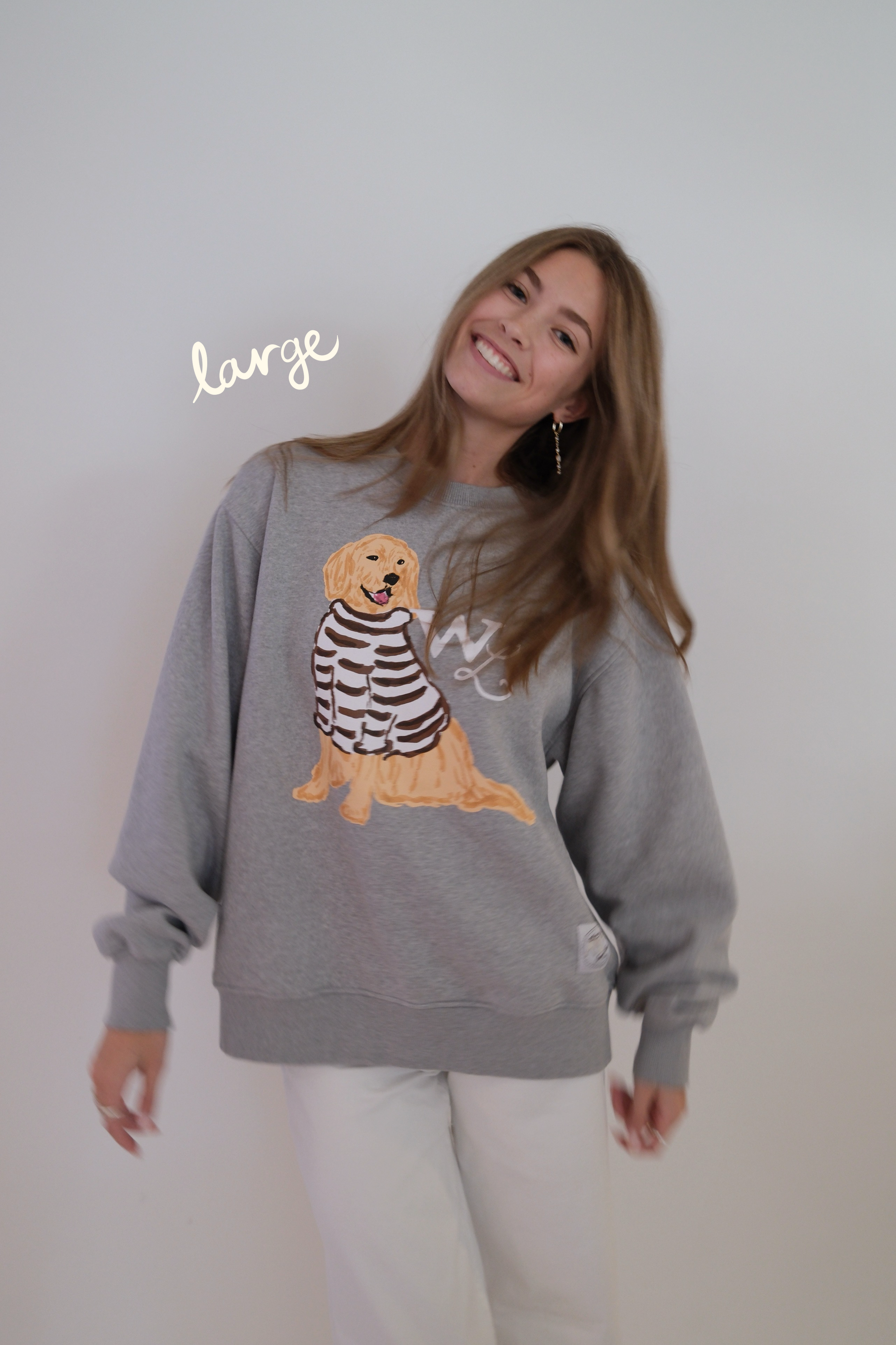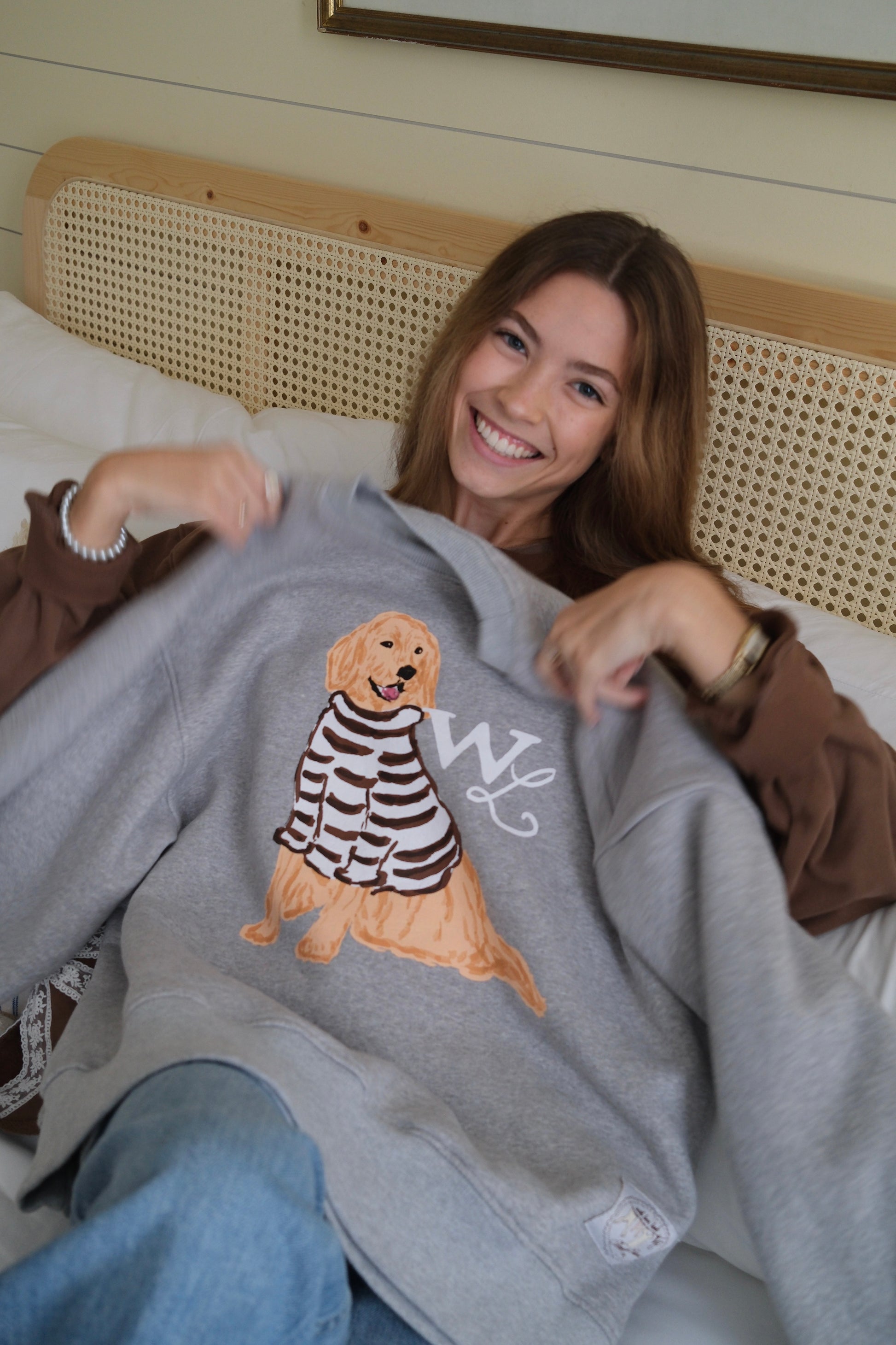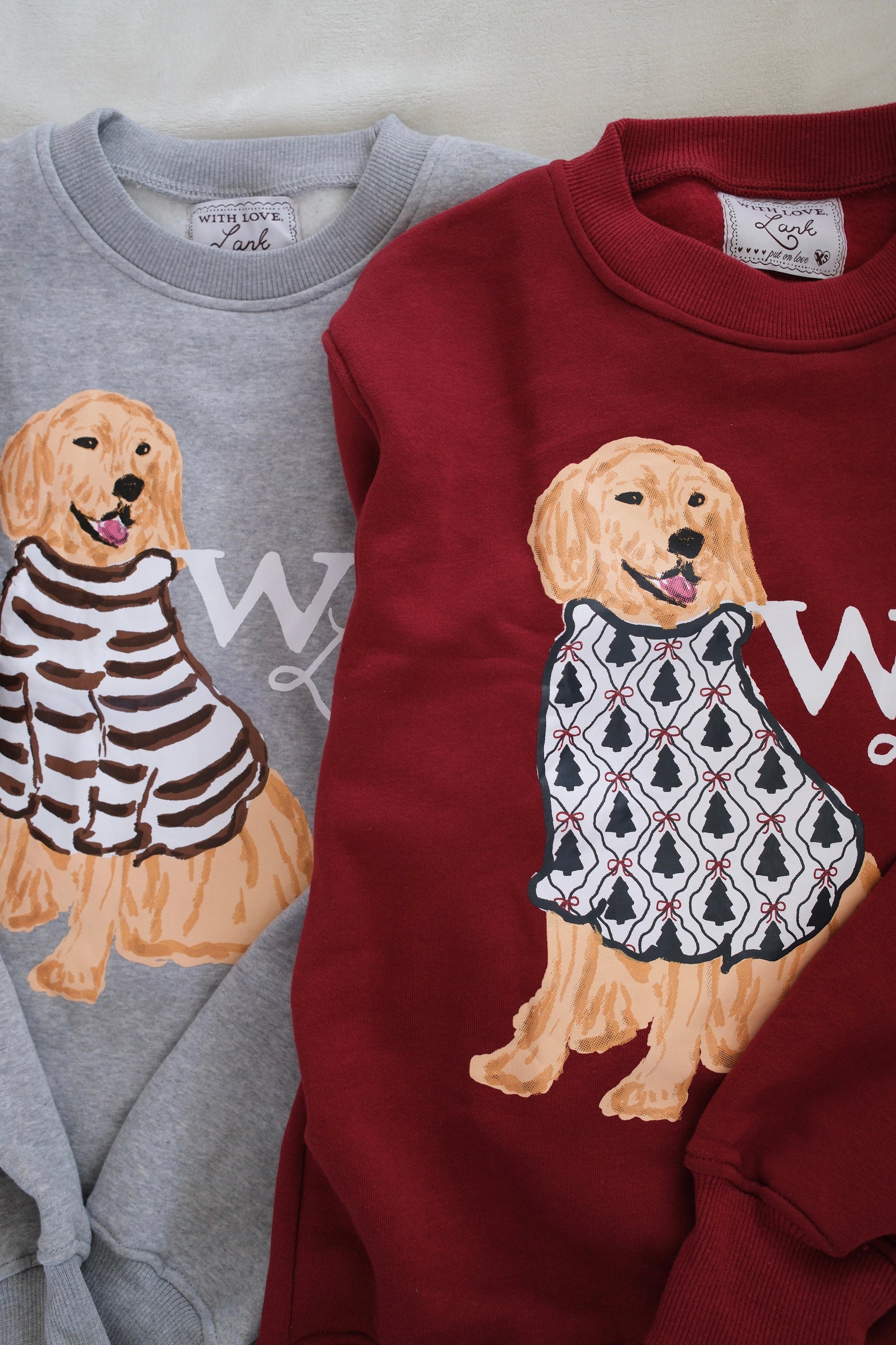 Set on a soft heathered grey base, Charlie the Golden sits front and center in his hand-drawn cocoa-striped sweater. The look is warm and nostalgic —a sweatshirt that feels like a favorite from the very first wear.