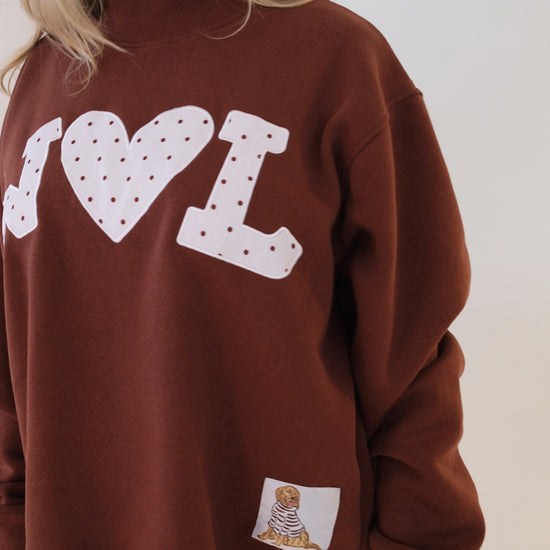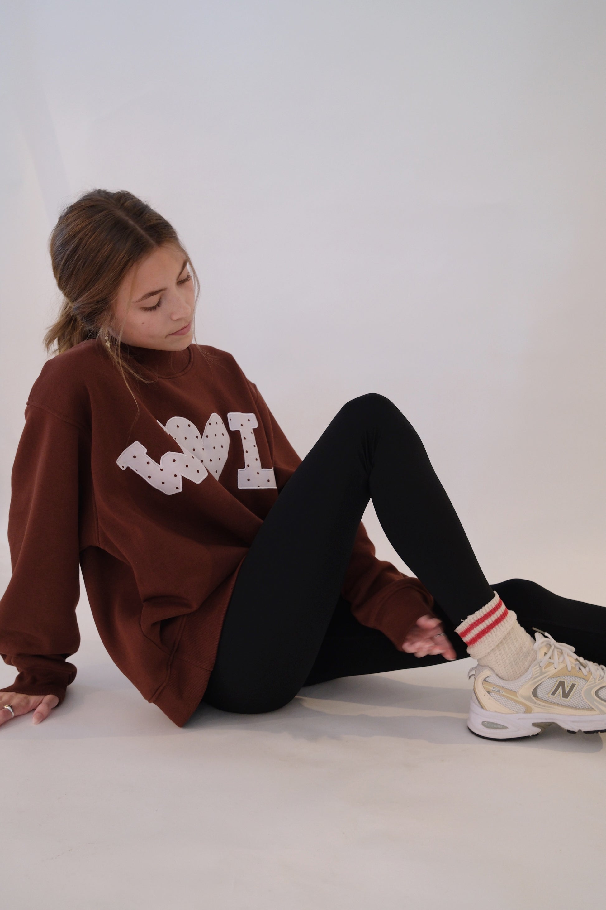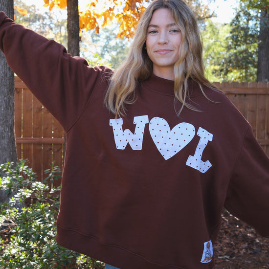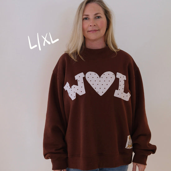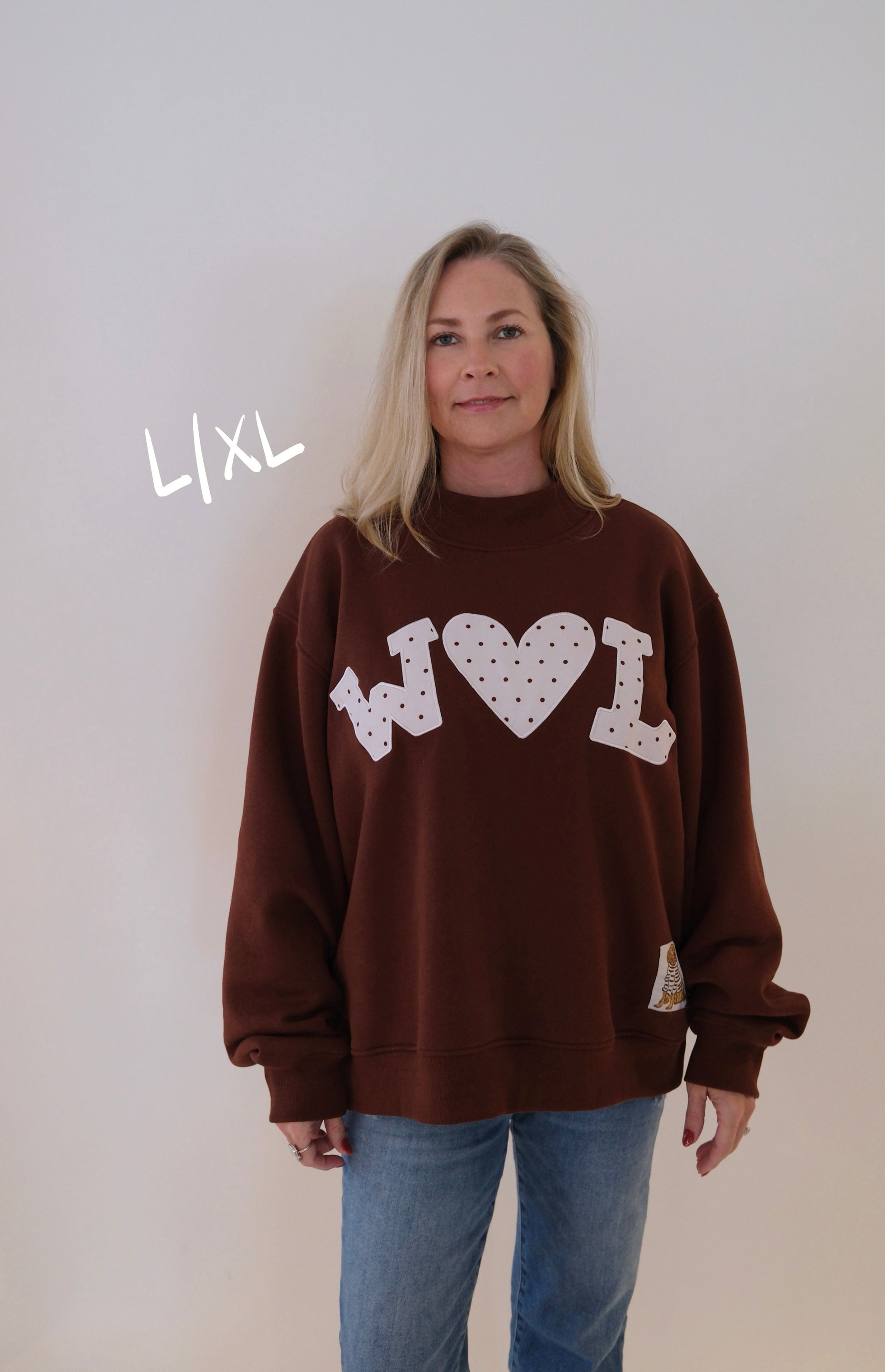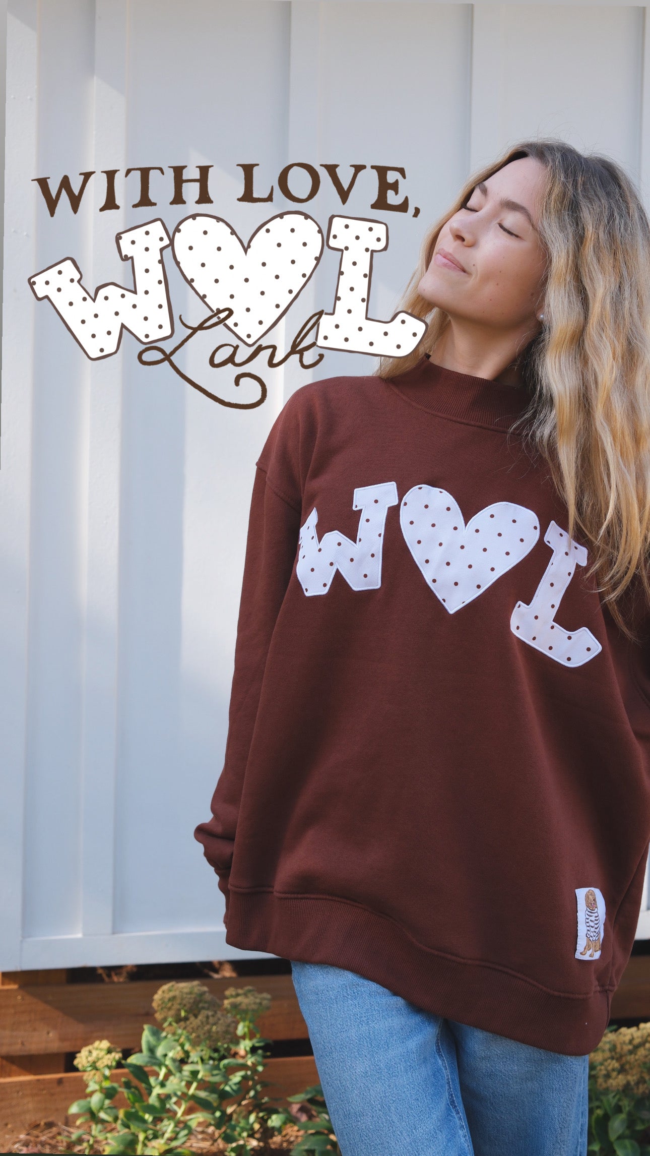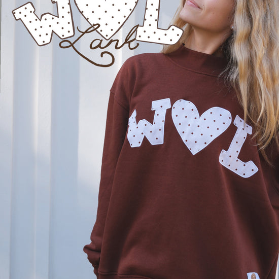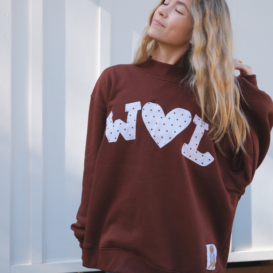 This rich brown mockneck features our signature W♥L appliqué in frosted polka dots for a playful, vintage-inspired touch. Crafted with a soft, comfortable feel and that slightly slouchy, lived-in fit WLL is known for.