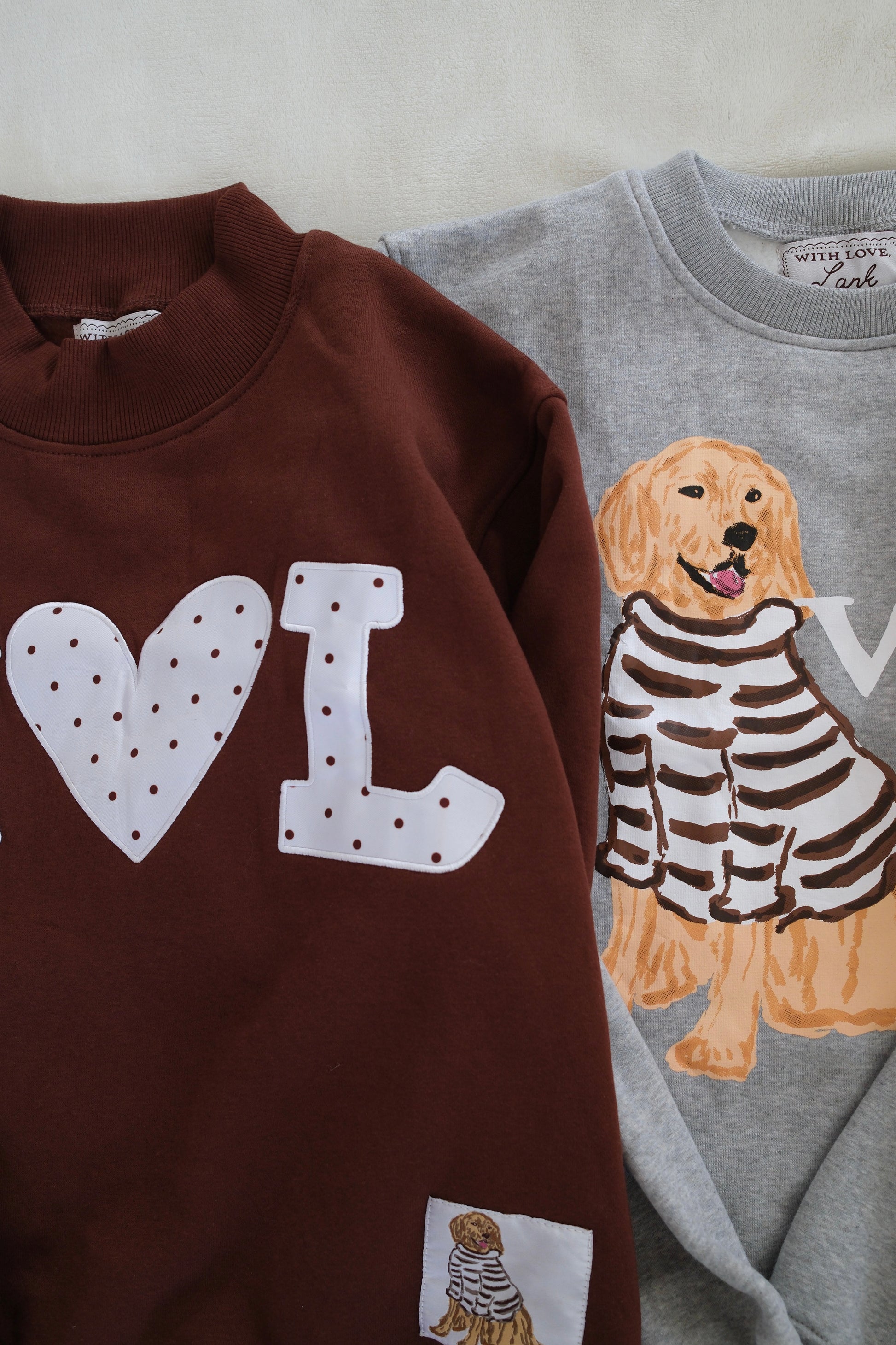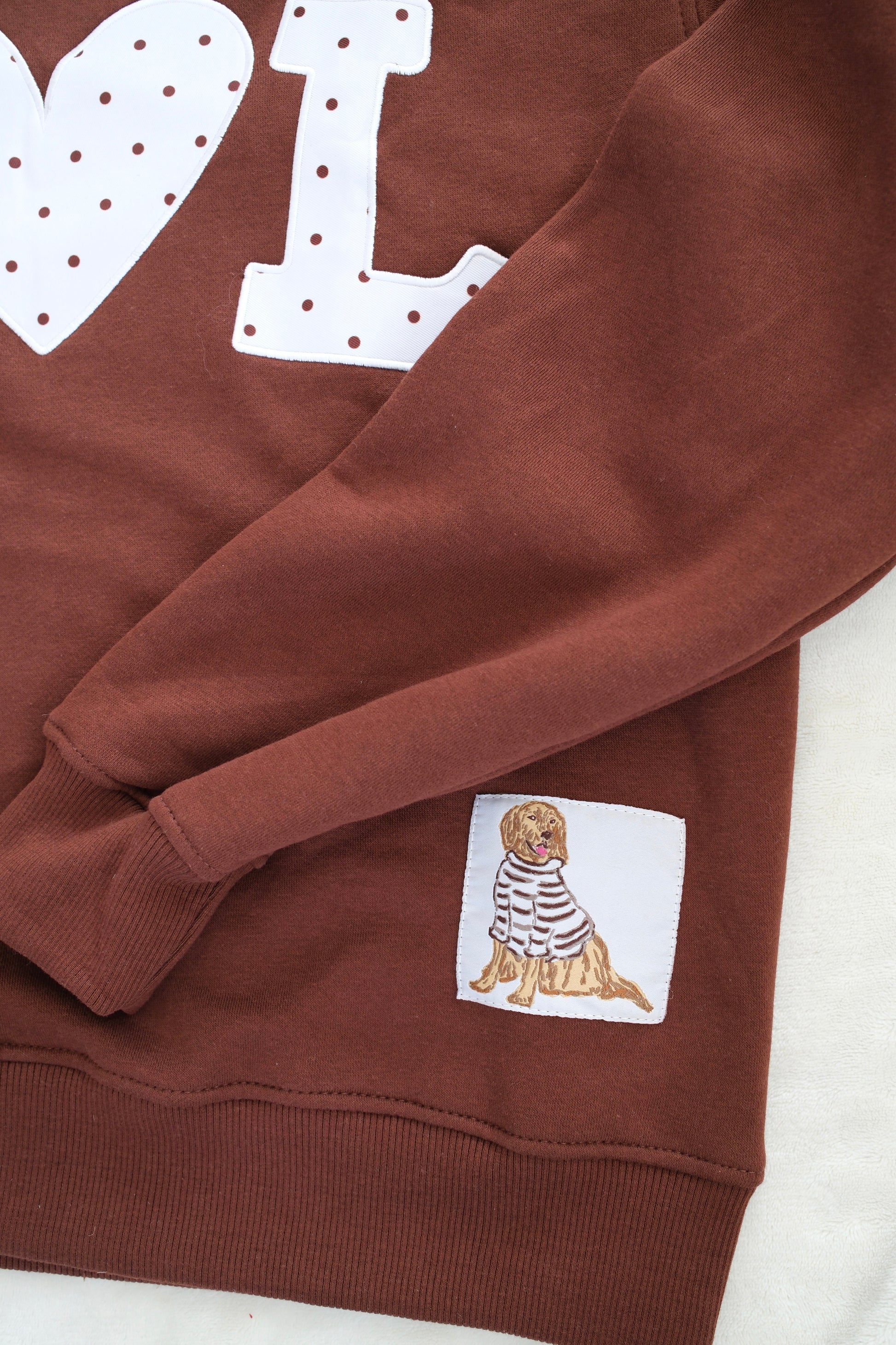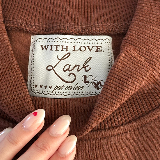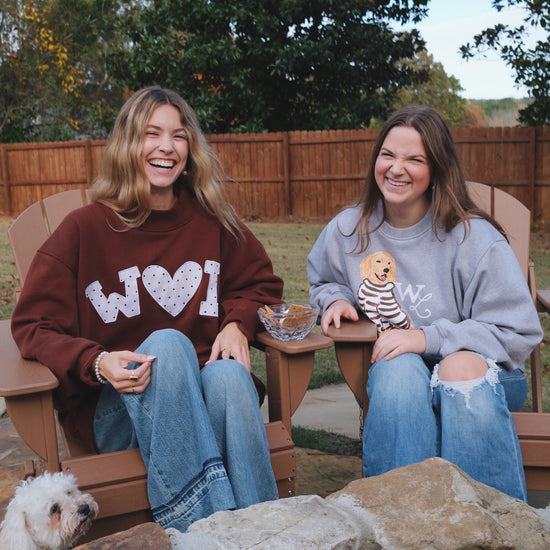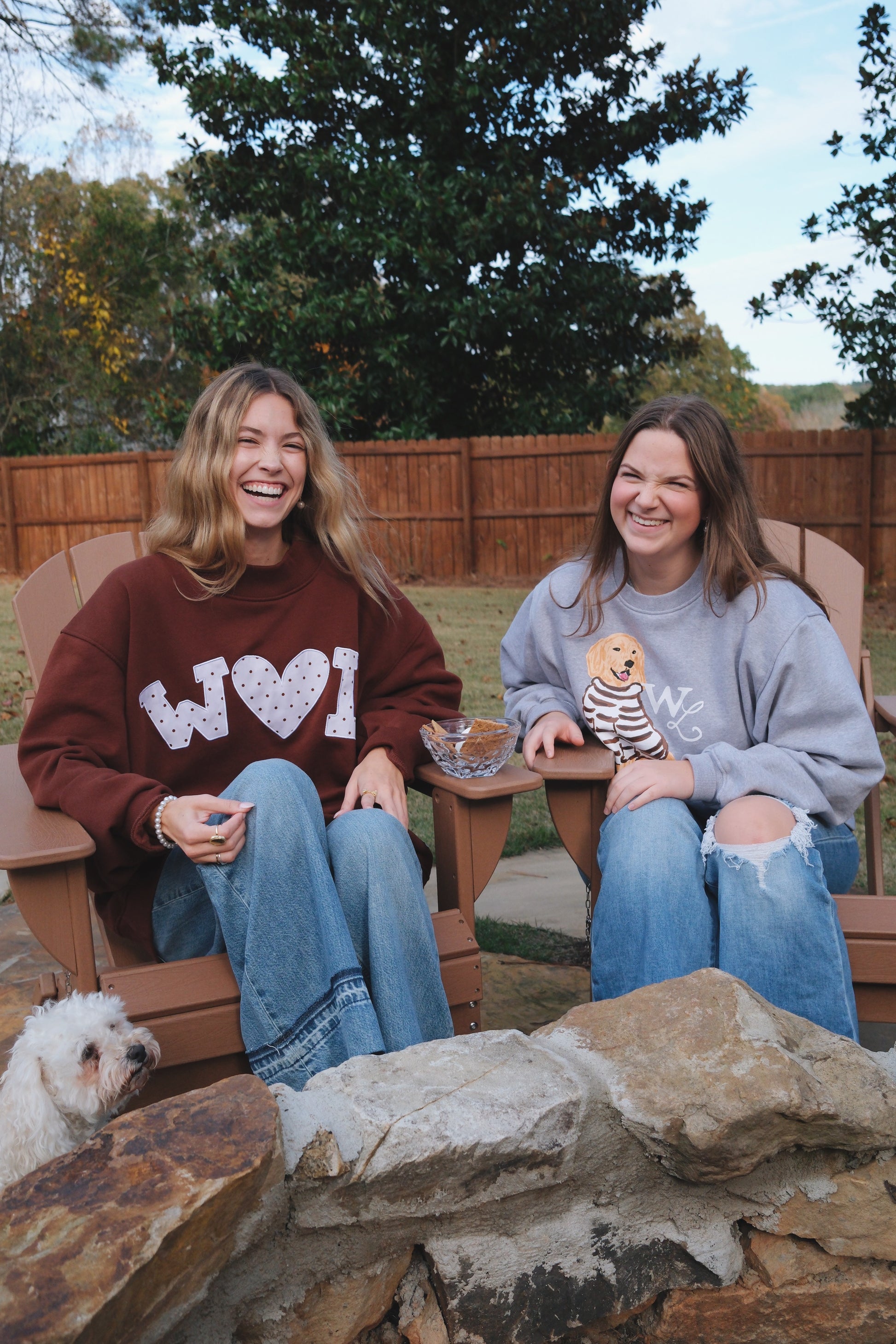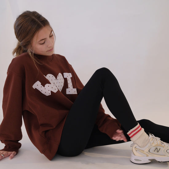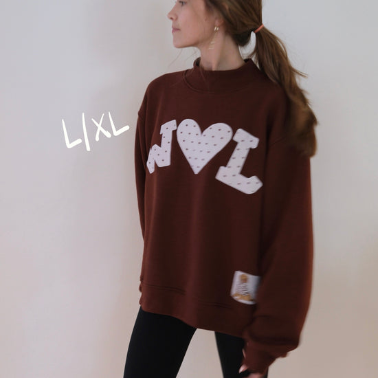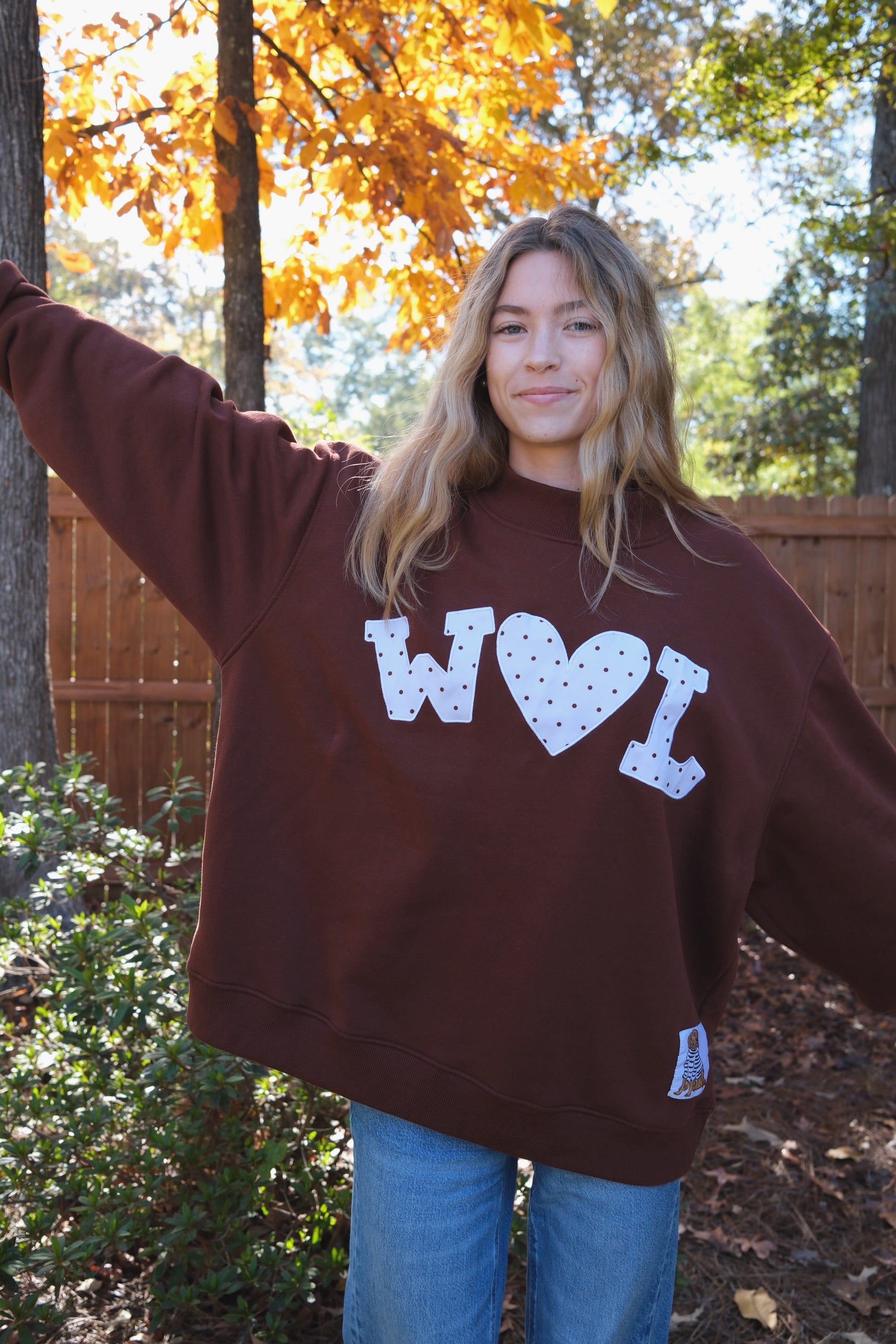 This rich brown mockneck features our signature W♥L appliqué in frosted polka dots for a playful, vintage-inspired touch. Crafted with a soft, comfortable feel and that slightly slouchy, lived-in fit WLL is known for.