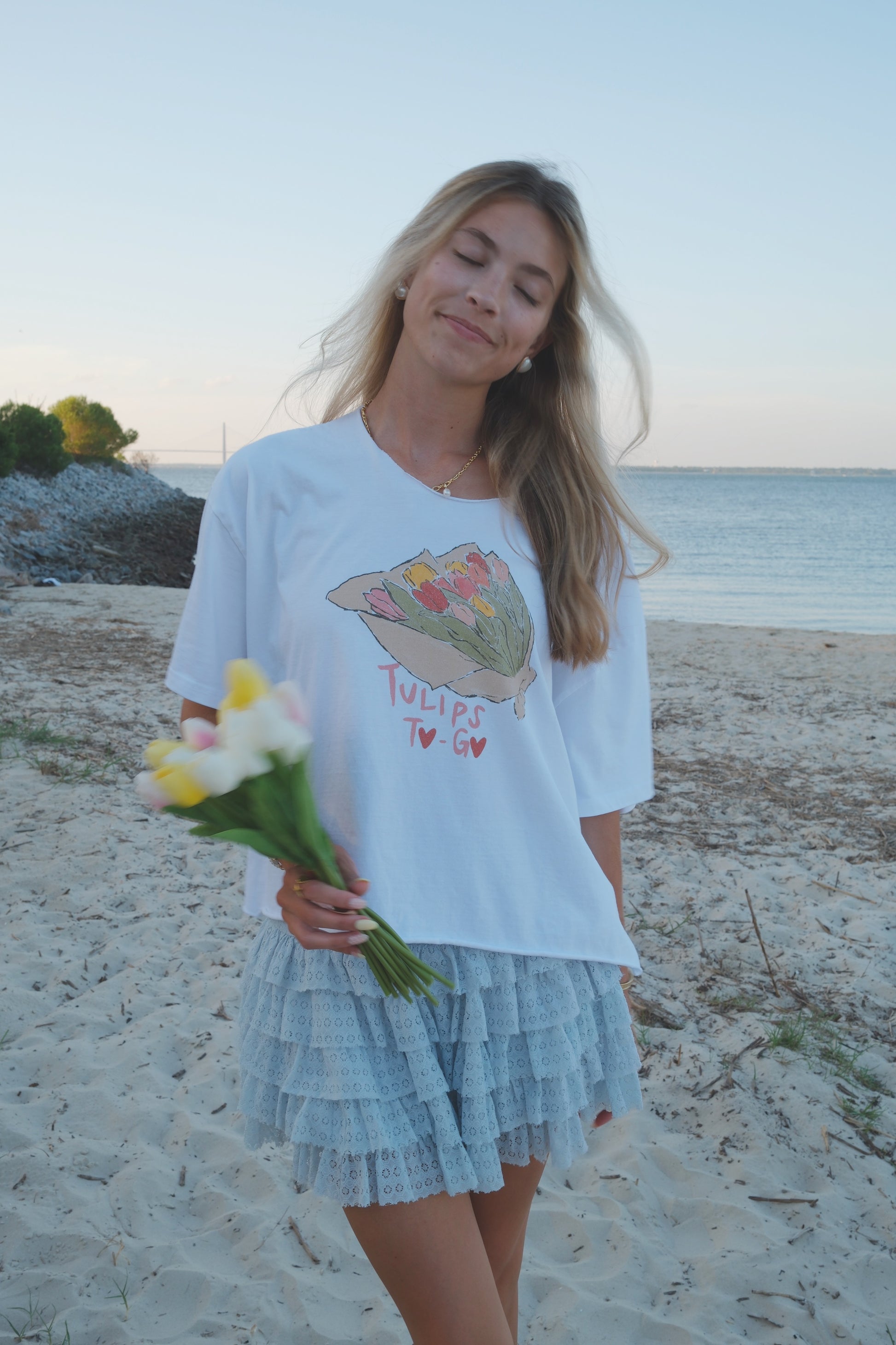 A bouquet you can wear. This tee features a hand-drawn tulip illustration inspired by our love for simple joys. Made with 100% cotton, it’s soft, oversized, and effortlessly charming—just like your favorite farmers market find. Pair it with your go-to denim or a frilly skirt for that “picked these on the way here” look.