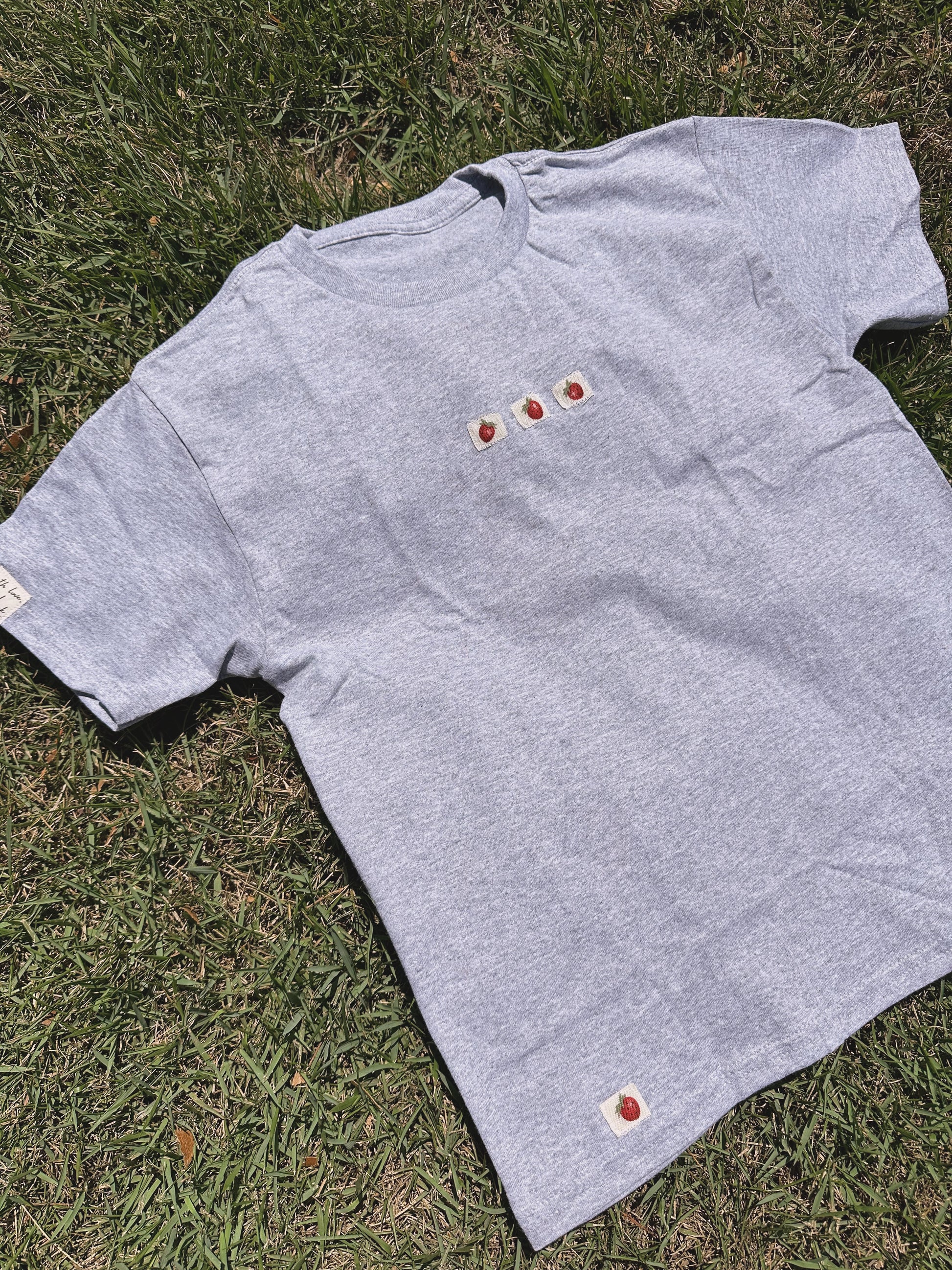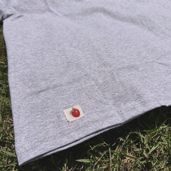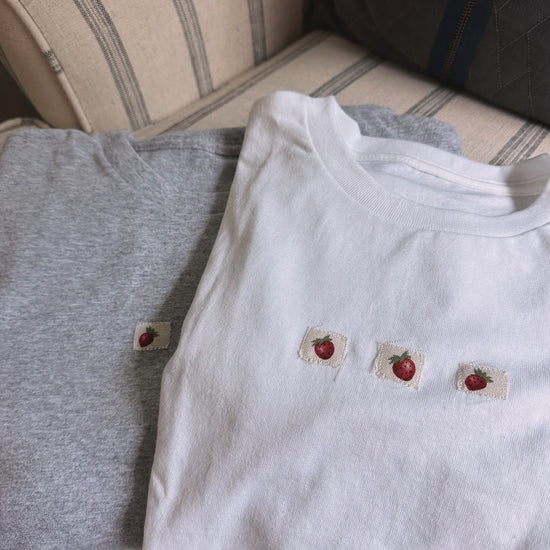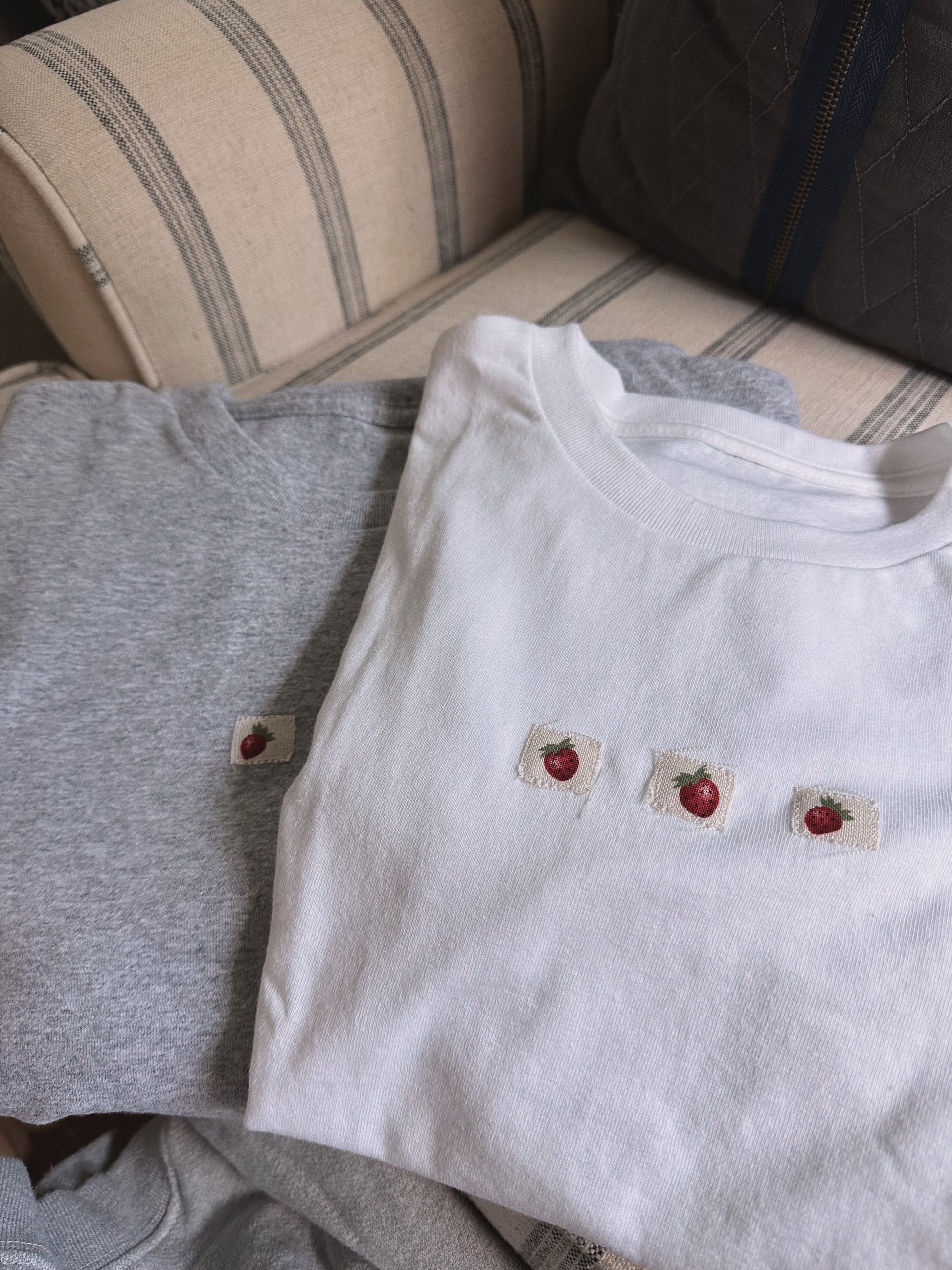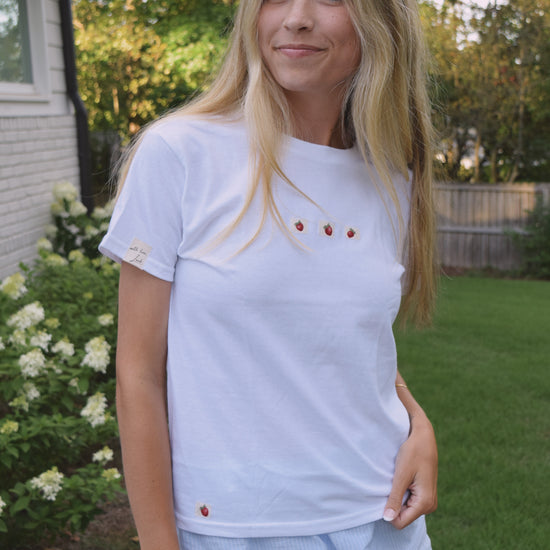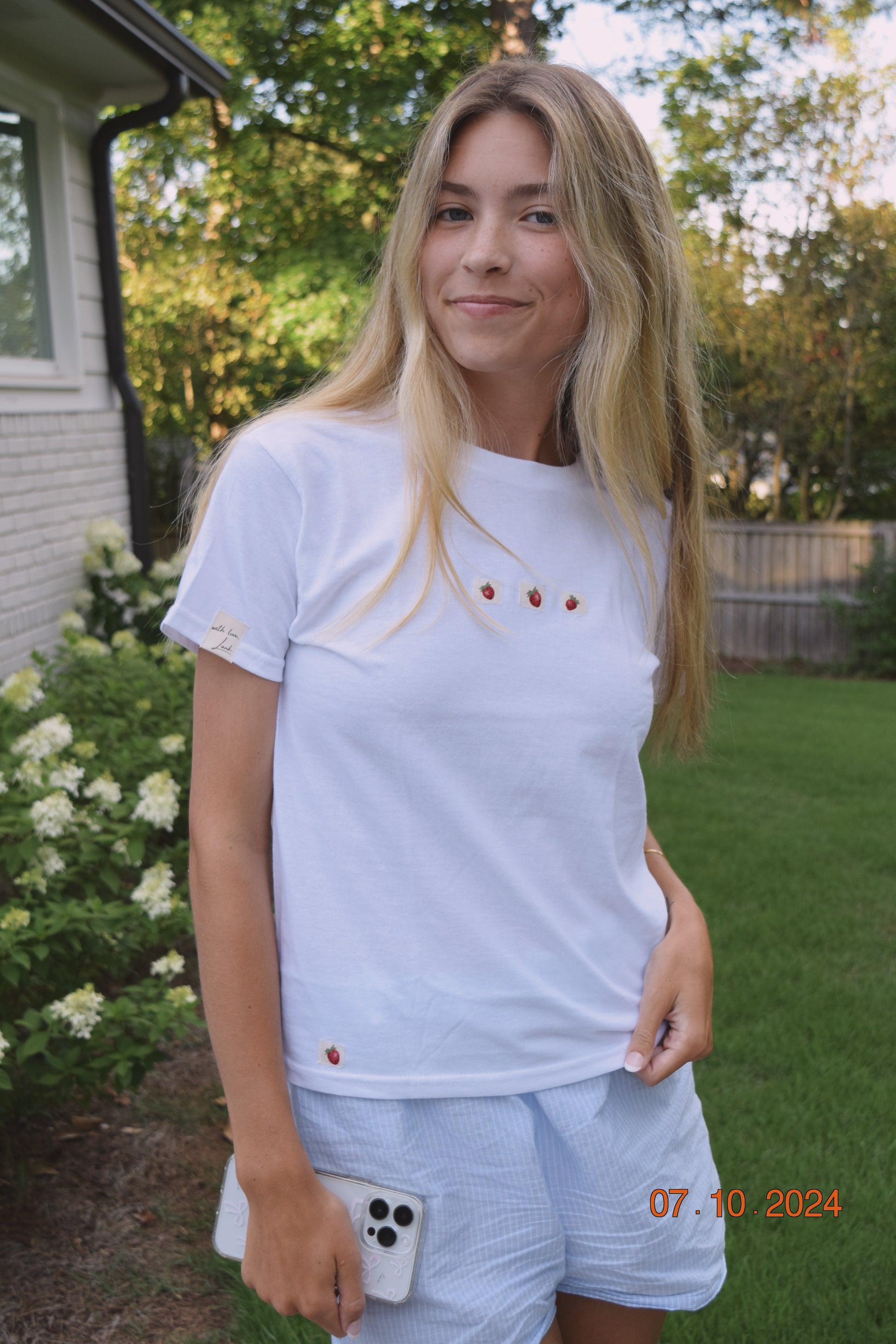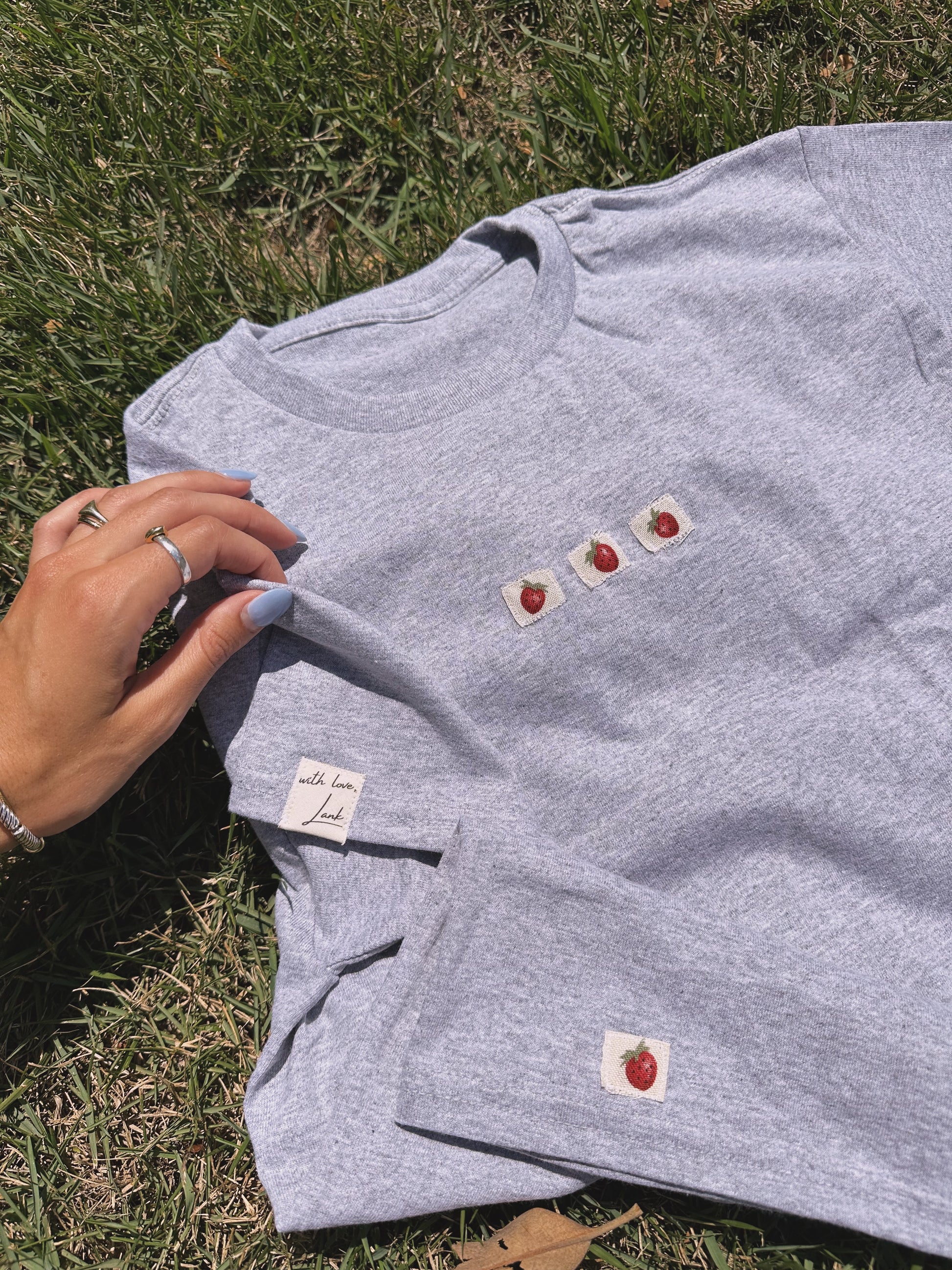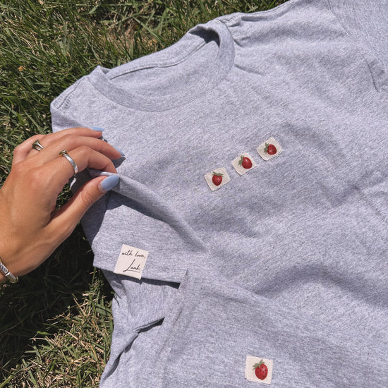 The strawberry tee is HERE! In this baby tee styled piece, strawberry patches have been carefully sewn onto the tee both in the center and bottom corner. The signature With love, Lank tag lays on the right sleeve and compliments any outfit. Say hello to your new summer picnic tee๐