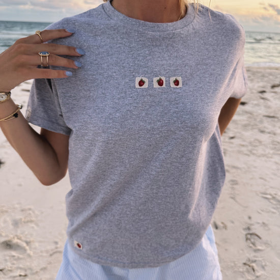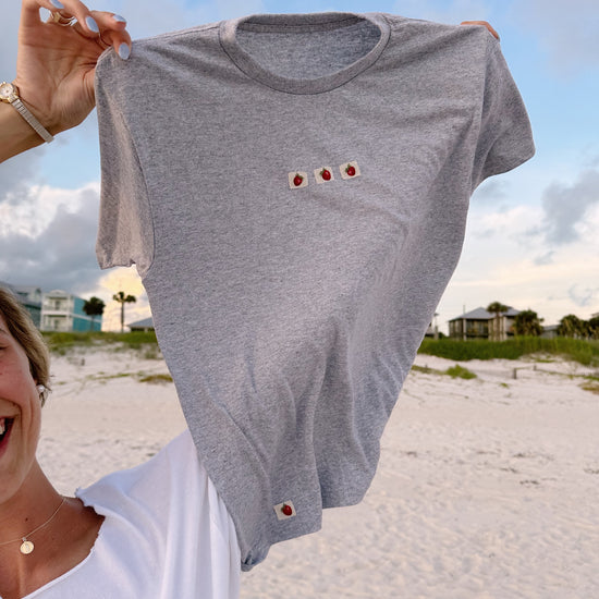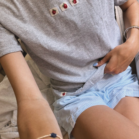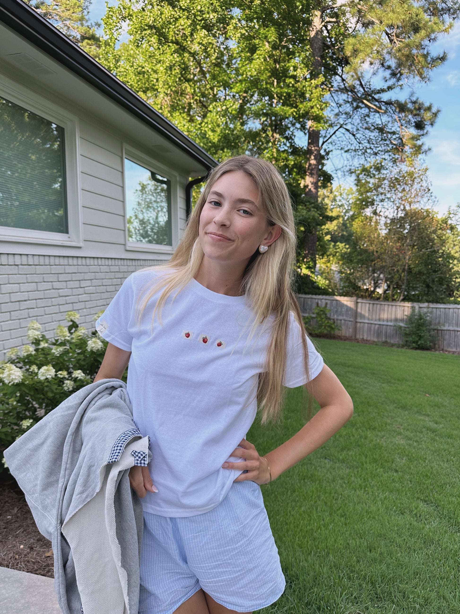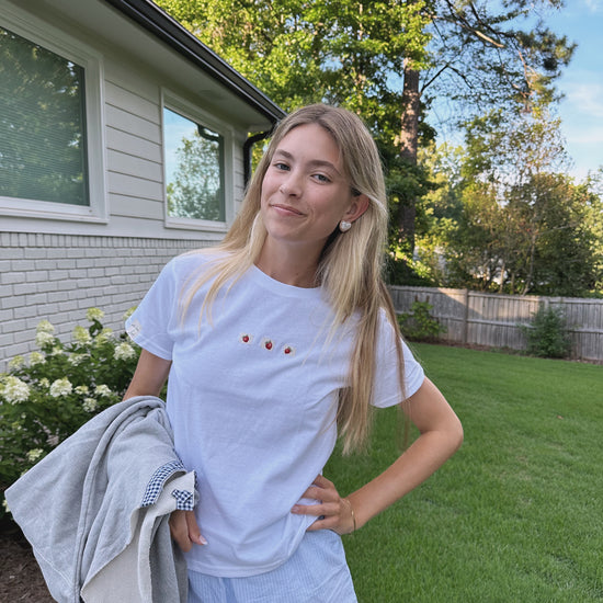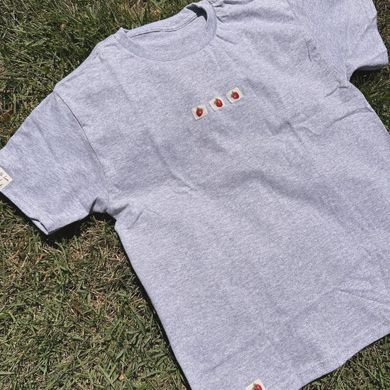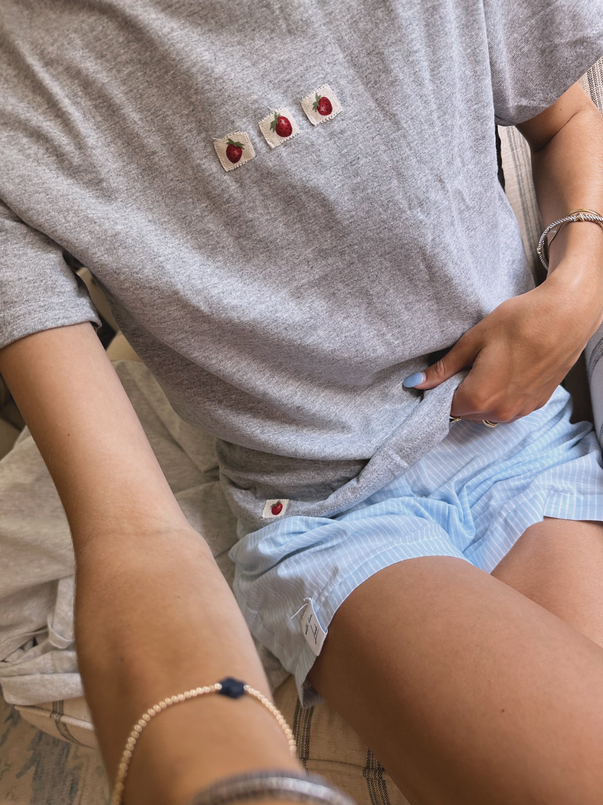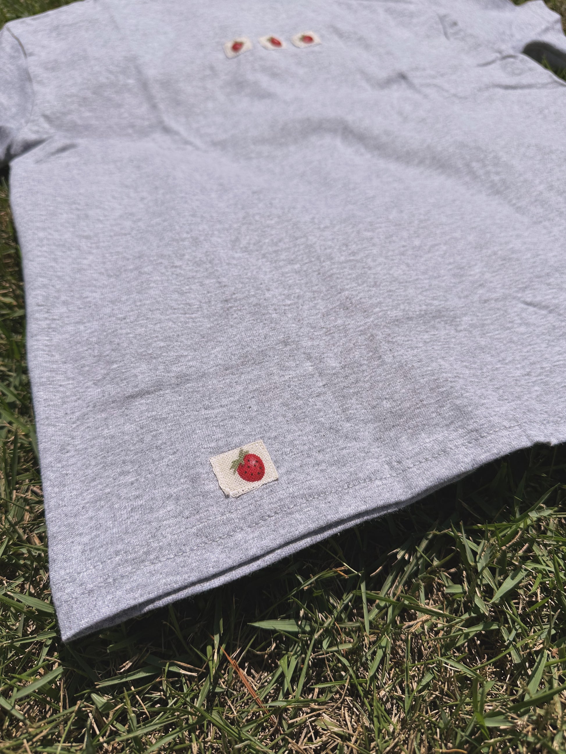 The strawberry tee is HERE! In this baby tee styled piece, strawberry patches have been carefully sewn onto the tee both in the center and bottom corner. The signature With love, Lank tag lays on the right sleeve and compliments any outfit. Say hello to your new summer picnic tee๐