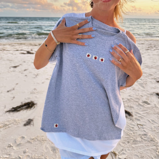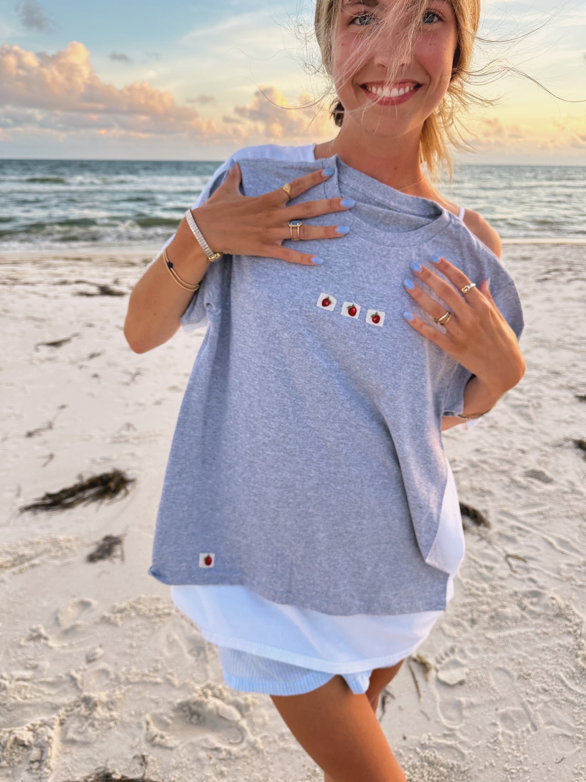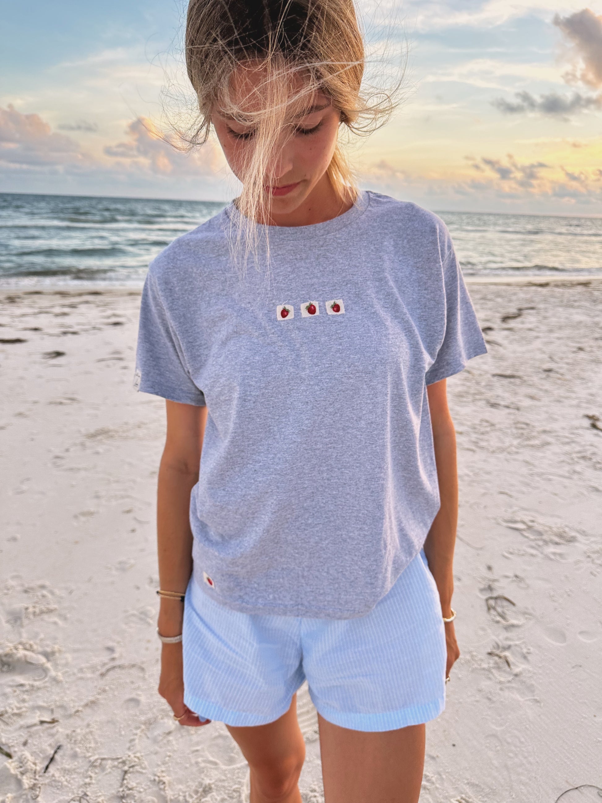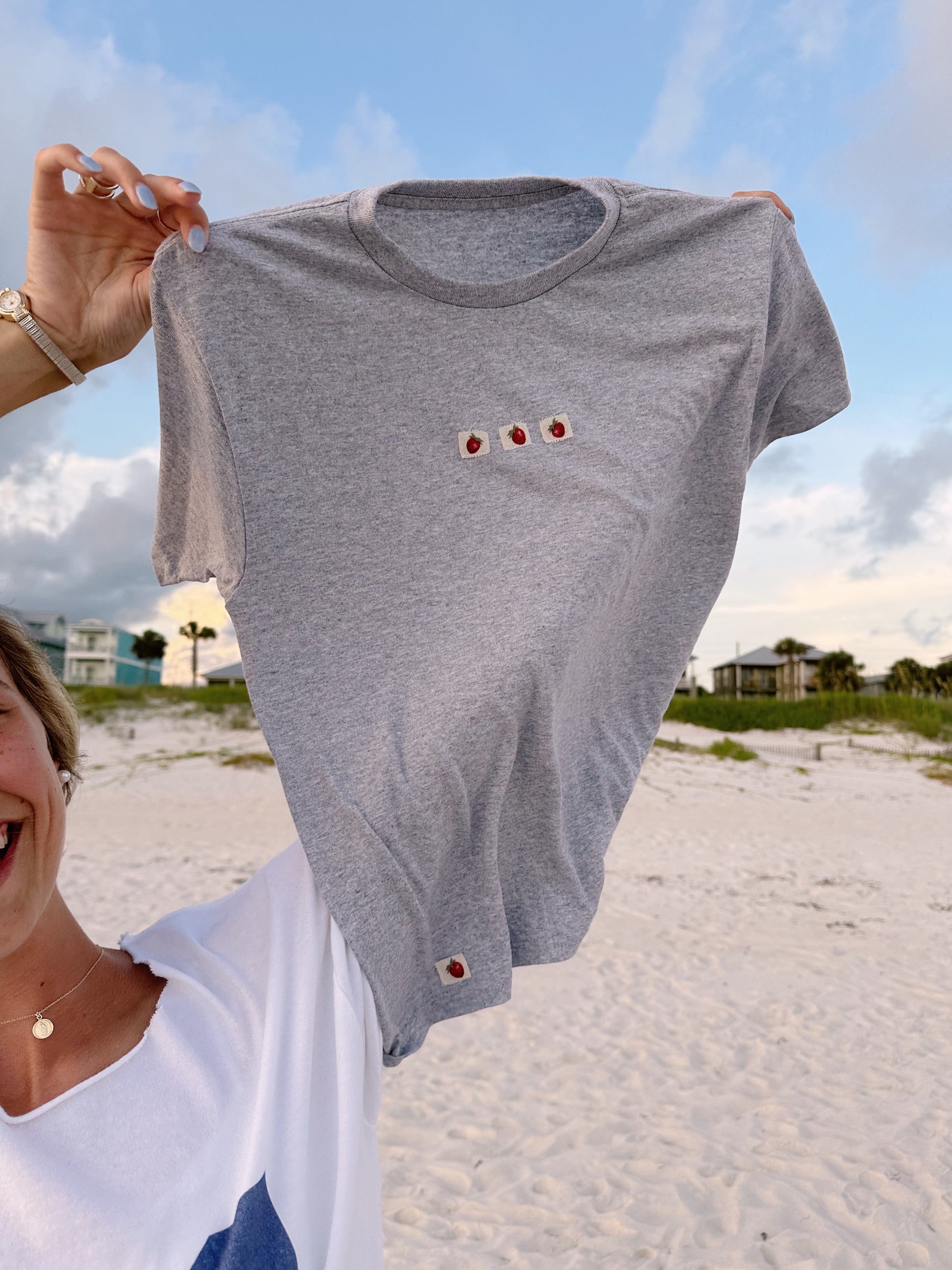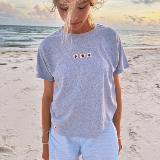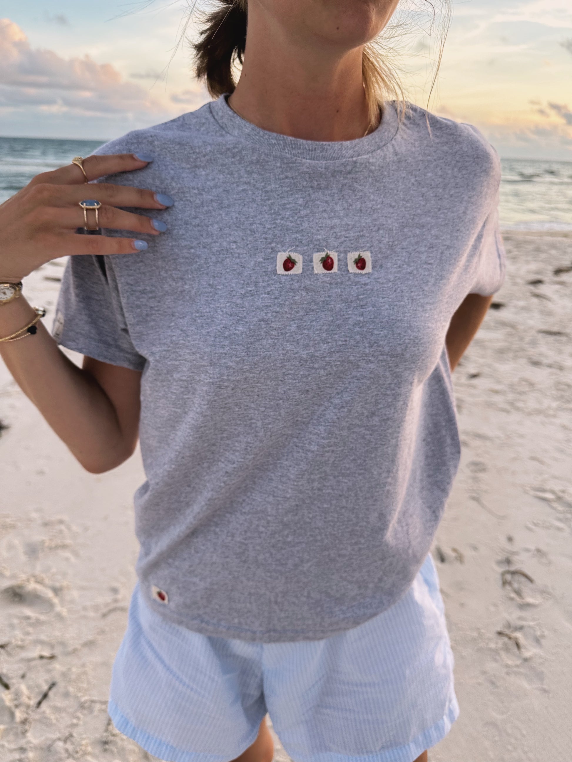 The strawberry tee is HERE! In this baby tee styled piece, strawberry patches have been carefully sewn onto the tee both in the center and bottom corner. The signature With love, Lank tag lays on the right sleeve and compliments any outfit. Say hello to your new summer picnic tee๐
