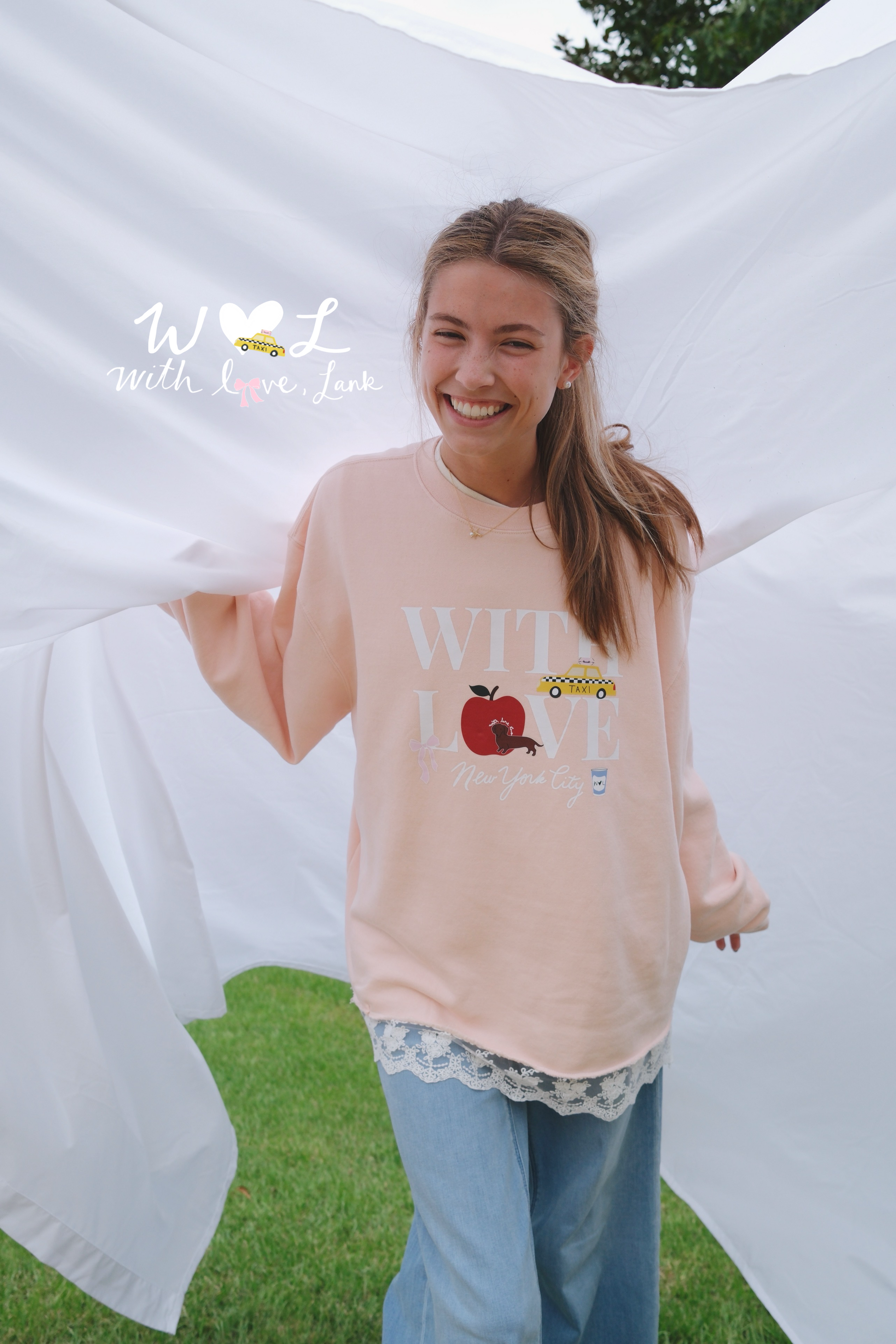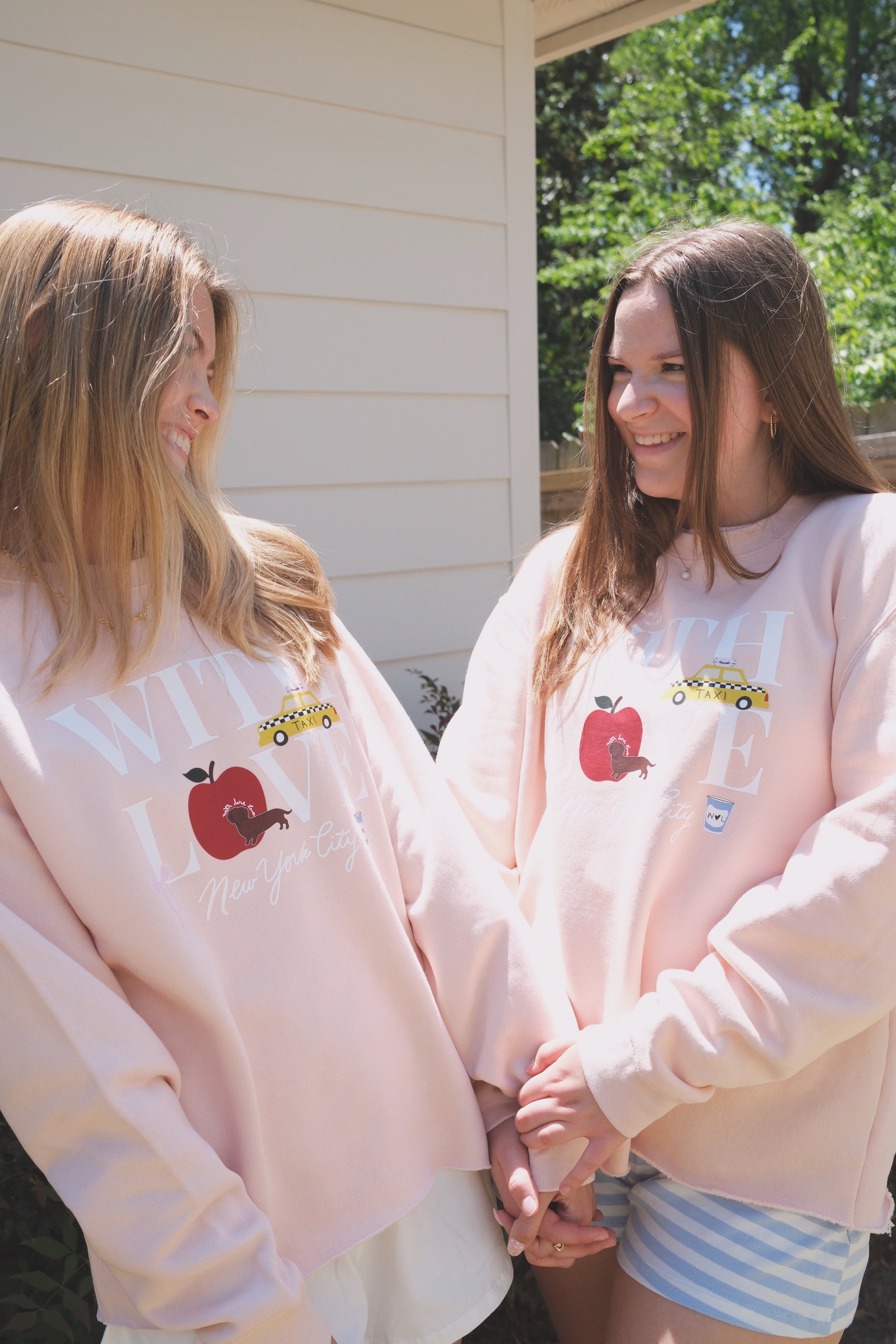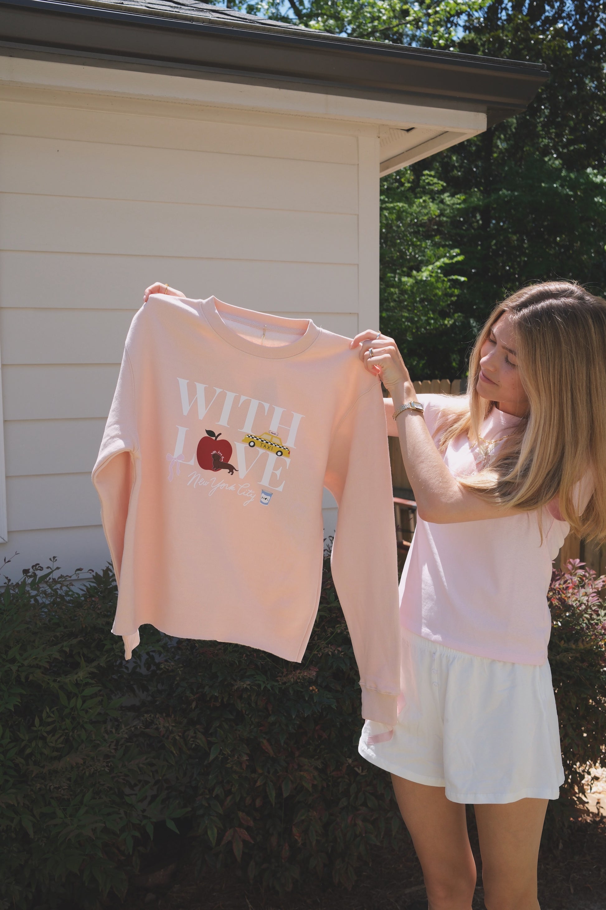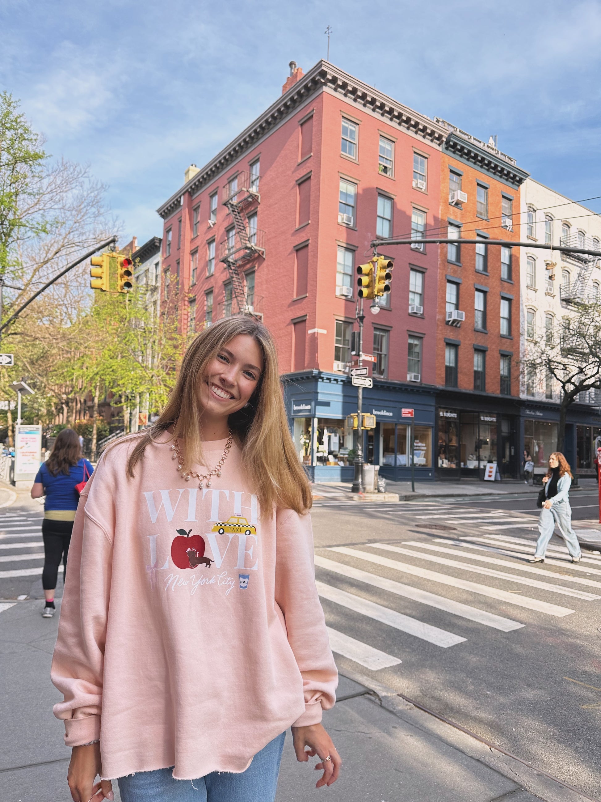 As a part of the With Love Destination Collection, the With Love NYC Crewneck incorporates icons of the city in a cozy, subtle way. Hand drawn by Claire Lank, this design is one of a kind! The soft pink pairs nicely with just about any outfit!