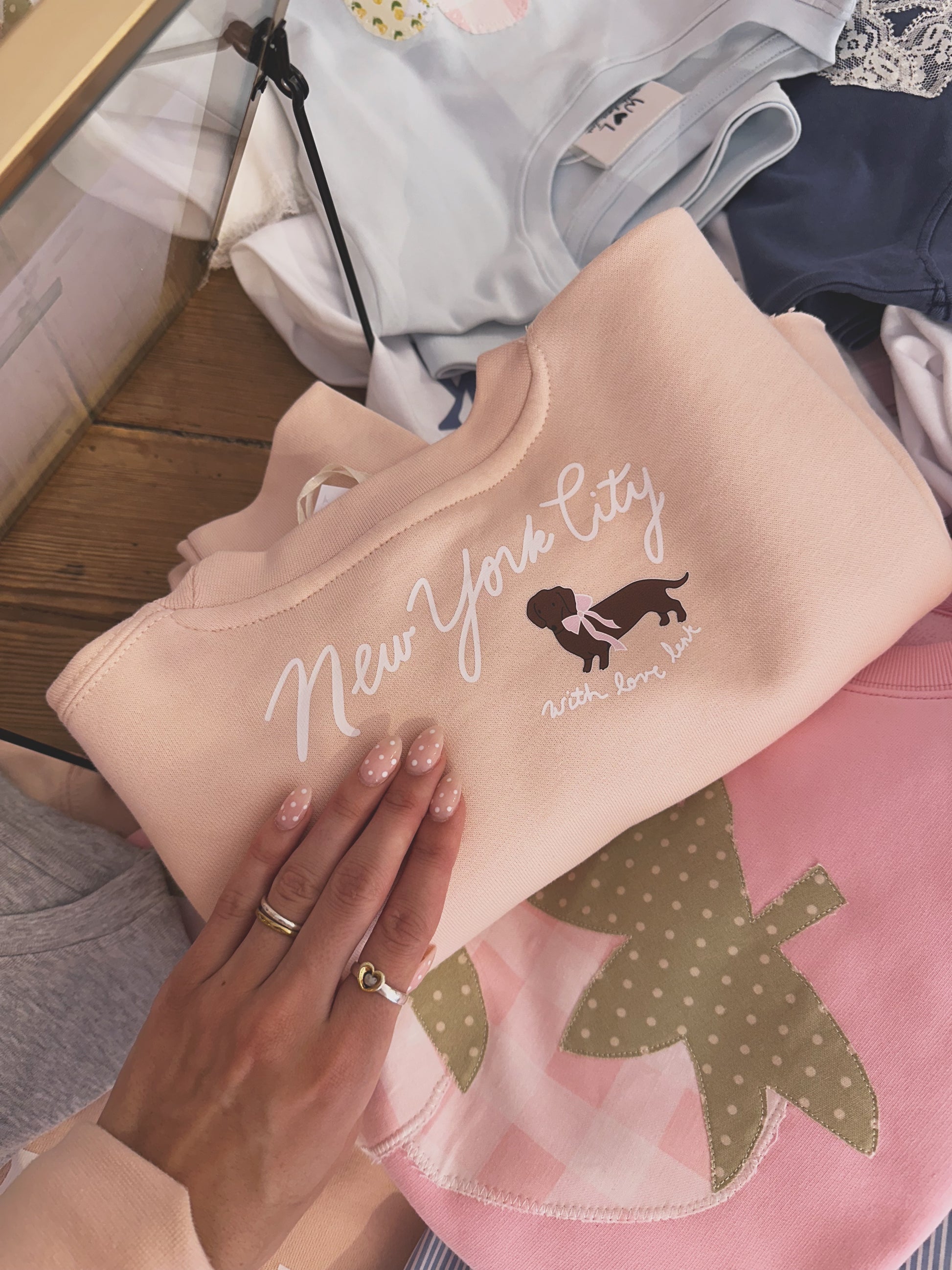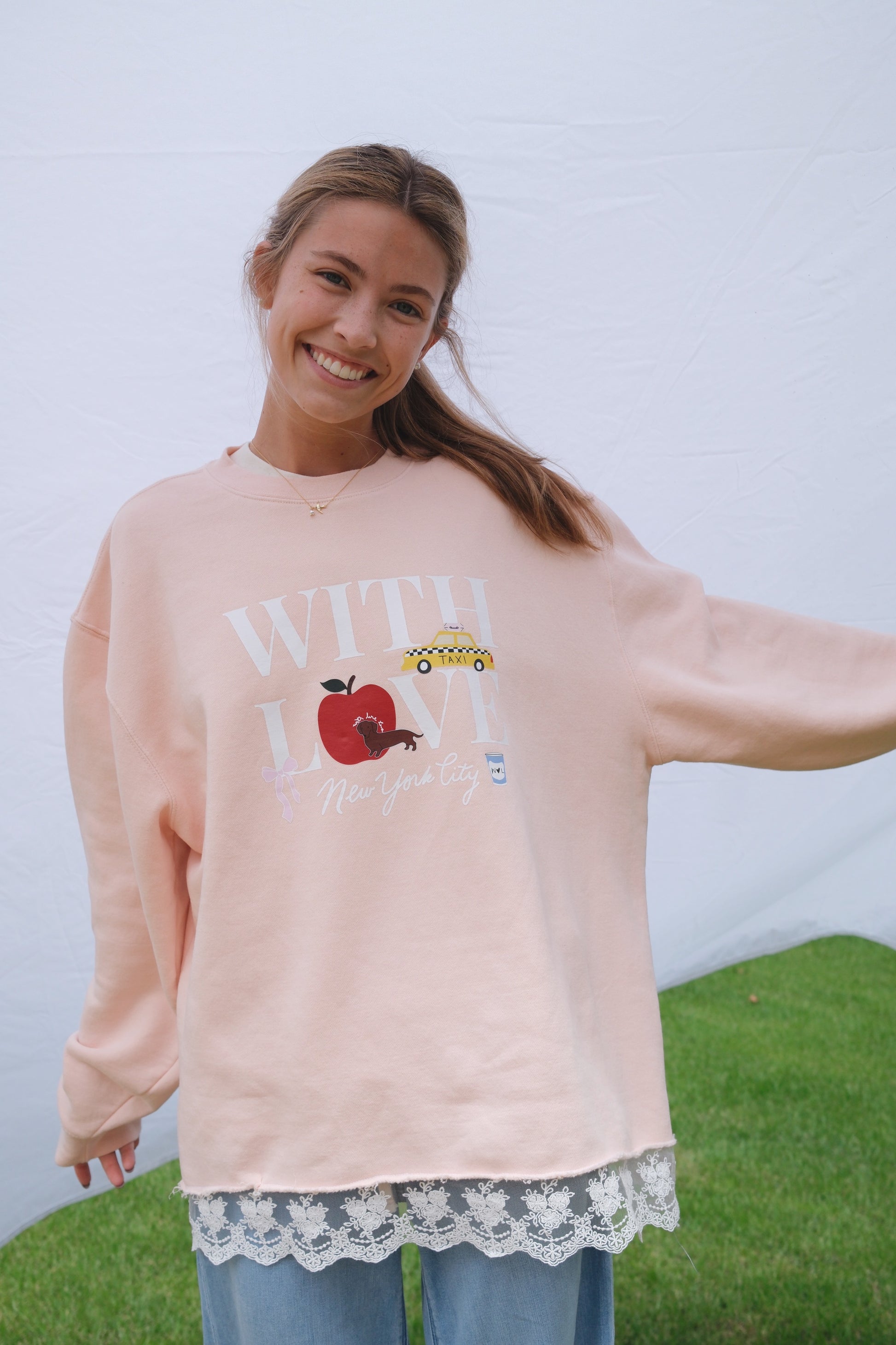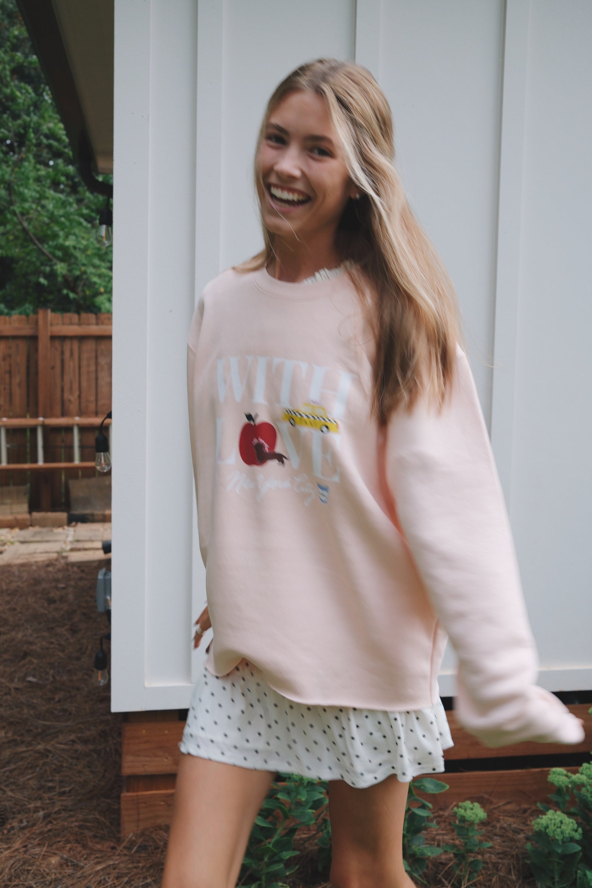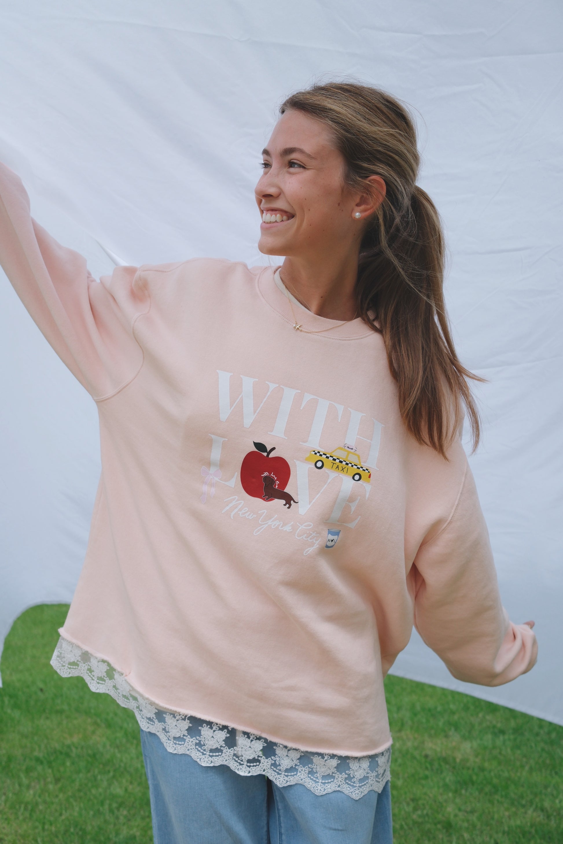 As a part of the With Love Destination Collection, the With Love NYC Crewneck incorporates icons of the city in a cozy, subtle way. Hand drawn by Claire Lank, this design is one of a kind! The soft pink pairs nicely with just about any outfit!