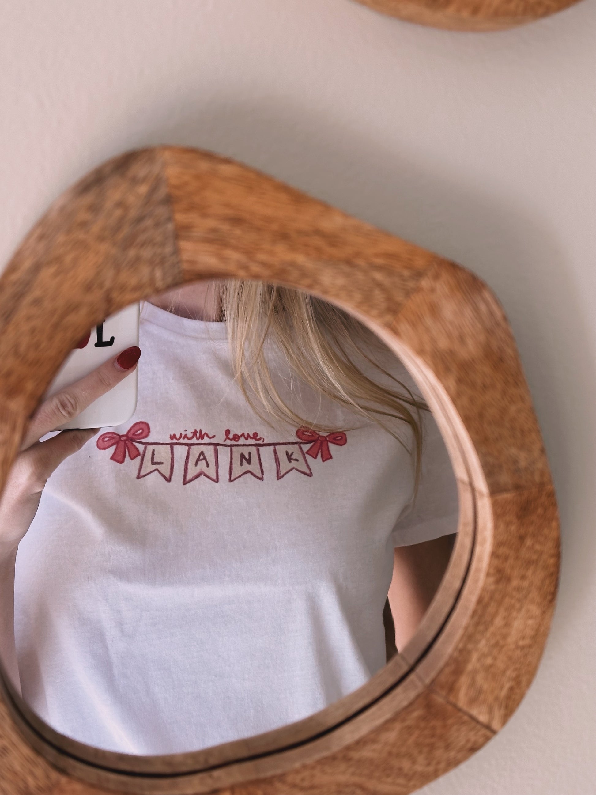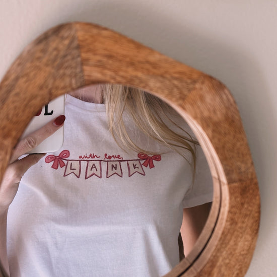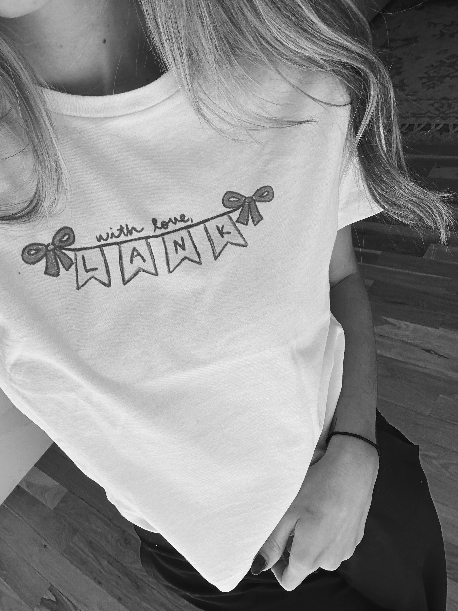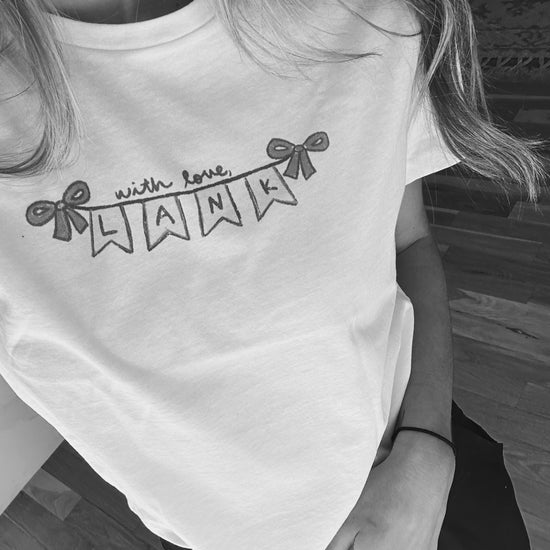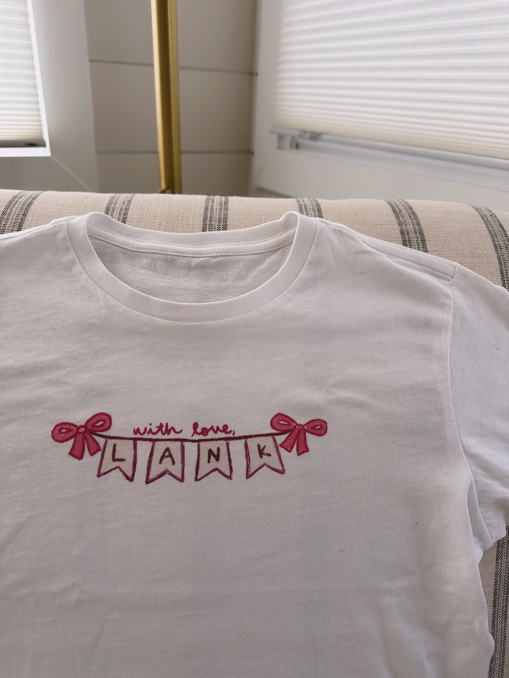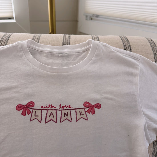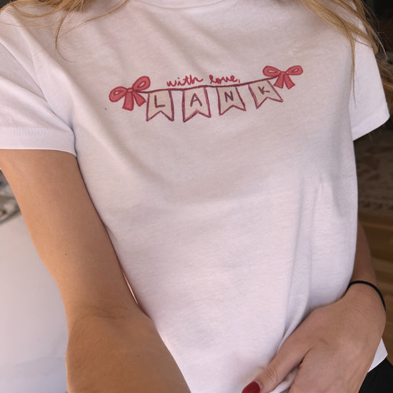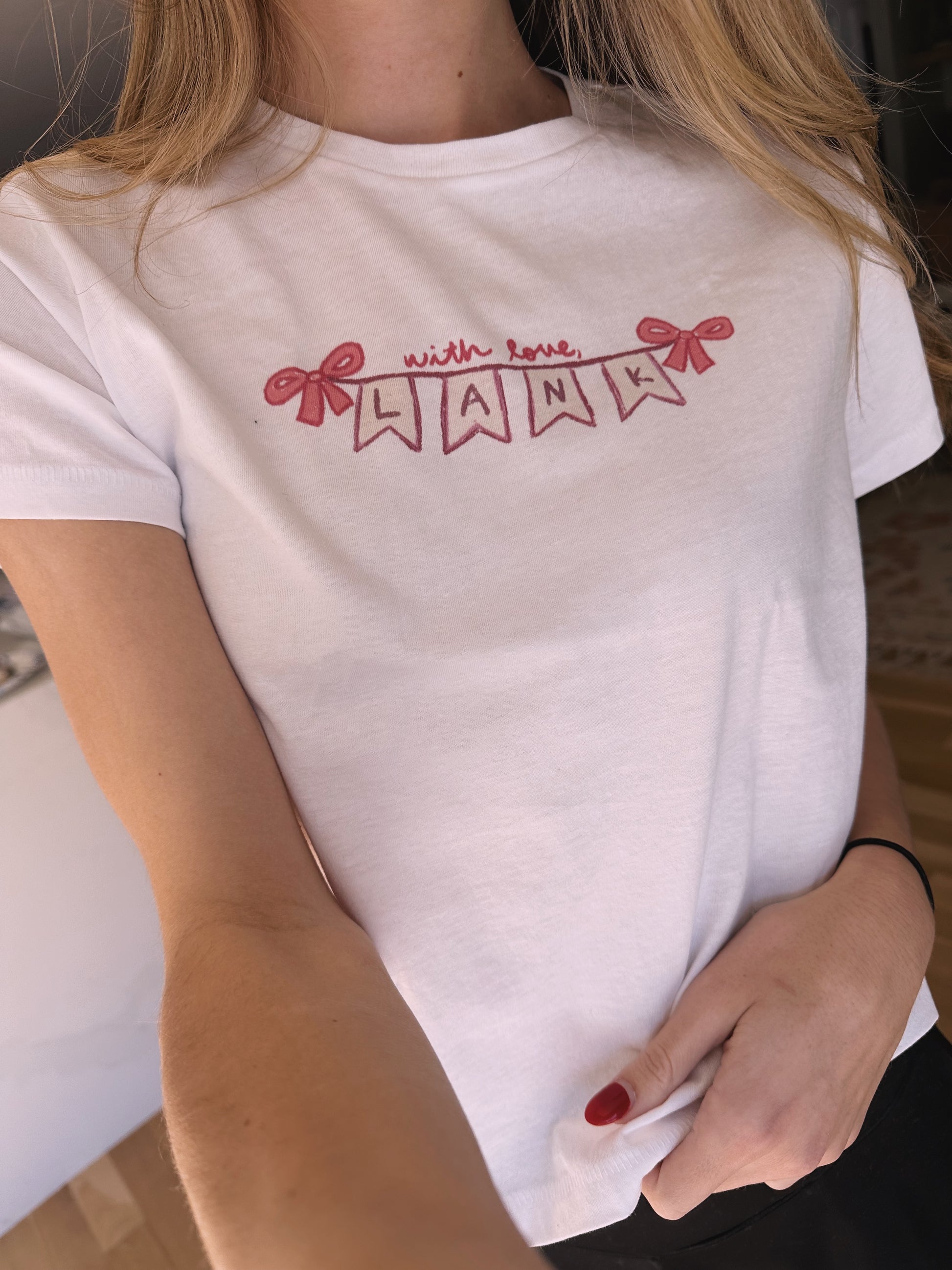Featured on this lightweight tee is a hand drawn "With love, Lank" banner. Rep WLL and a subtle Valentine design in this high waisted tee!